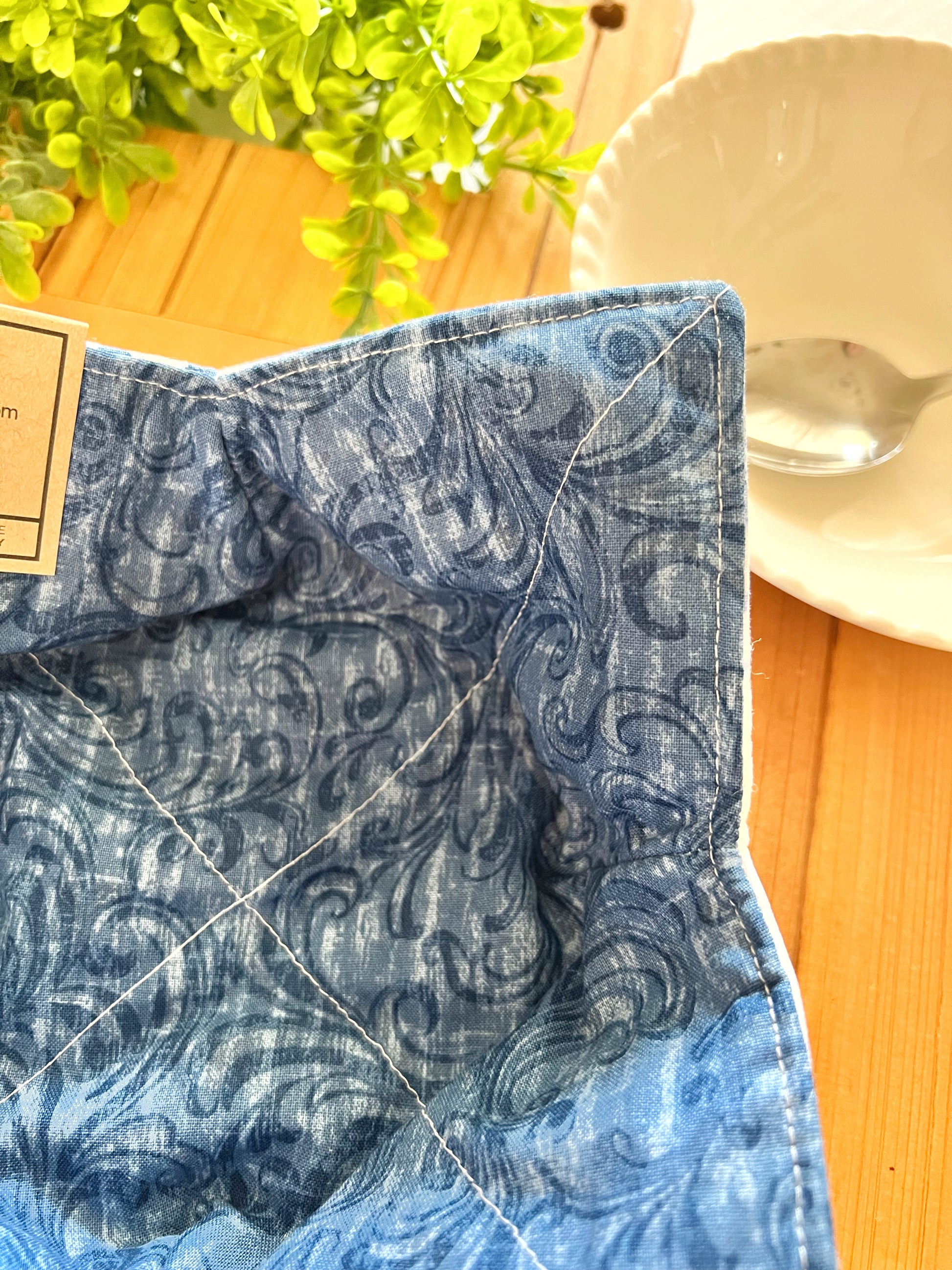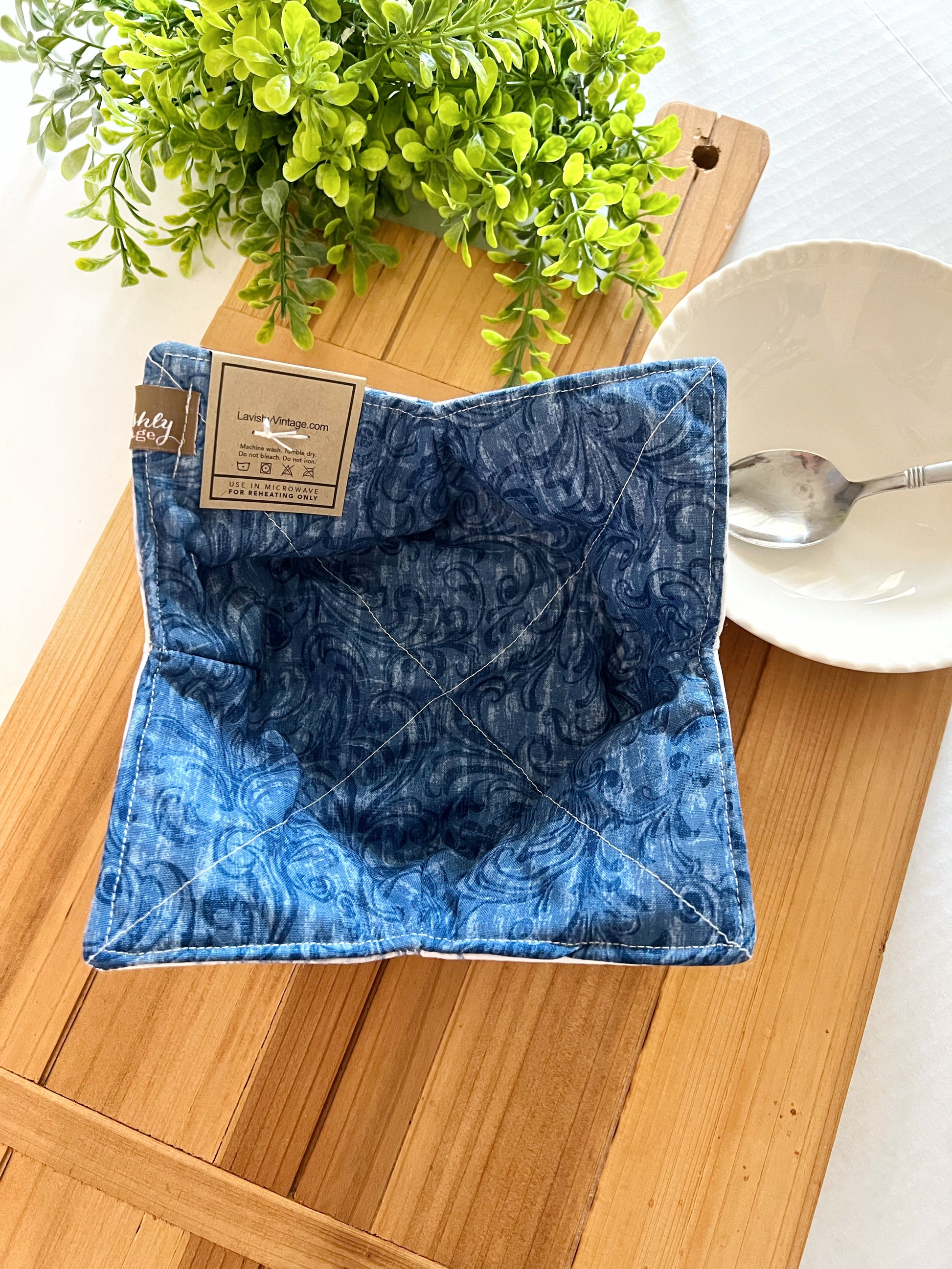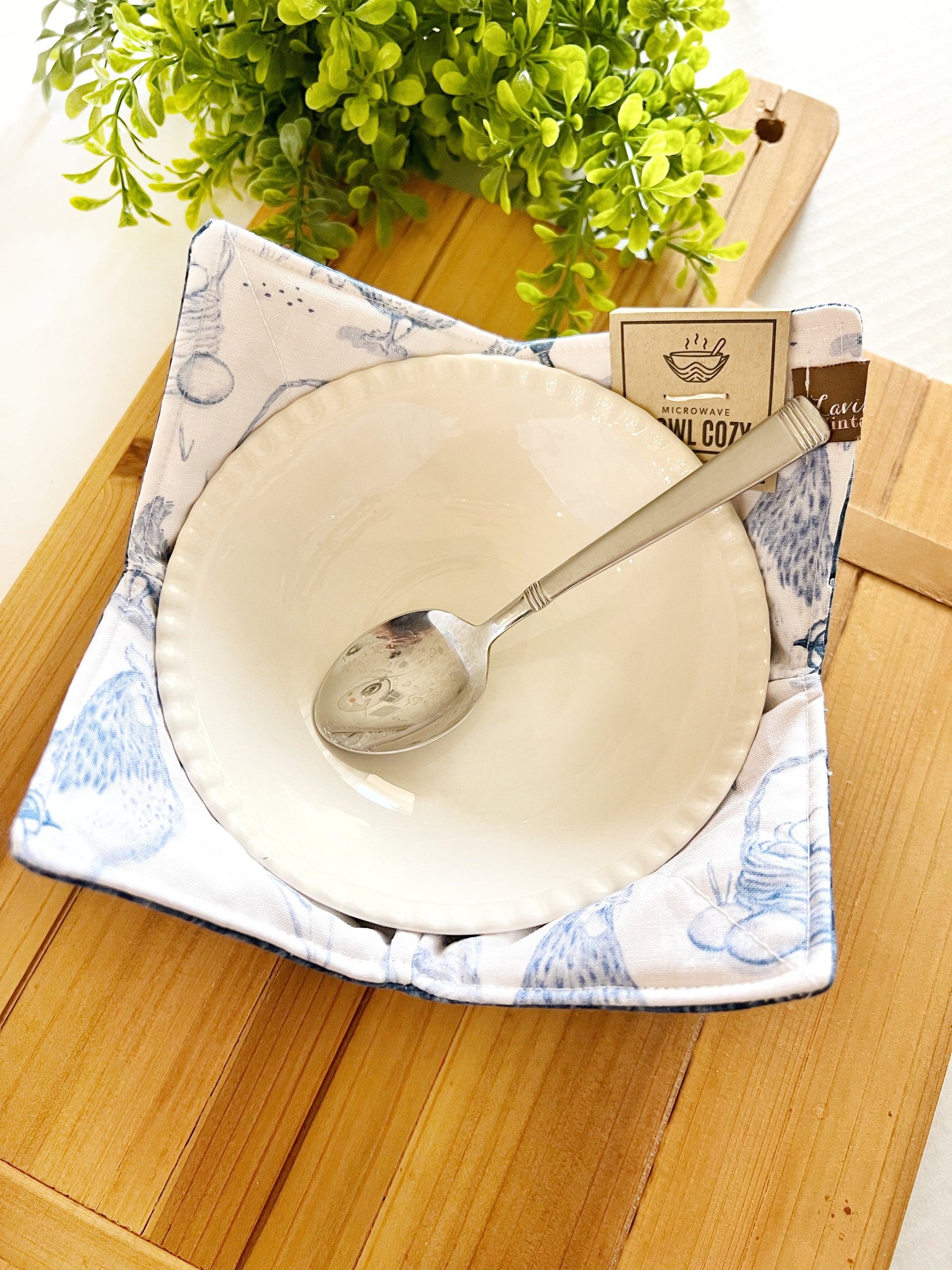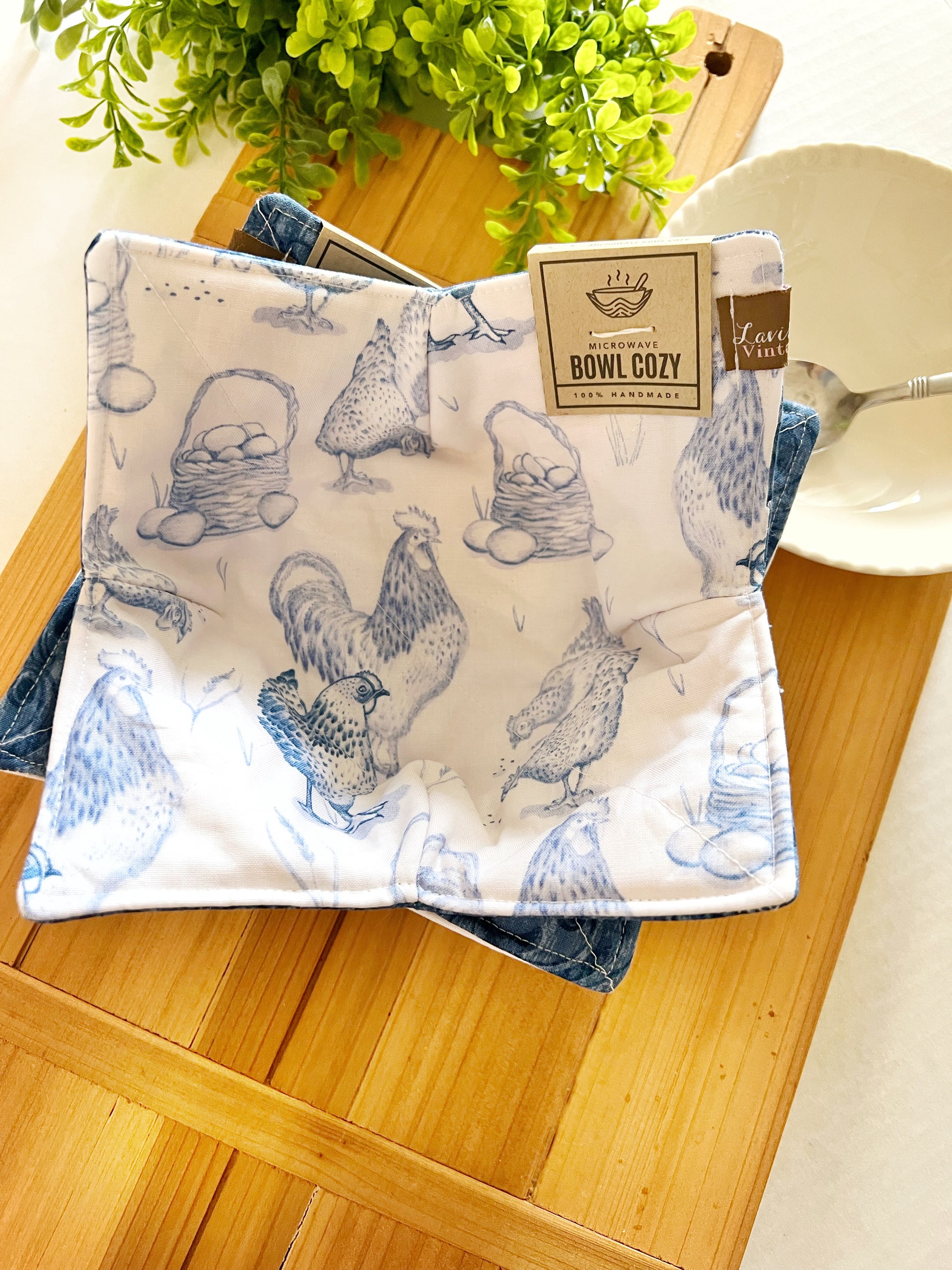 Save your hands from the heat or cold with our NEWEST microwave safe bowl cozy. This is the perfect partner for heating up your bowl of soup or dress up last night's leftovers or your favorite cold treat. Beautiful contrasting blue and blue chickens are sure to make those leftovers or ice cream taste better