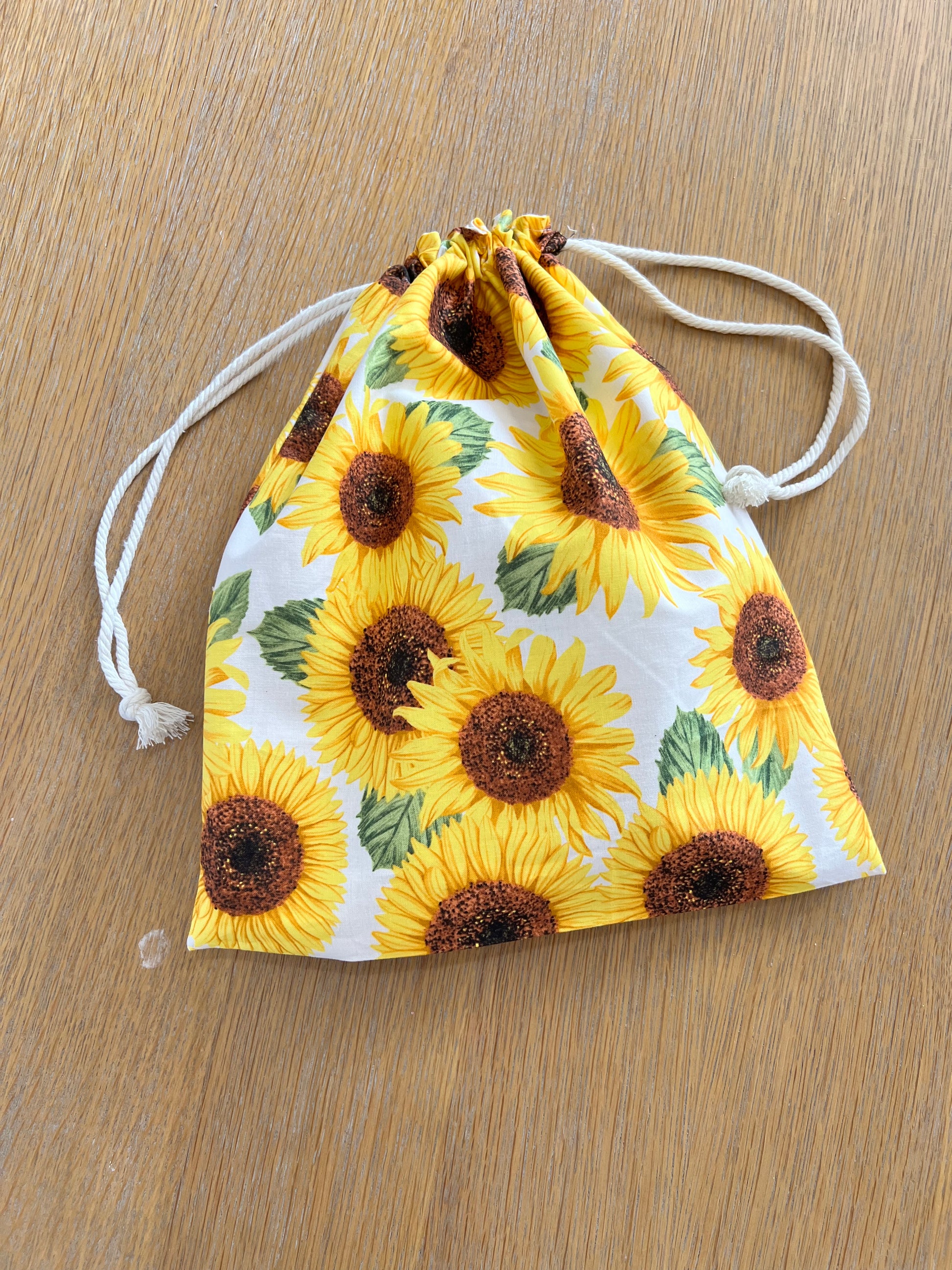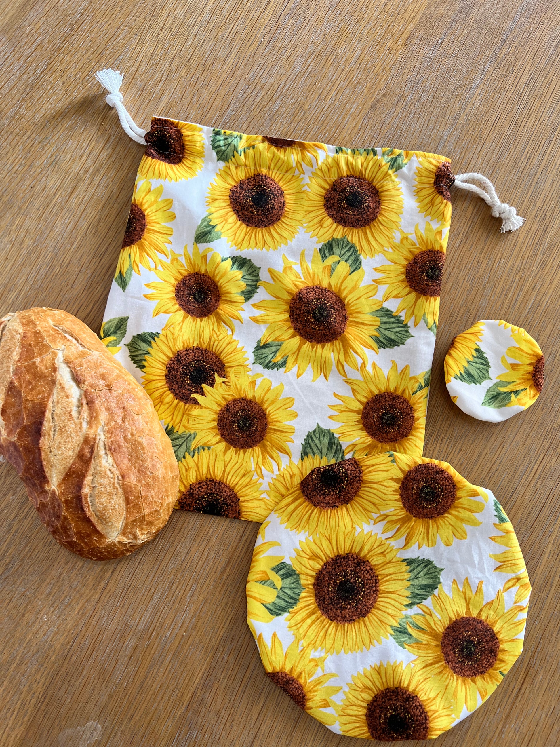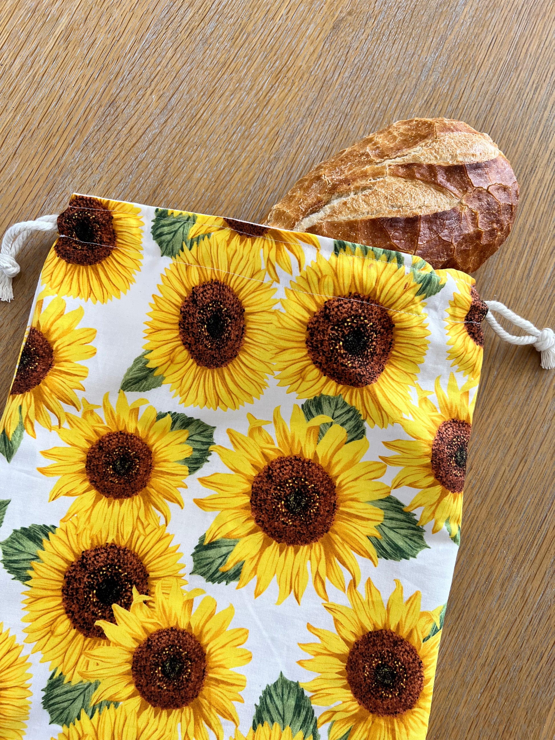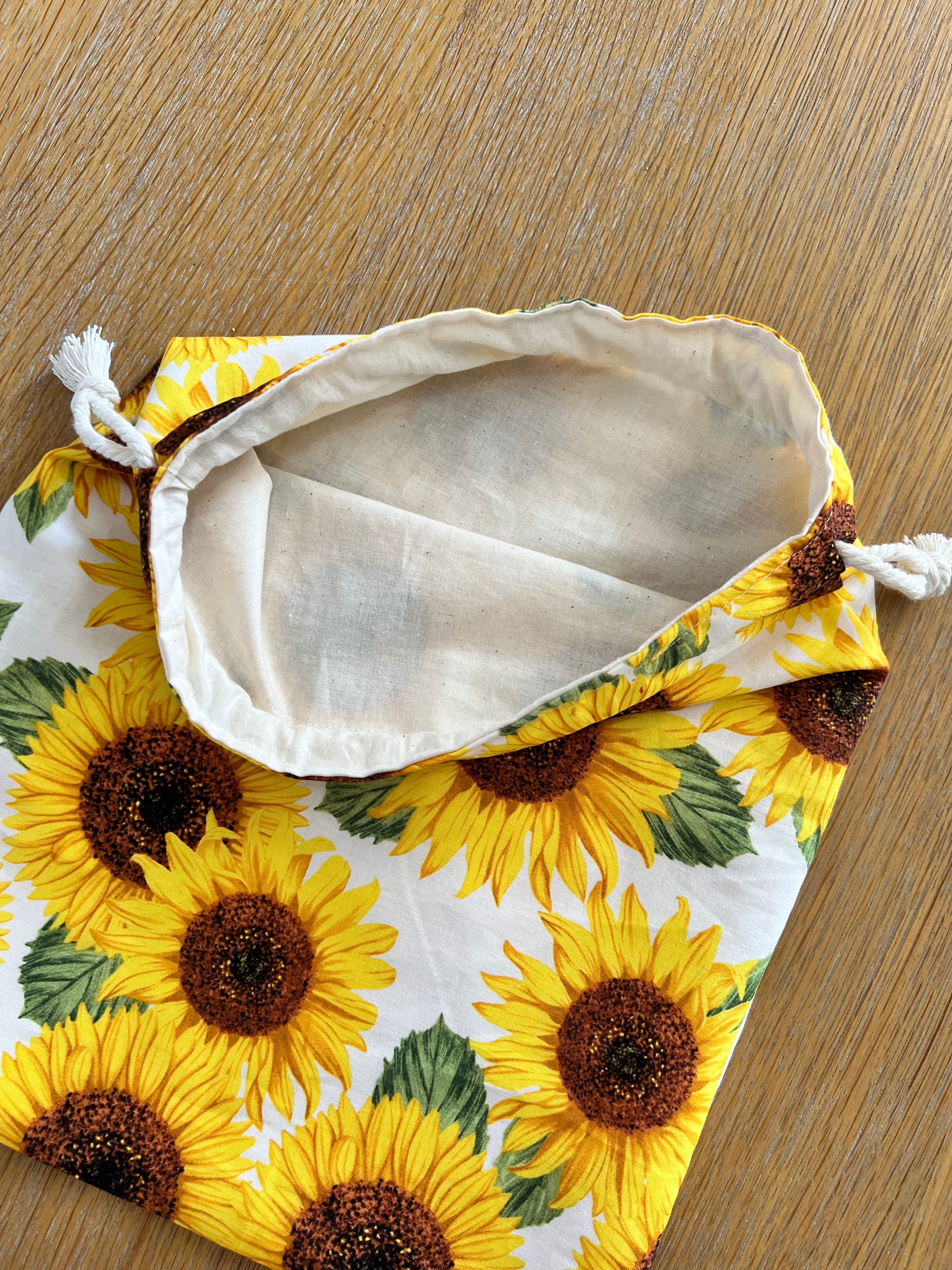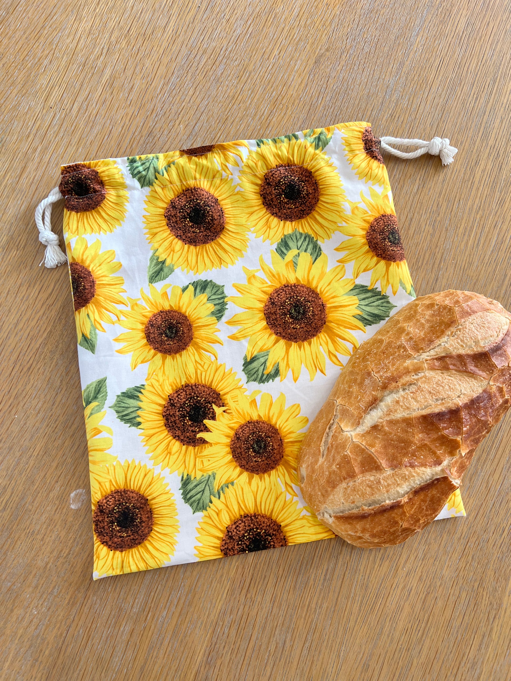 Bread bag is approximately 13"x 15" with cotton fabric on one side and lined with muslin on the inside. Two draw cotton draw strings for easy closing and opening.