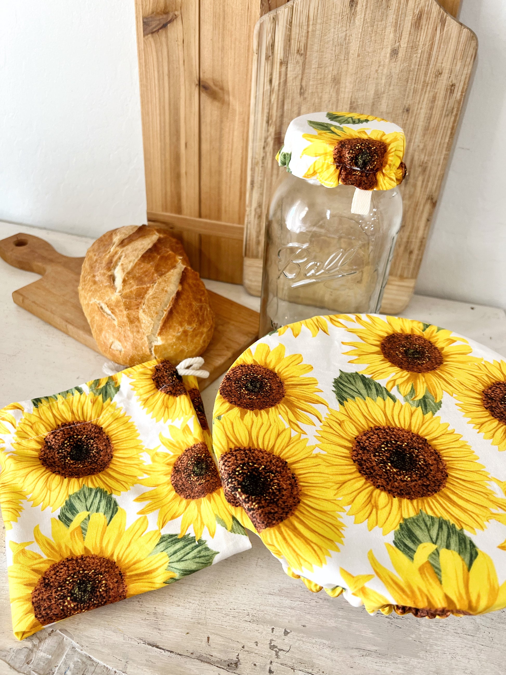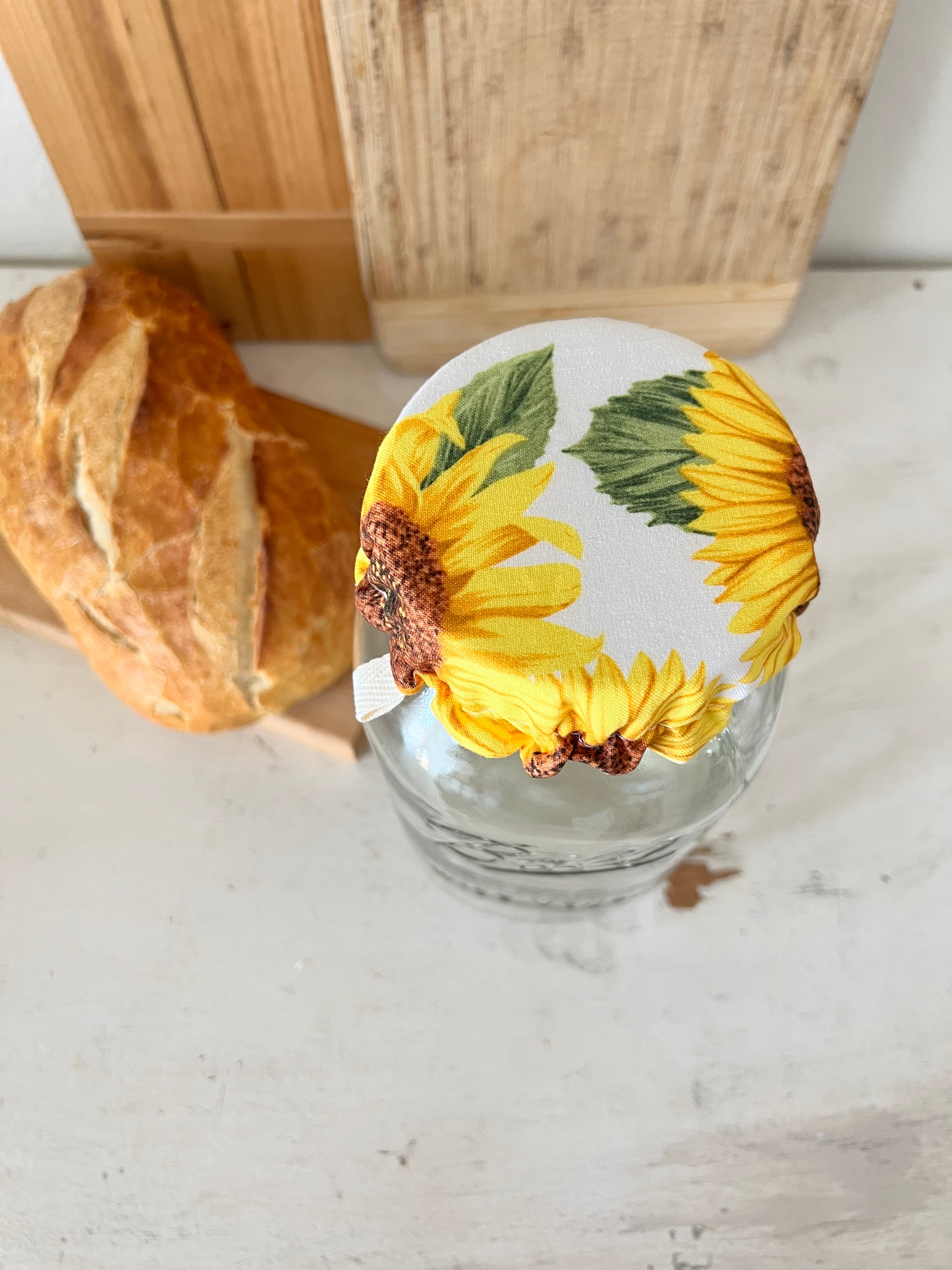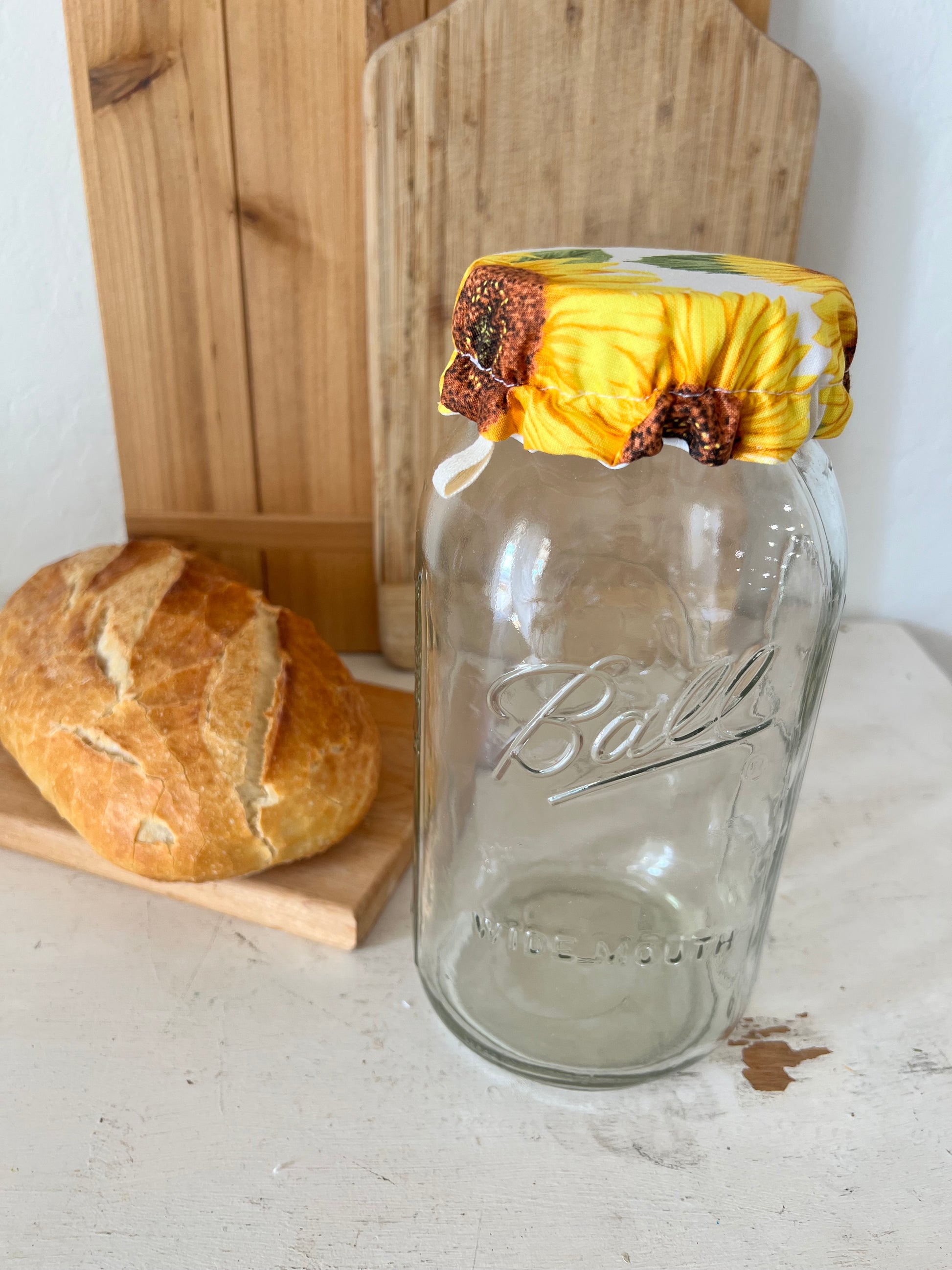 Jar cover fits all wide mouth jars. Pictured on a 64 oz half gallon jar, but will fit any wide mouth mason jar. Jar cover has cotton fabric on one side and lined with PUL fabric to replace plastic wrap. Perfect for your sourdough starter.