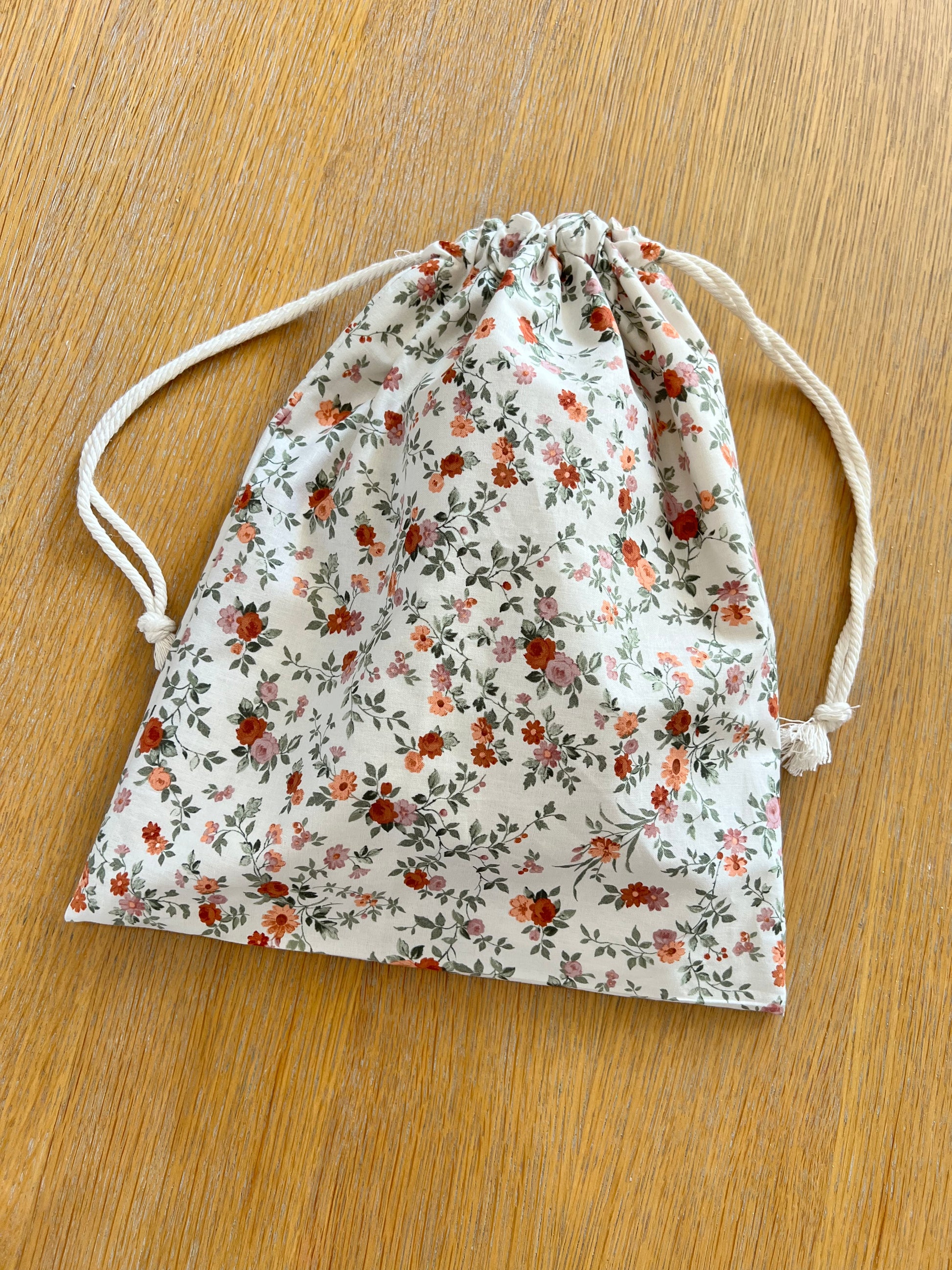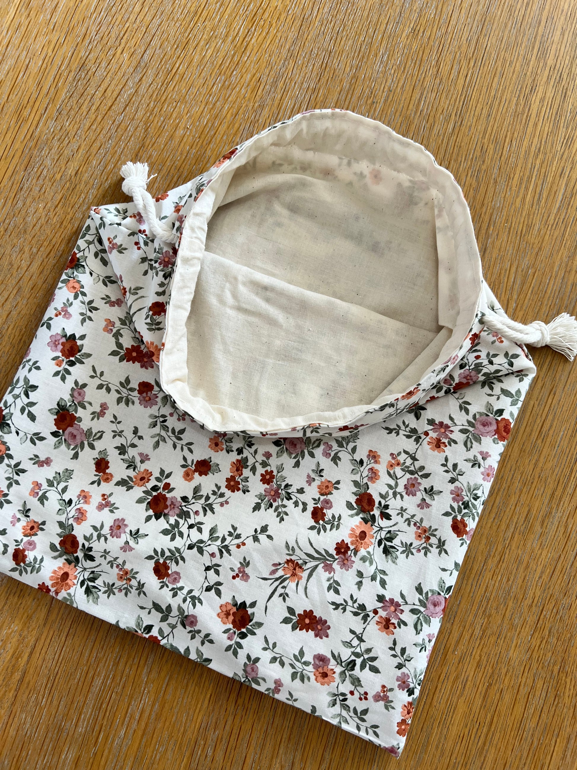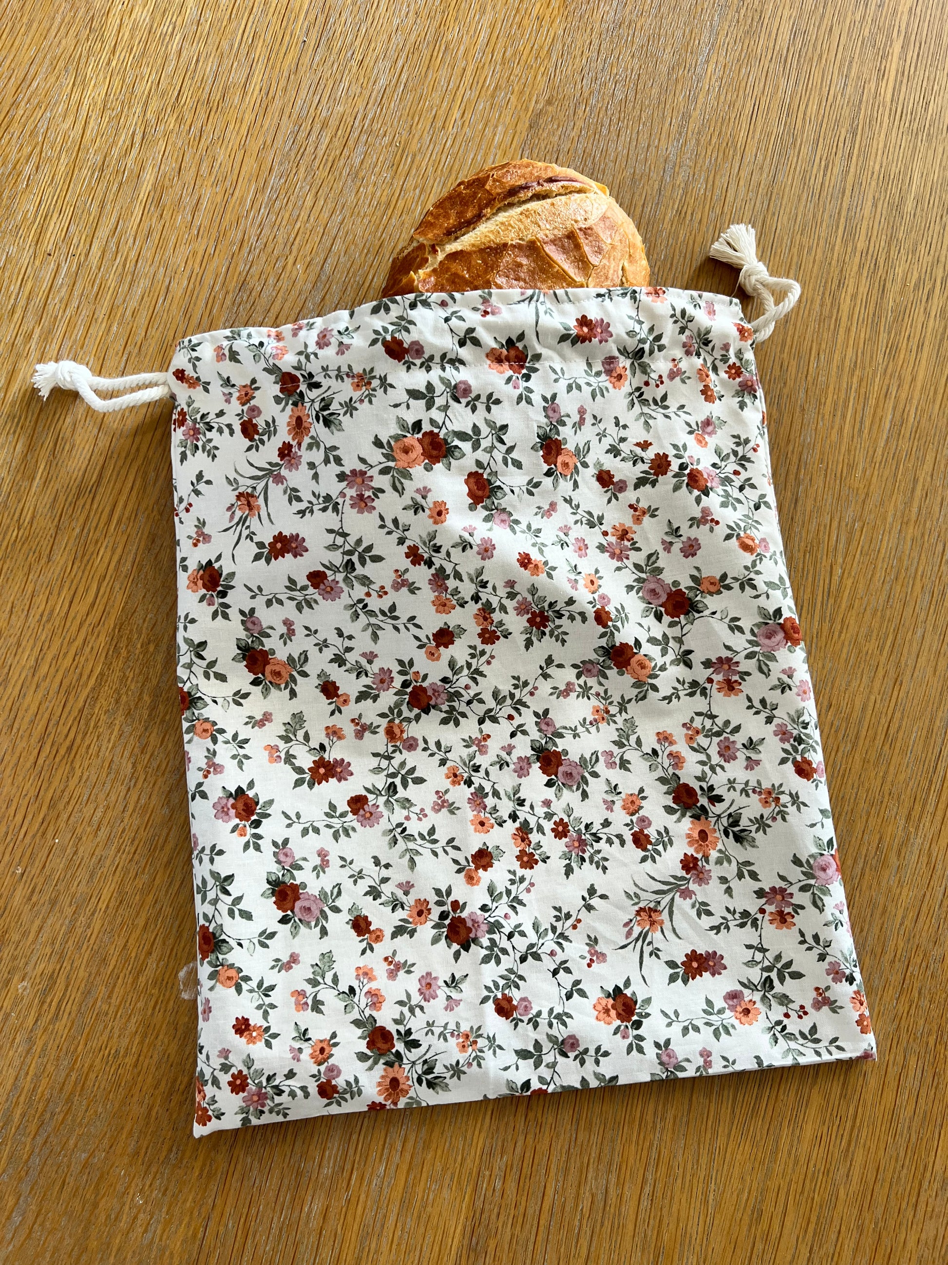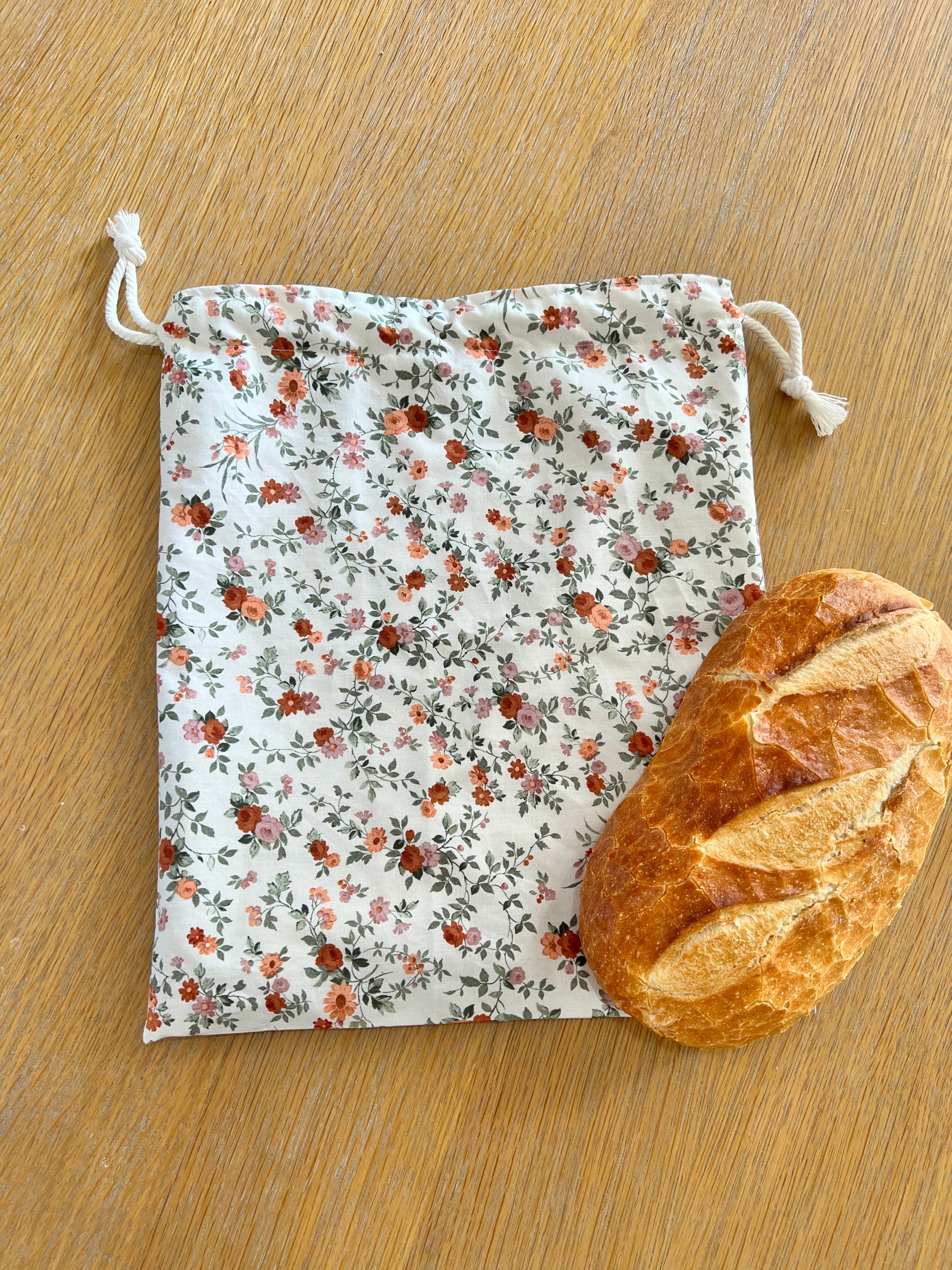 Bread bag is approximately 13"x 15" with cotton fabric on one side and lined with muslin on the inside. Two draw cotton draw strings for easy closing and opening.