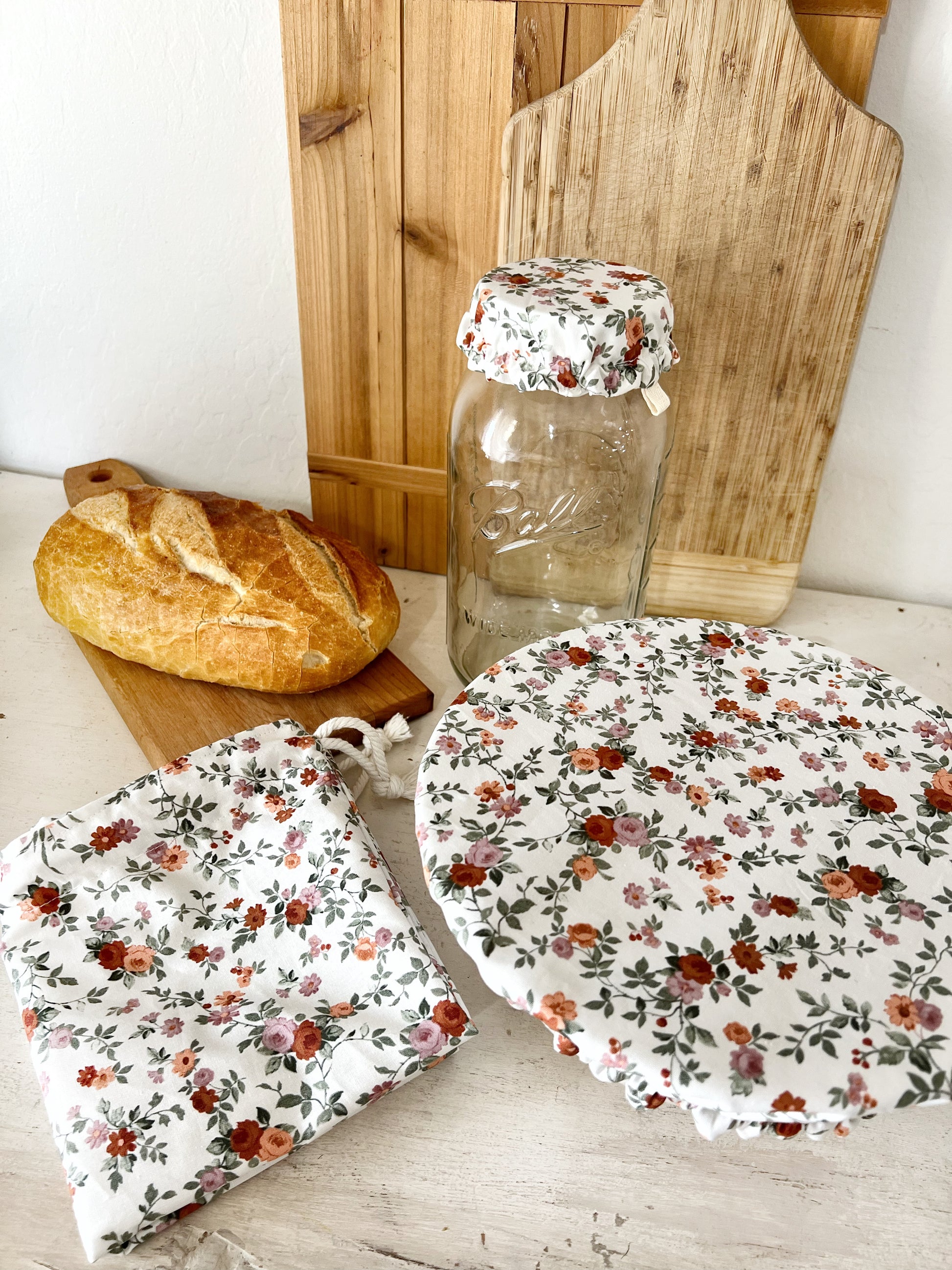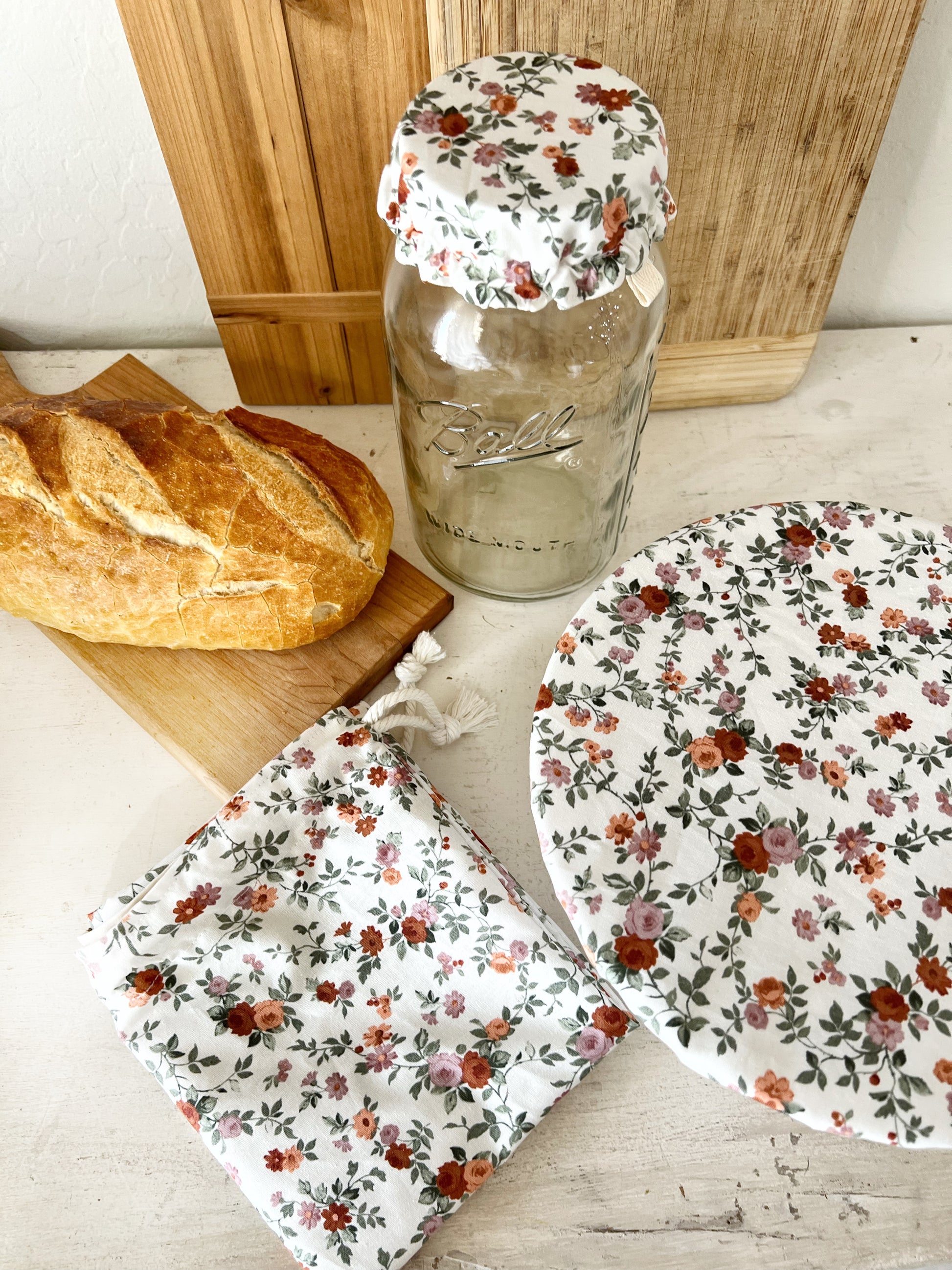 Jar cover fits all wide mouth jars. Pictured on a 64 oz half gallon jar, but will fit any wide mouth mason jar. Jar cover has cotton fabric on one side and lined with PUL fabric to replace plastic wrap. Perfect for your sourdough starter.
