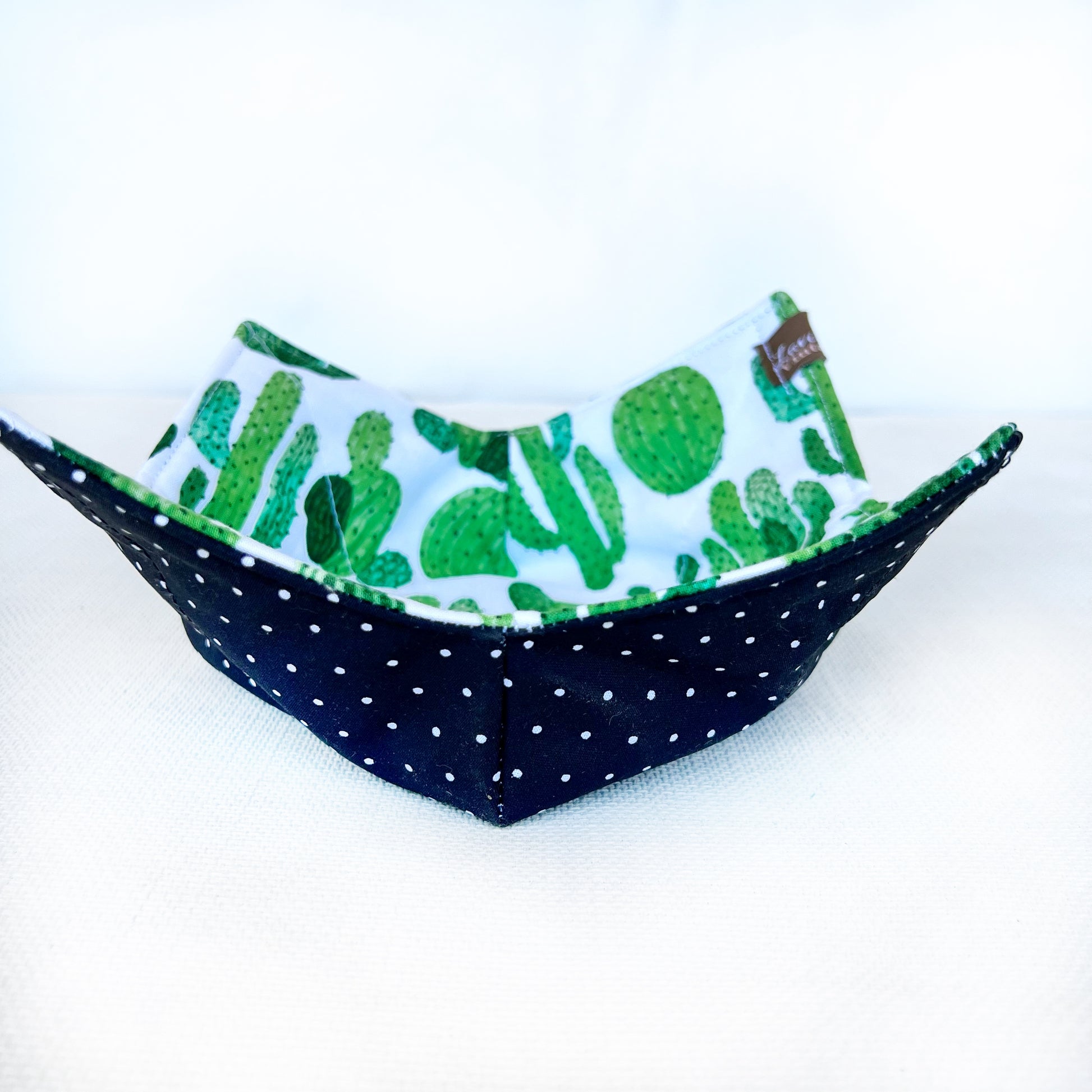 Save your hands from the heat or cold with our NEWEST microwave safe bowl cozy. This is the perfect partner for heating up your bowl of soup or dress up last night's leftovers or your favorite cold treat. Beautiful contrasting polka dot and cactus are sure to make those leftovers or ice cream taste better