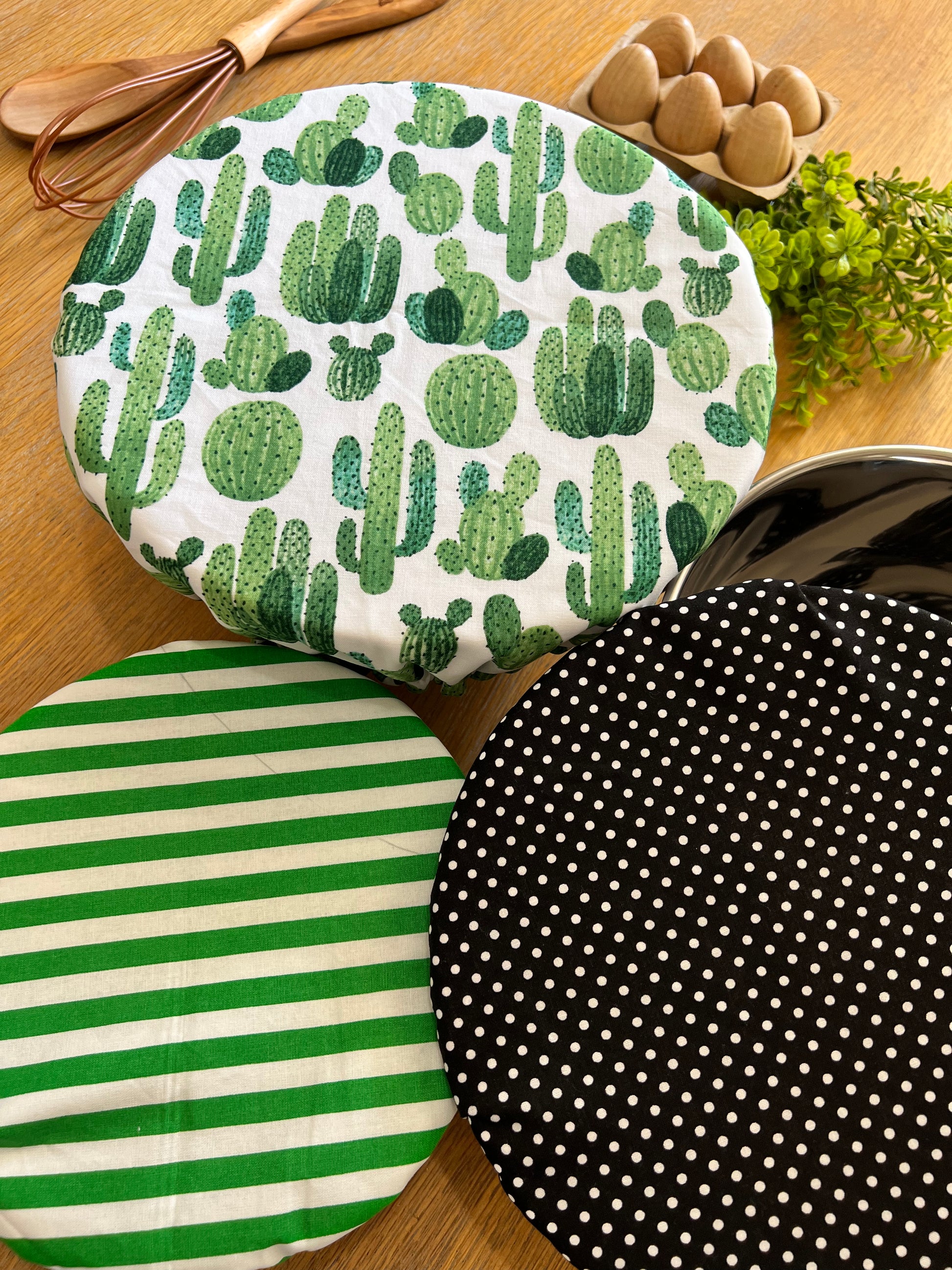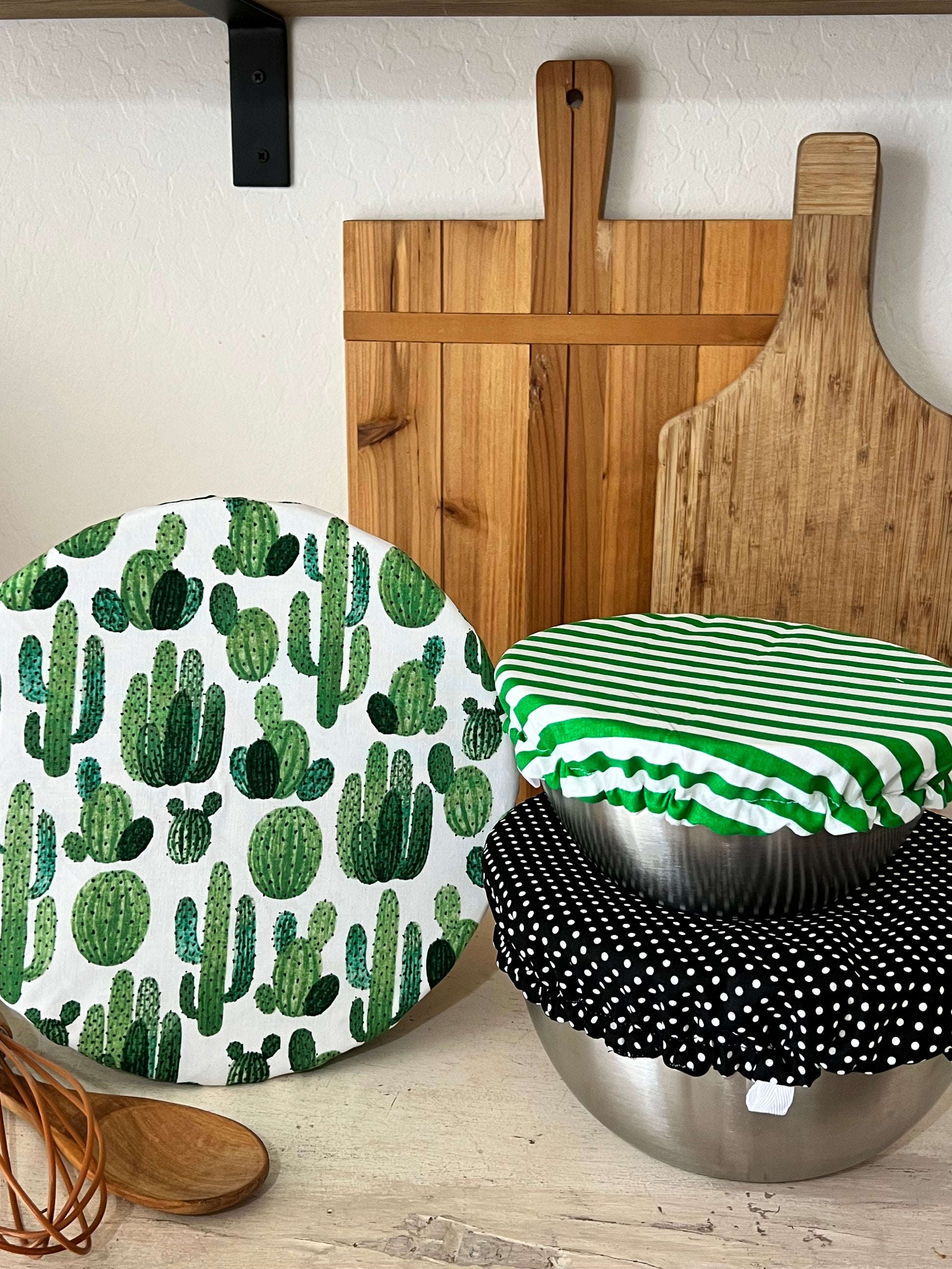 Going Green? We've got you covered. This is a set of three reusable, hand crafted bowl coverings. Replace plastic wrap with these airtight, attractive bowl covers. Simply machine wash and pop them in the dryer to re-use for years to come. This specialty fabric is water and odor resistant and will keep your foods fresh for days. The elastic band holds tight and allows coverage for bowls 5-10” inches in diameter.