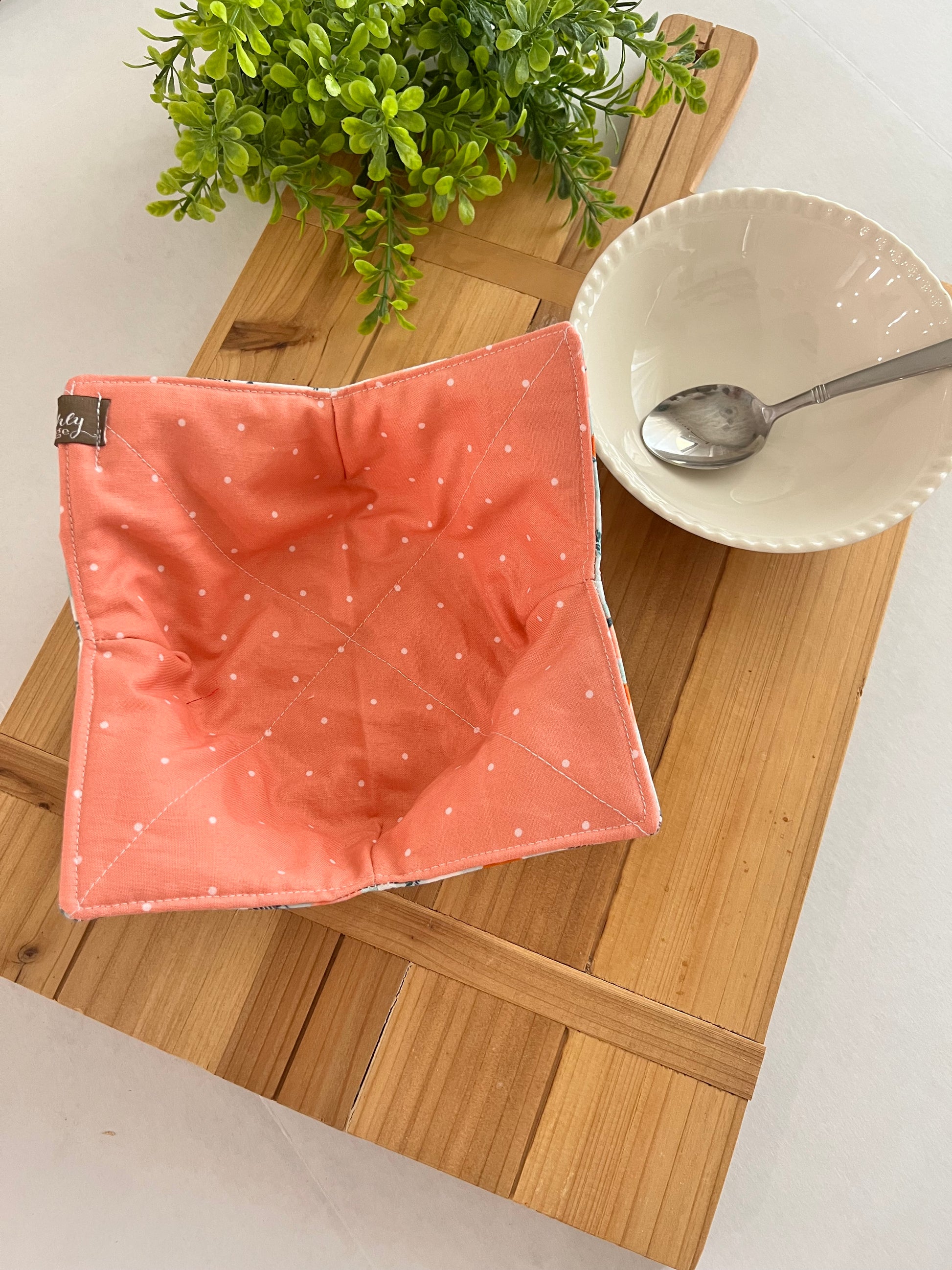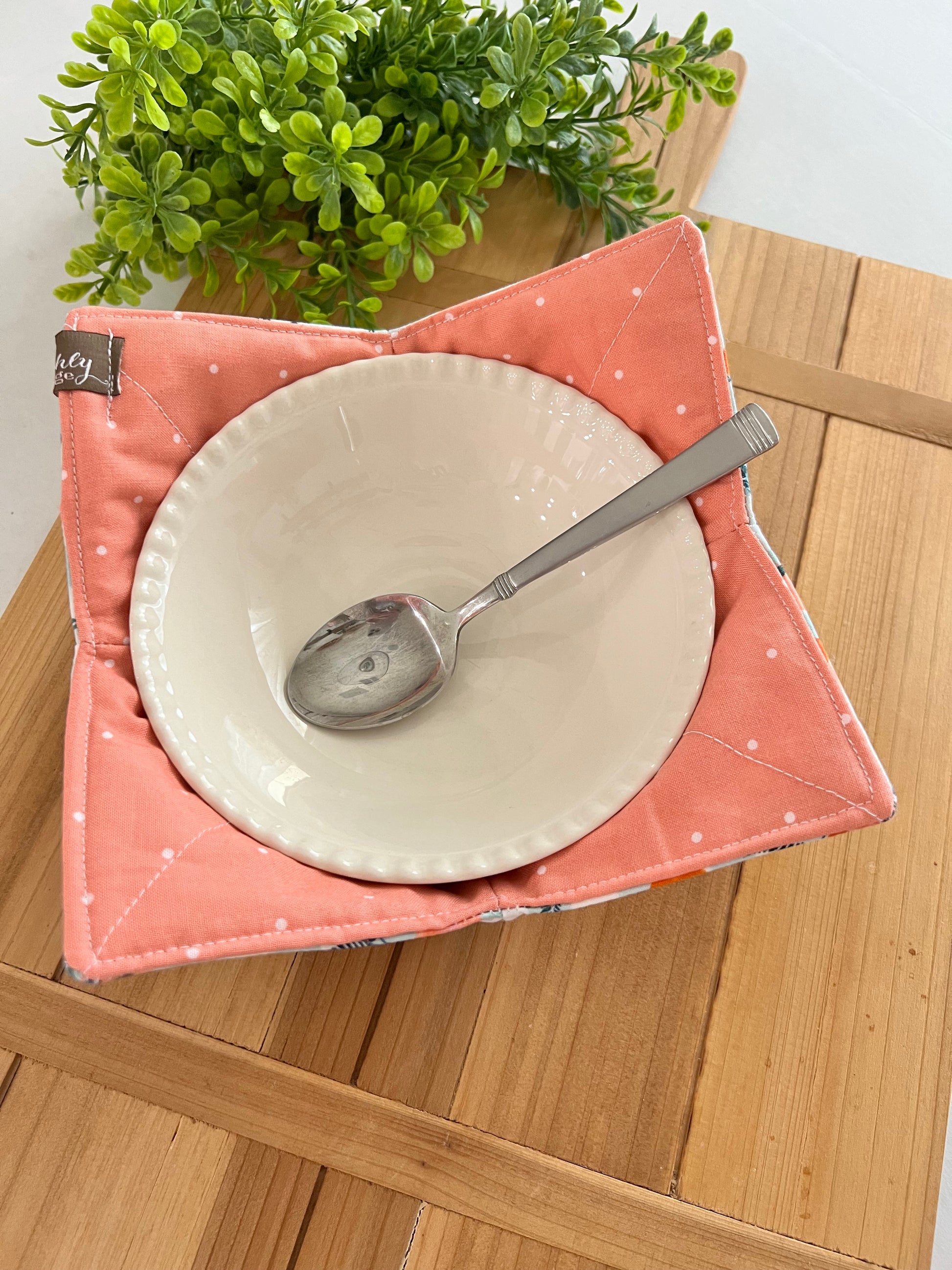 Save your hands from the heat or cold with our NEWEST microwave safe bowl cozy. This is the perfect partner for heating up your bowl of soup or dress up last night's leftovers or your favorite cold treat. Beautiful contrasting fabrics are sure to make those leftovers or ice cream taste better