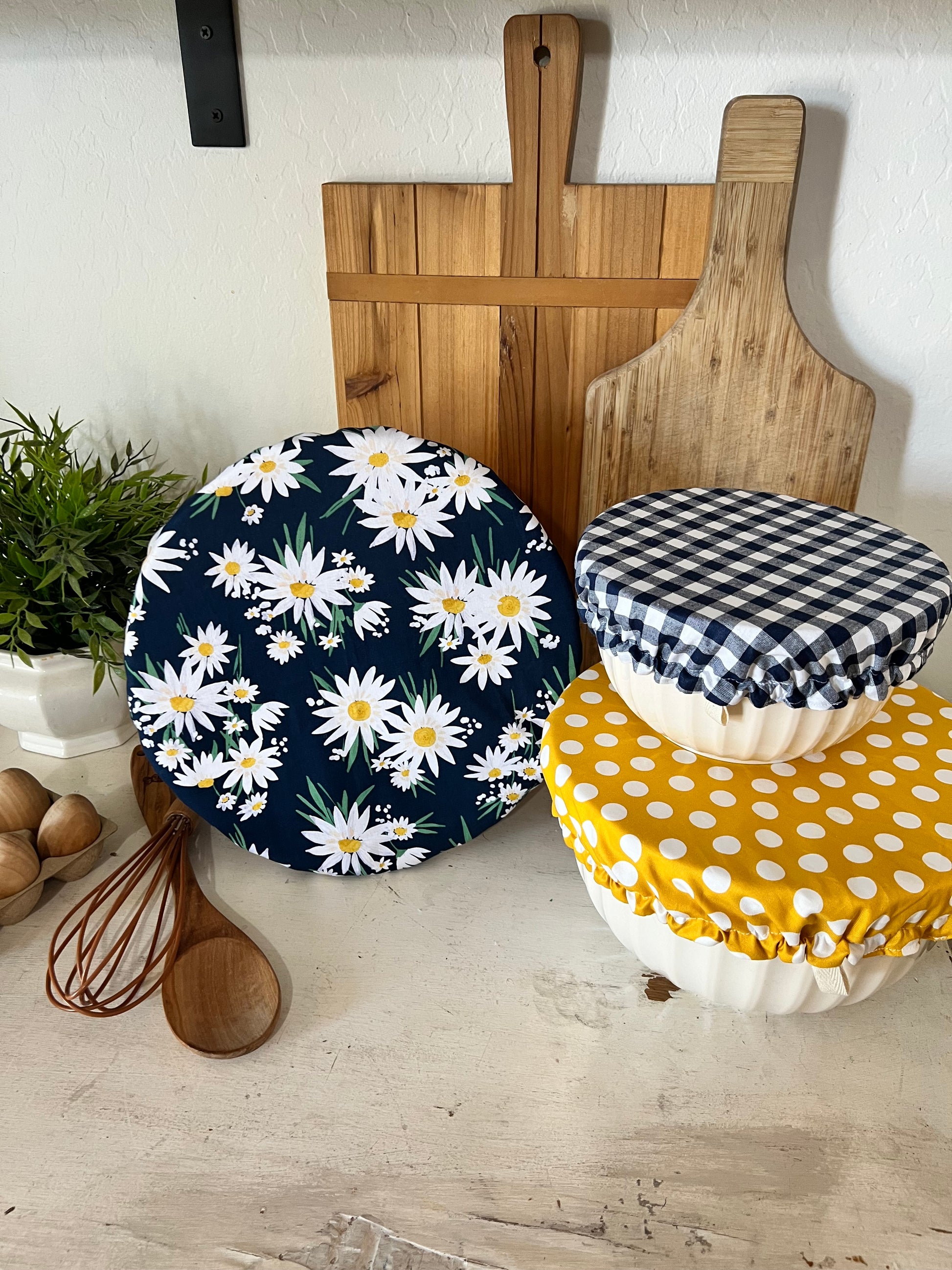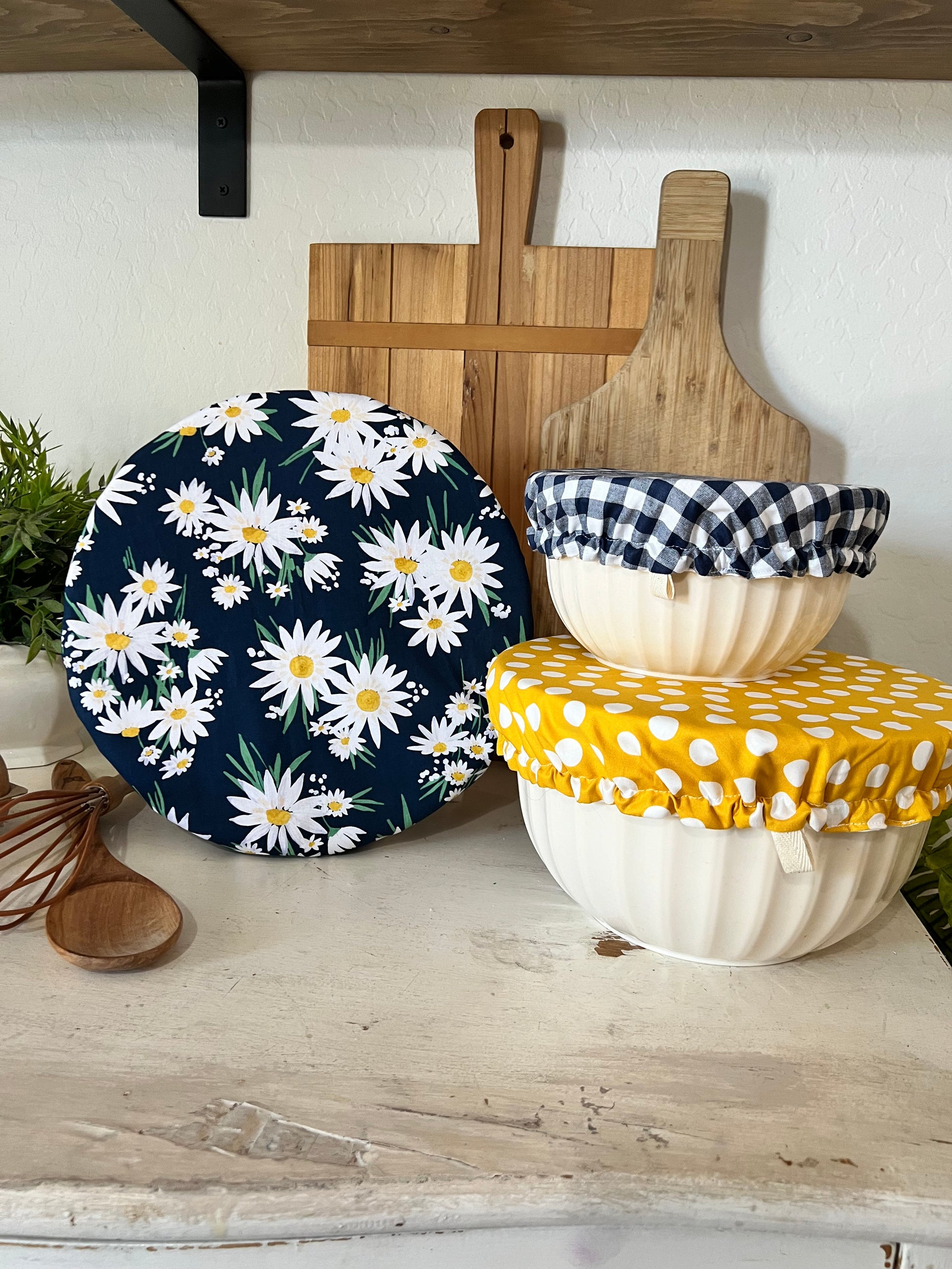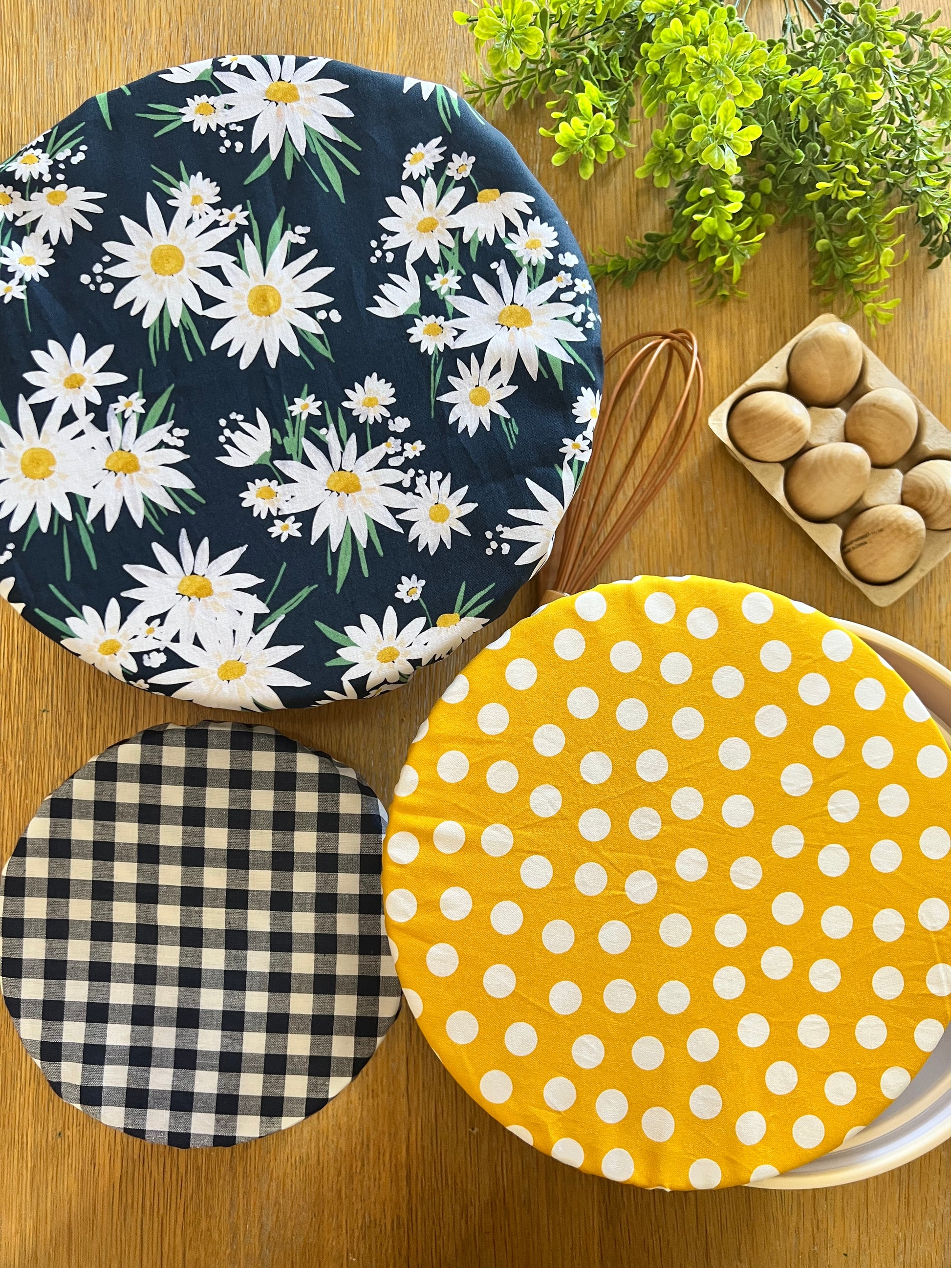 Going Green? We've got you covered. This is a set of three reusable, hand crafted bowl coverings. Replace plastic wrap with these airtight, attractive bowl covers. Simply machine wash and pop them in the dryer to re-use for years to come. This specialty fabric is water and odor resistant and will keep your foods fresh for days. The elastic band holds tight and allows coverage for bowls 5-10” inches in diameter.