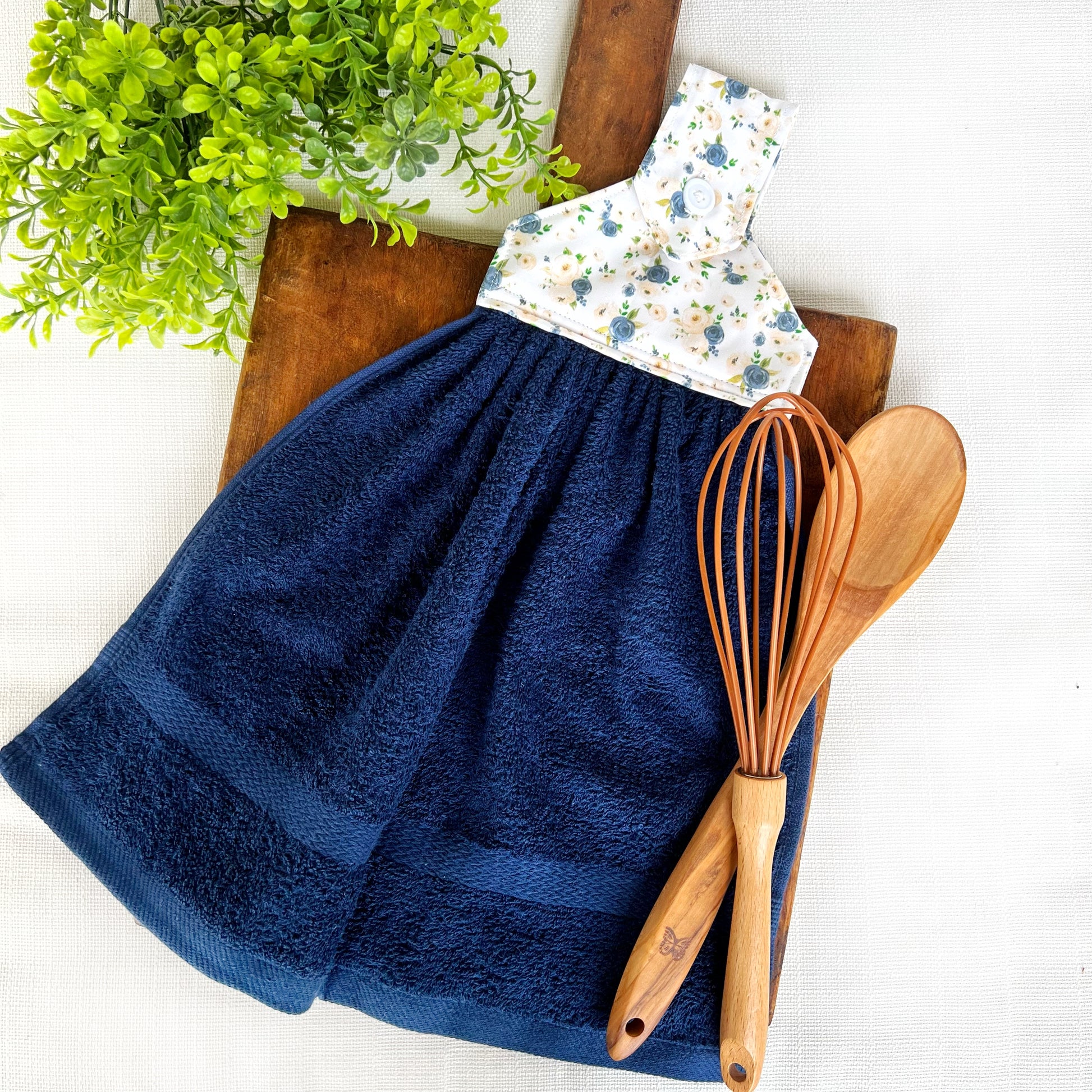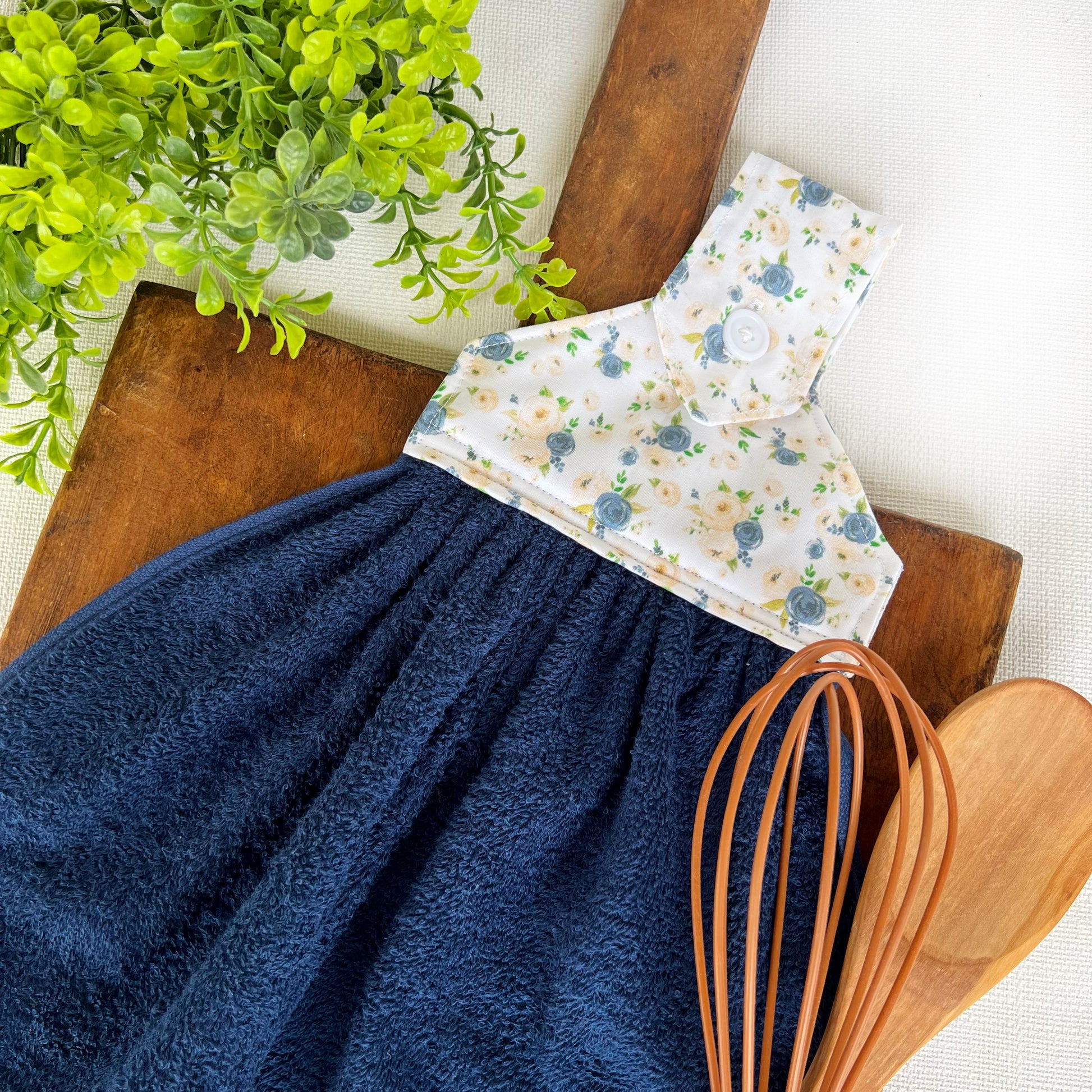 Handmade kitchen hand towel that stays secure with a button and hangs perfectly on an oven handle, dishwasher handle, or towel bar. This towel adds a lovely functional decorative touch to your kitchen. It also makes the perfect housewarming, bridal, or wedding gift. This hanging towel ensures that you always know where your towel is.