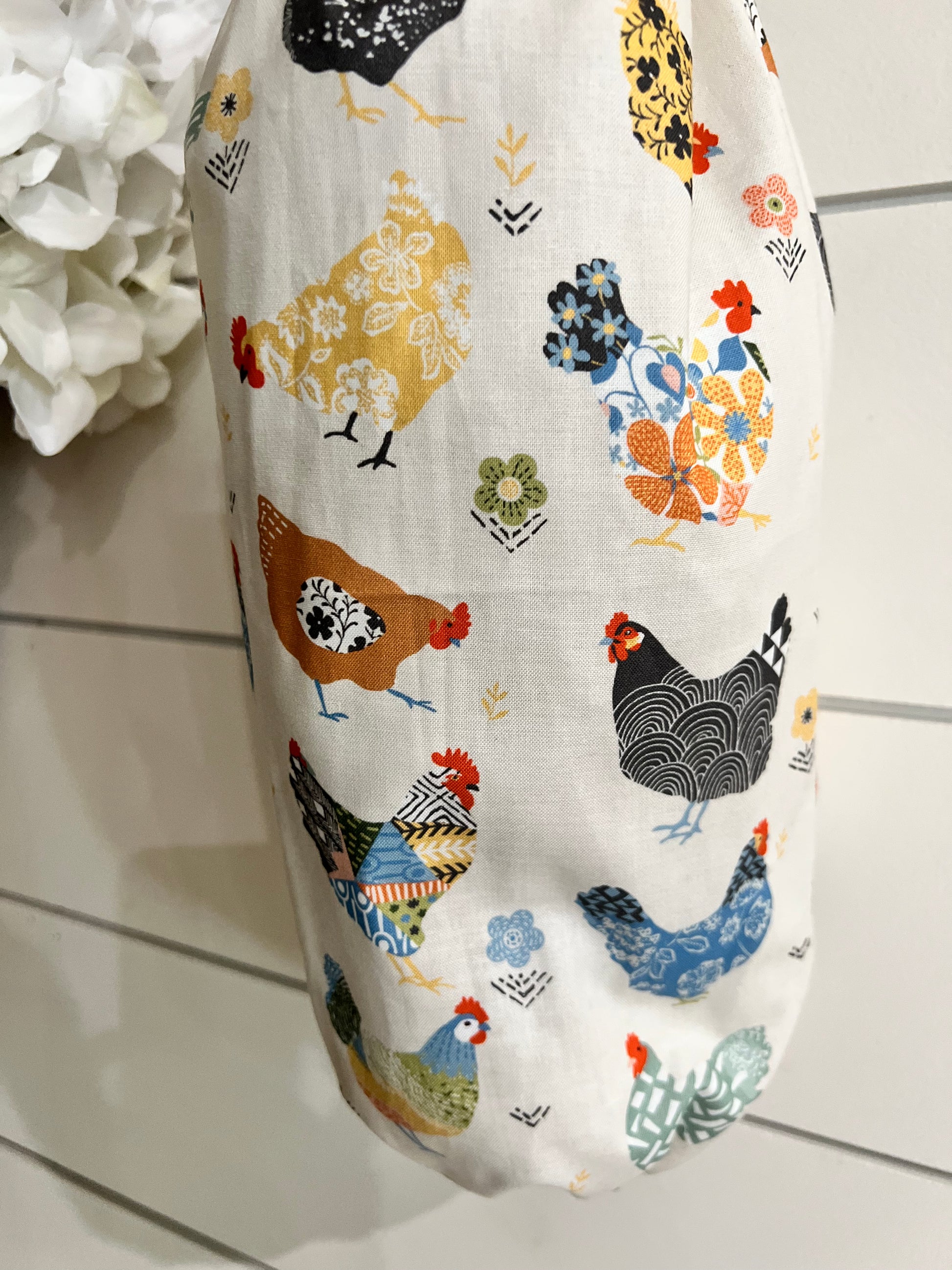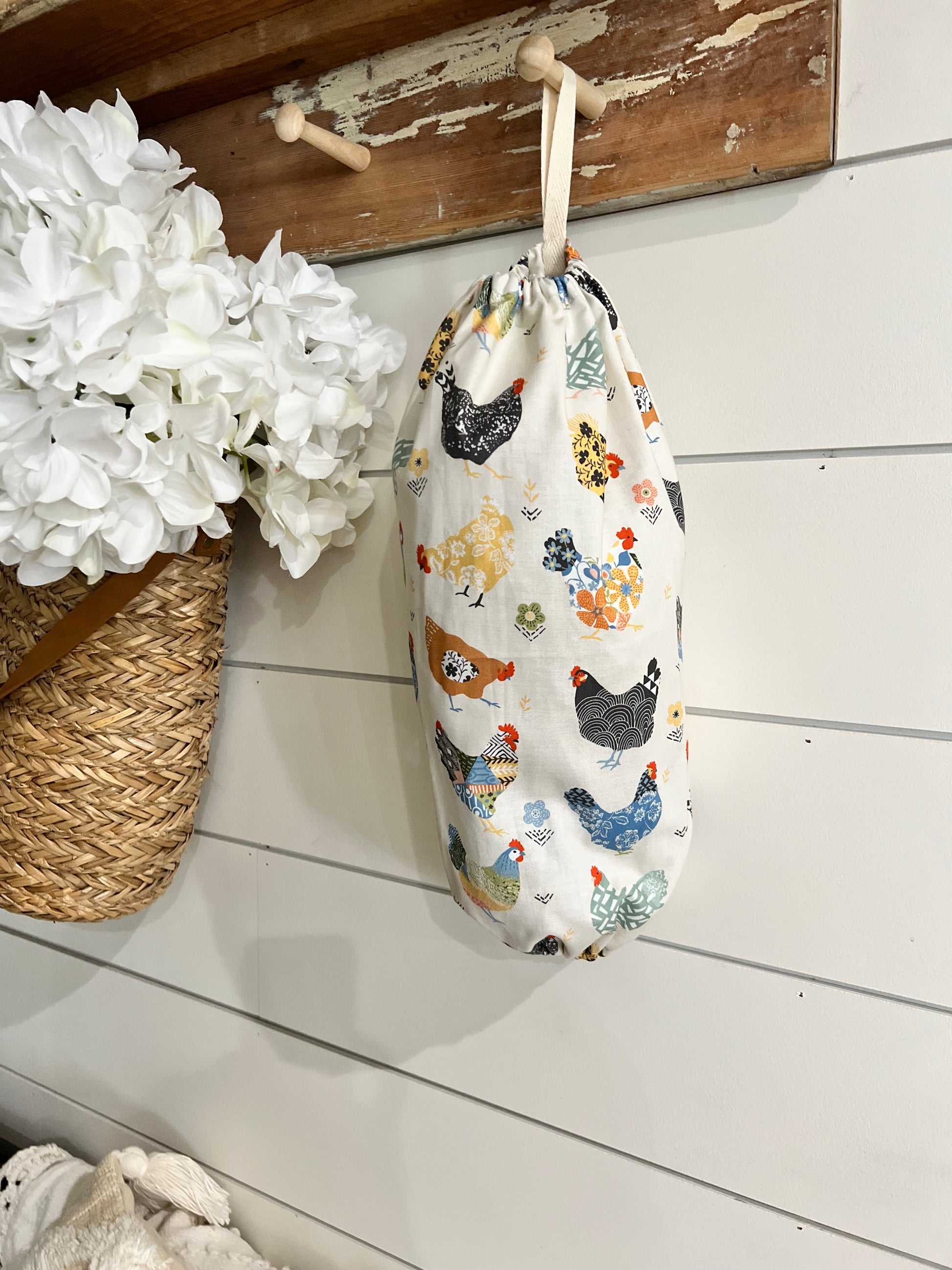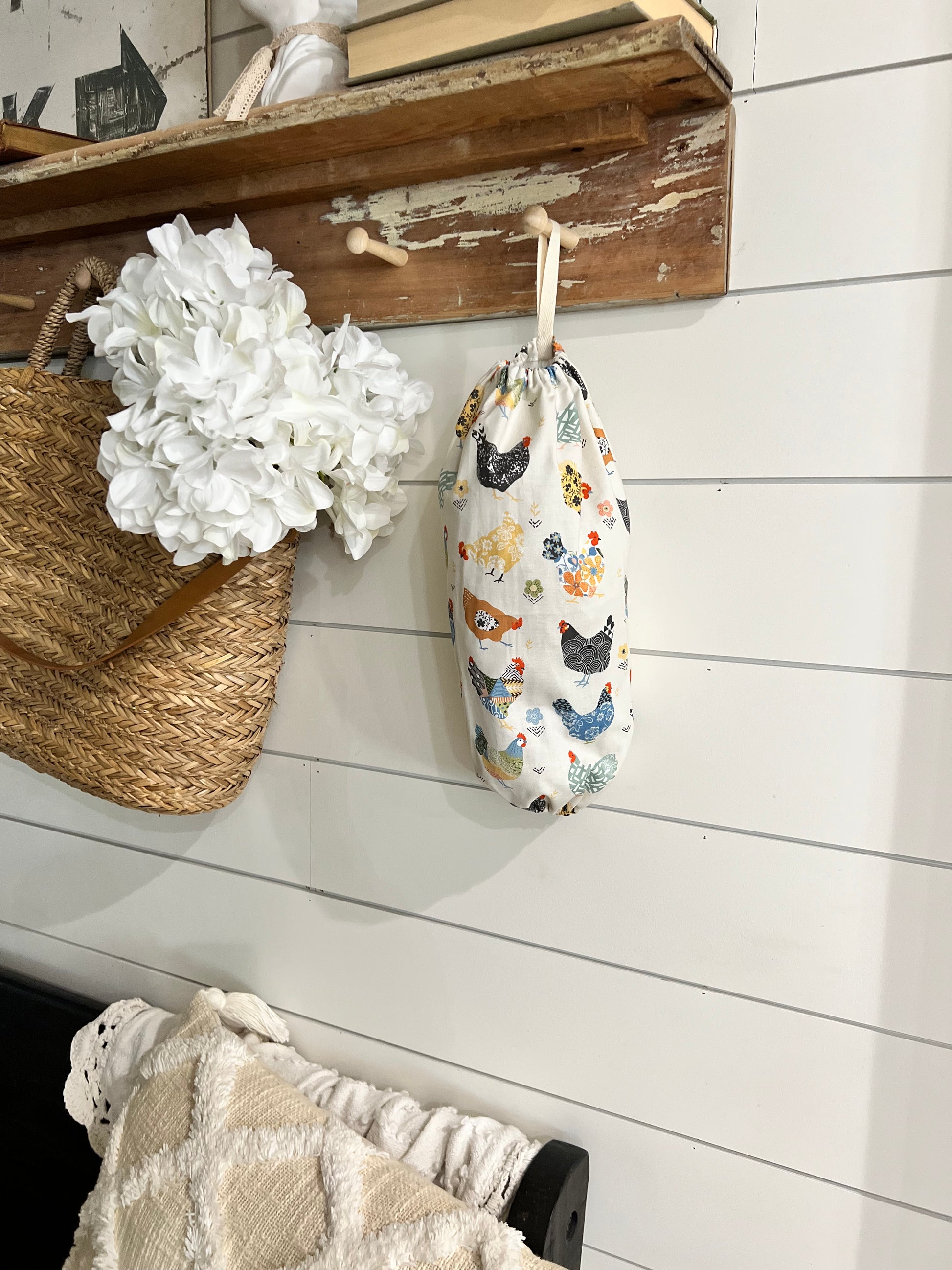 Get those plastic grocery bags organized with an adorable handmade bag dispenser. Stores 30+ plastic bags, depending on how you stuff them. Both top and bottom have elastic band sewn in to prevent bags from falling out.
