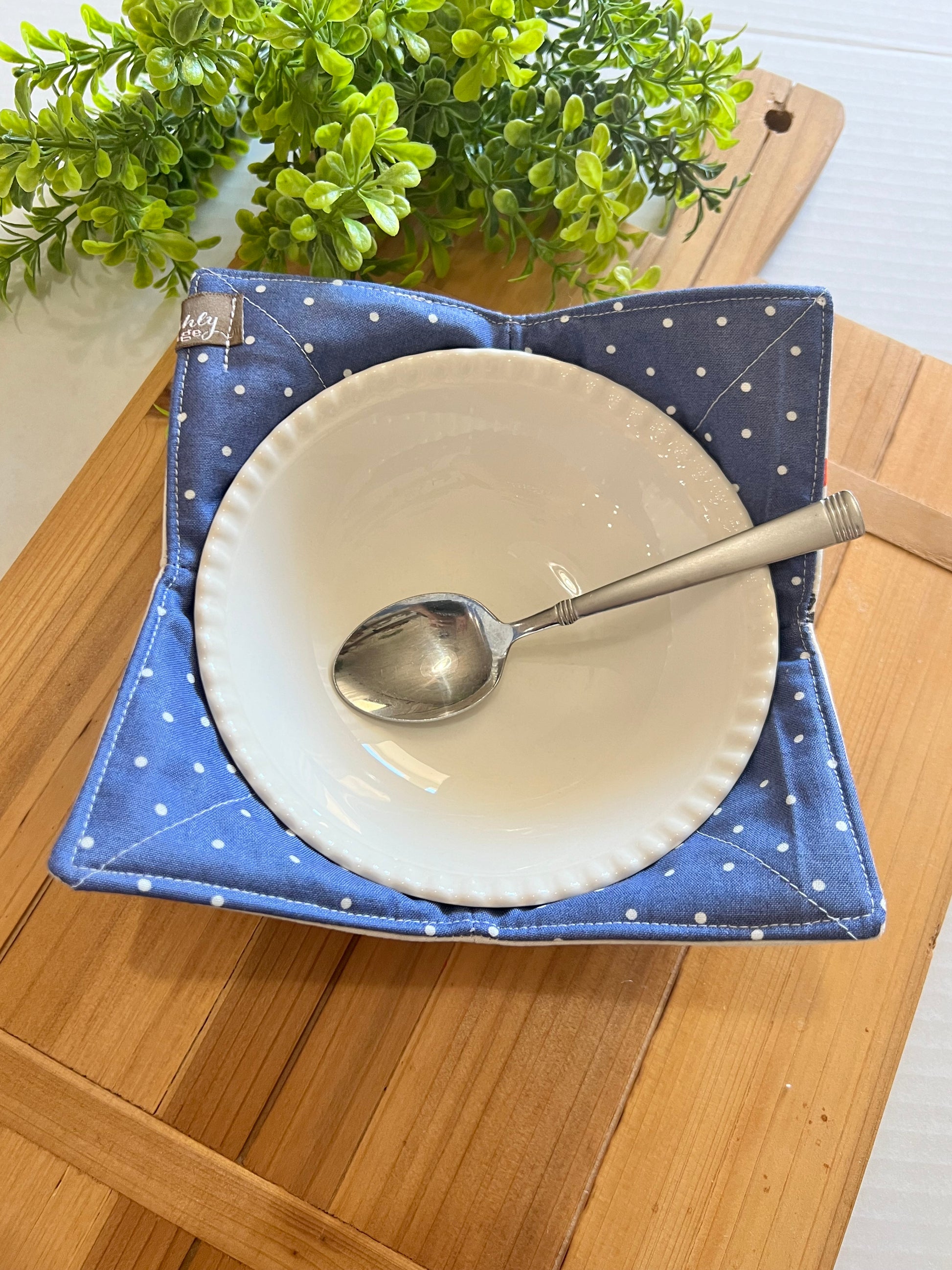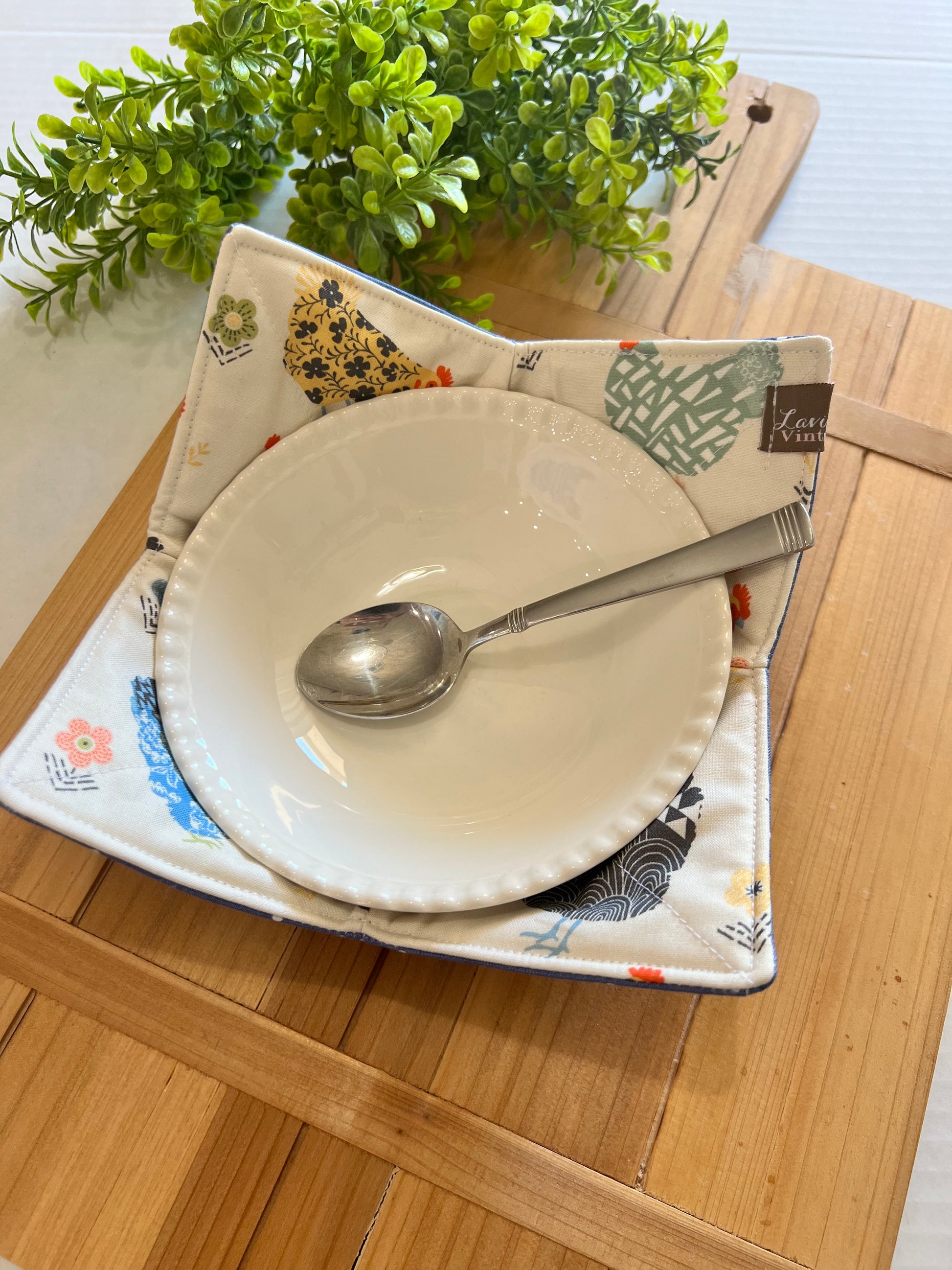 Save your hands from the heat or cold with our NEWEST microwave safe bowl cozy. This is the perfect partner for heating up your bowl of soup or dress up last night's leftovers or your favorite cold treat. Beautiful contrasting fabrics are sure to make those leftovers or ice cream taste better