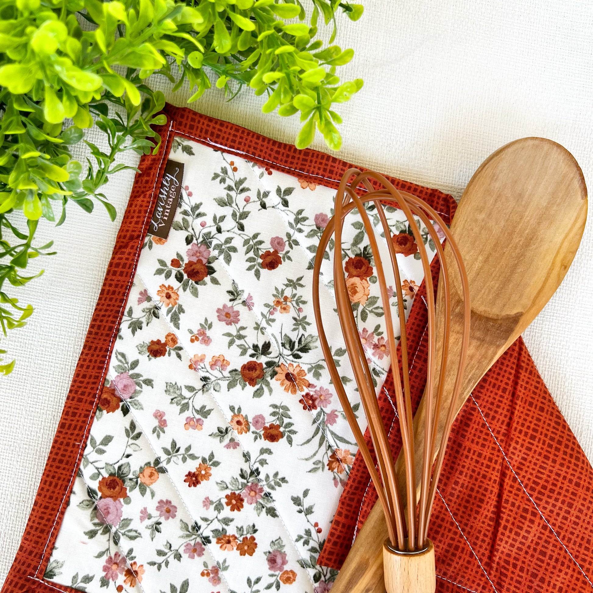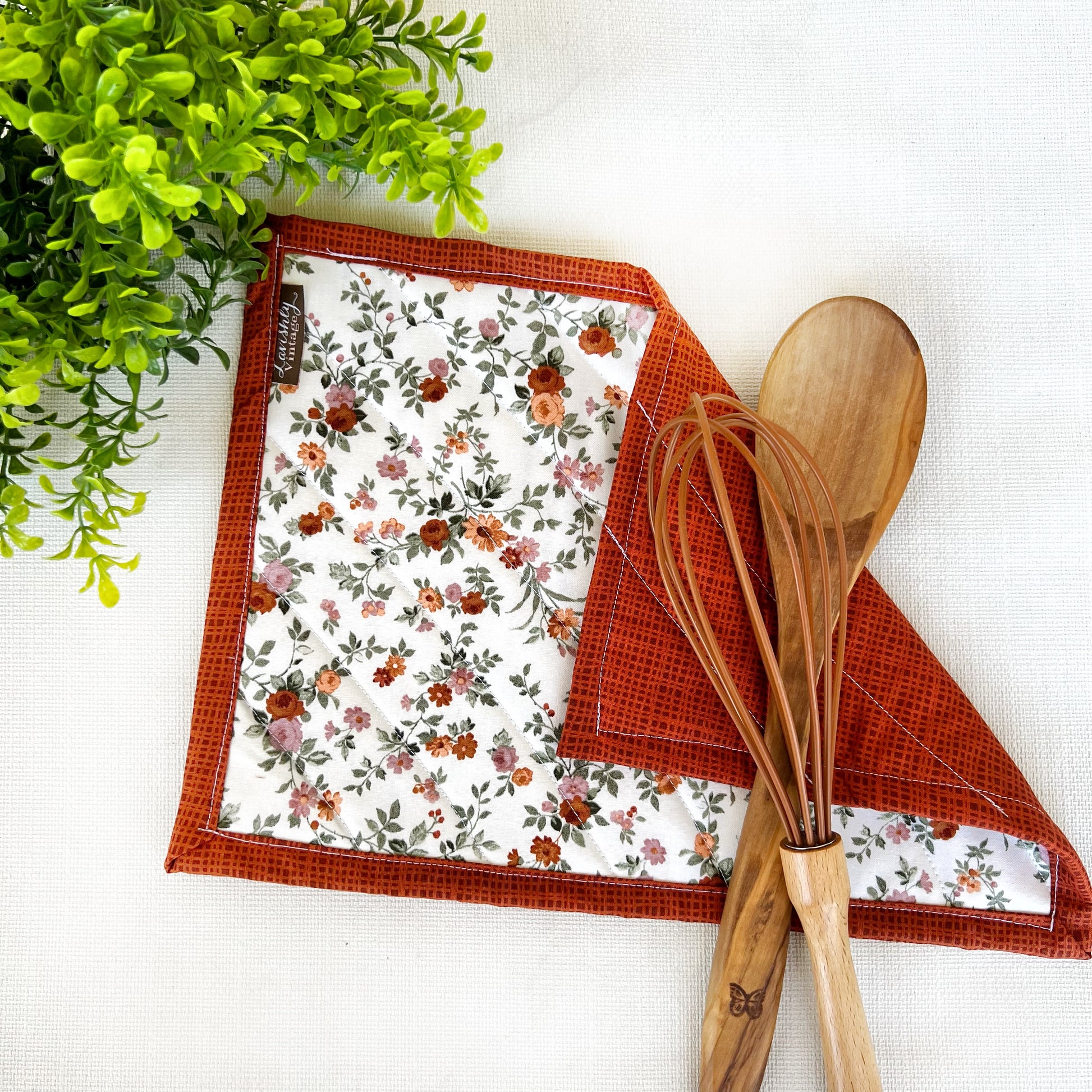 Each hot pad measures 10"x14" and are made with two coordinating cotton fabrics, and TWO layers of cotton batting. It is machine washable and reversible! See other listing for various designs available.