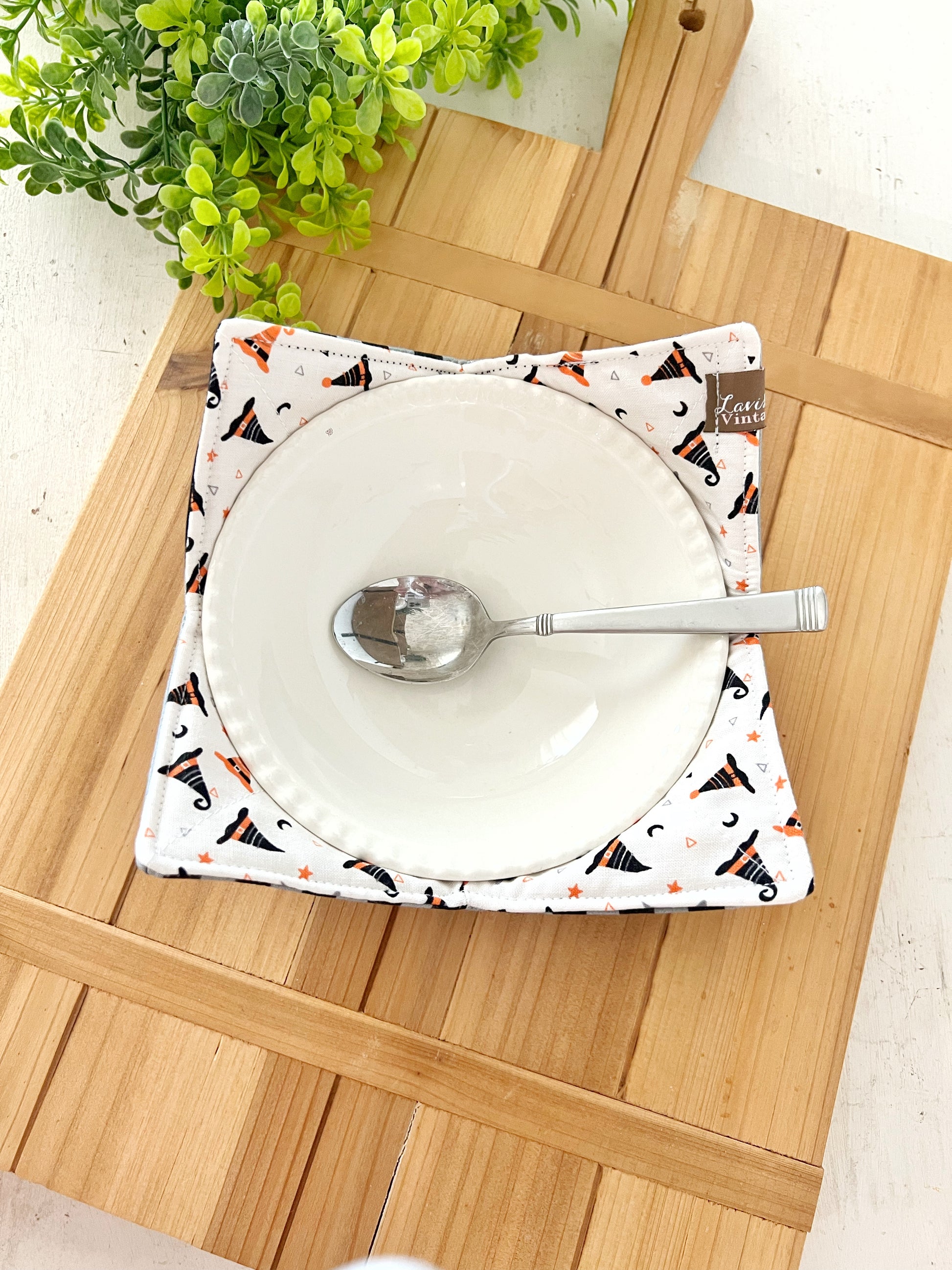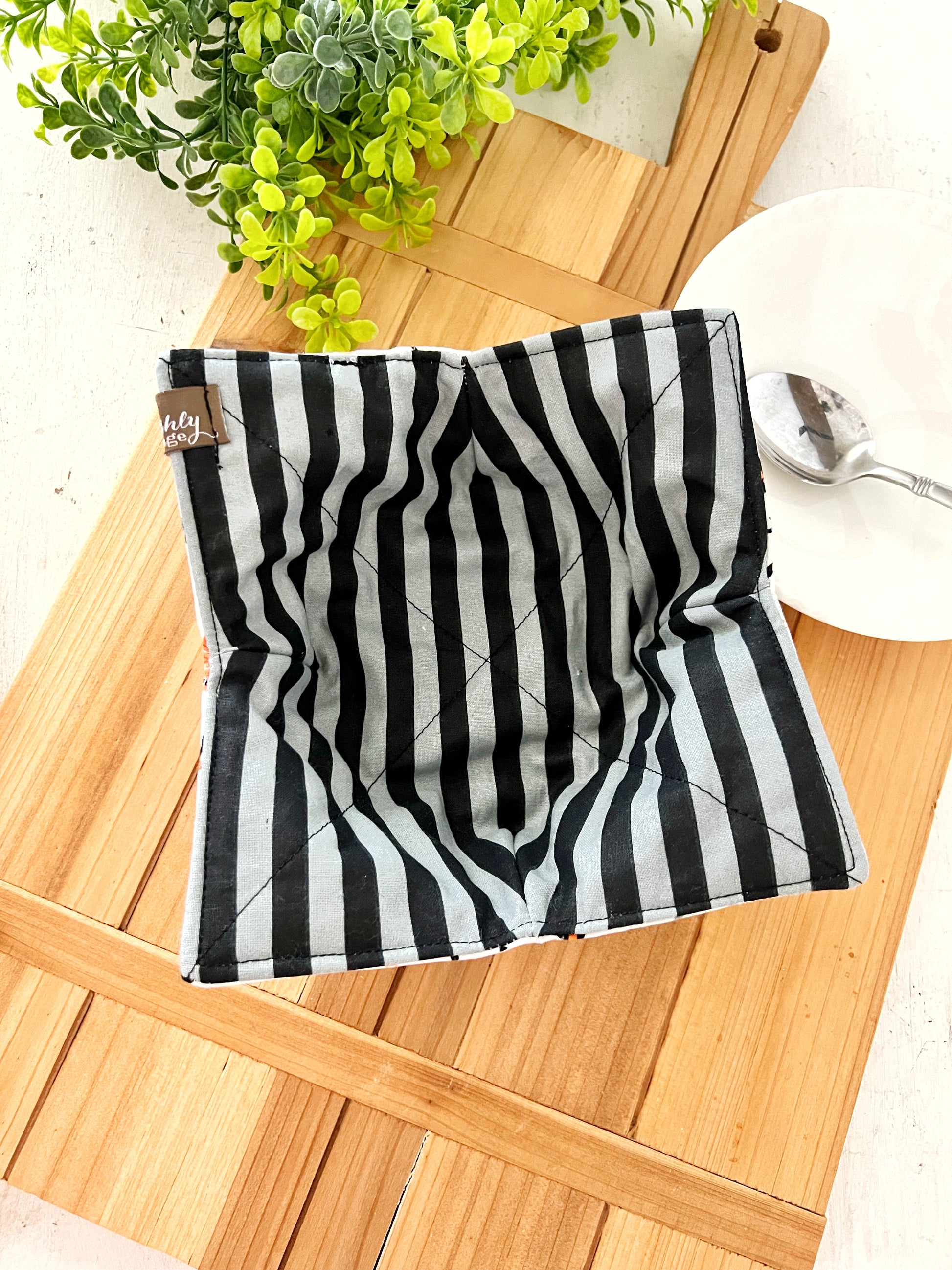 Save your hands from the heat or cold with our NEWEST microwave safe bowl cozy. This is the perfect partner for heating up your bowl of soup or dress up last night's leftovers or your favorite cold treat. Beautiful contrasting fabrics are sure to make those leftovers or ice cream taste better
