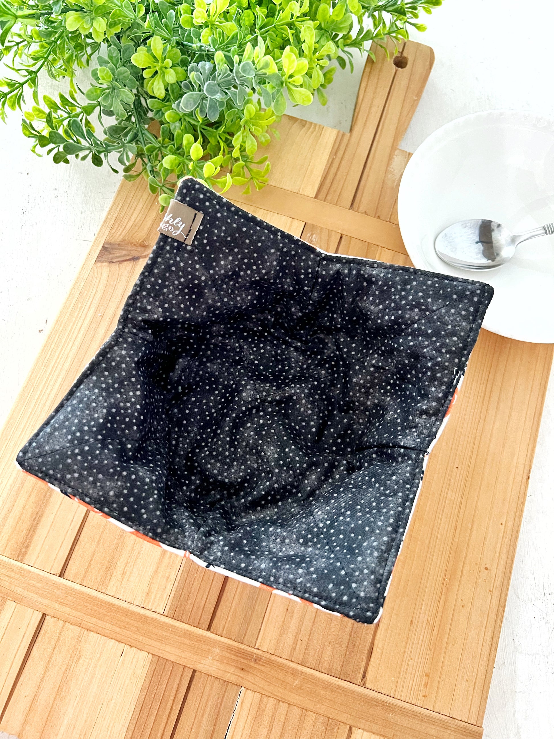 Save your hands from the heat or cold with our NEWEST microwave safe bowl cozy. This is the perfect partner for heating up your bowl of soup or dress up last night's leftovers or your favorite cold treat. Beautiful contrasting fabrics are sure to make those leftovers or ice cream taste better