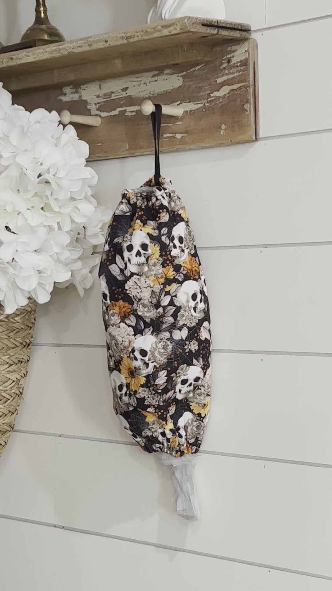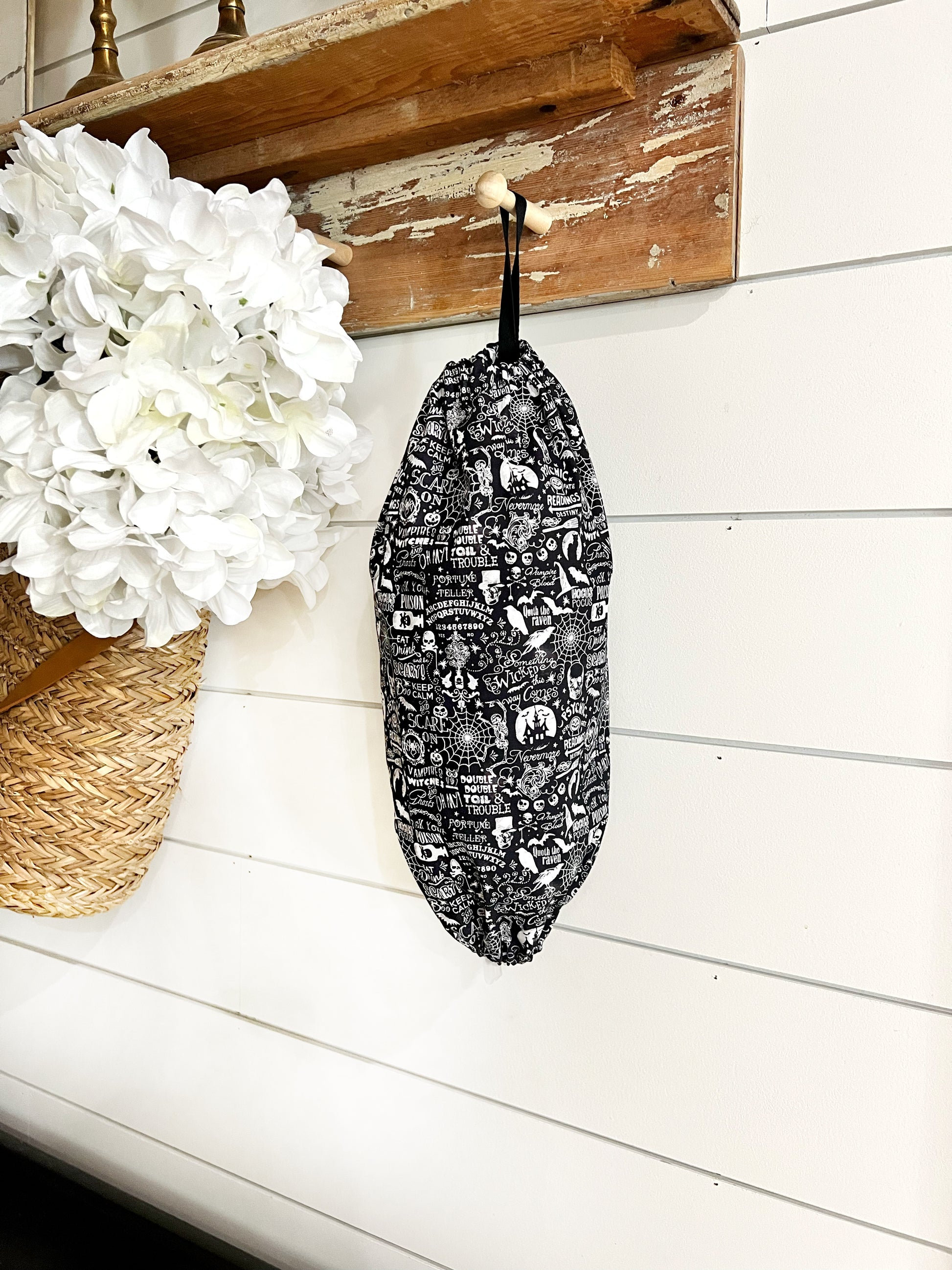 Get those plastic grocery bags organized with an adorable handmade bag dispenser. Stores 30+ plastic bags, depending on how you stuff them. Both top and bottom have elastic band sewn in to prevent bags from falling out.