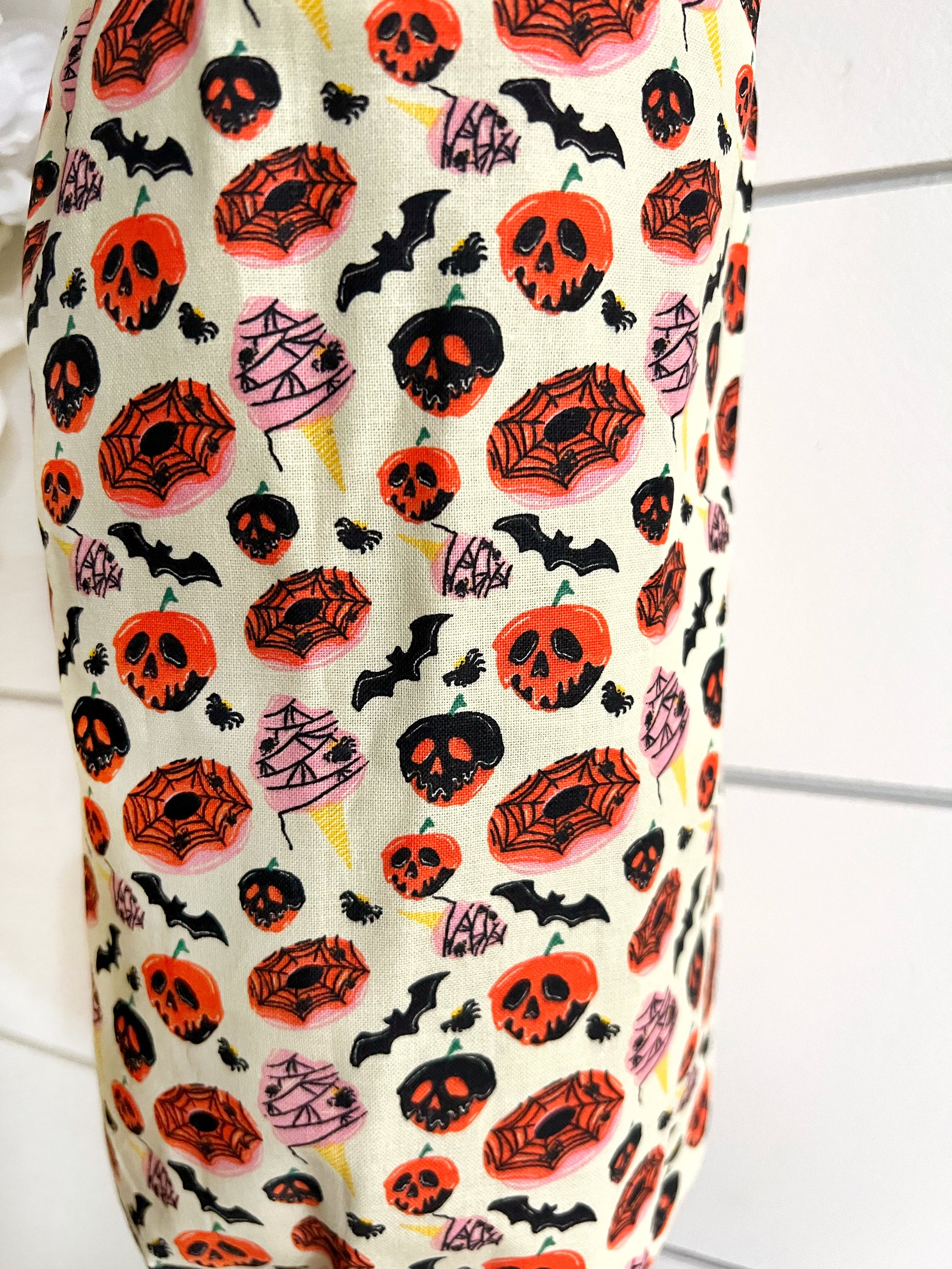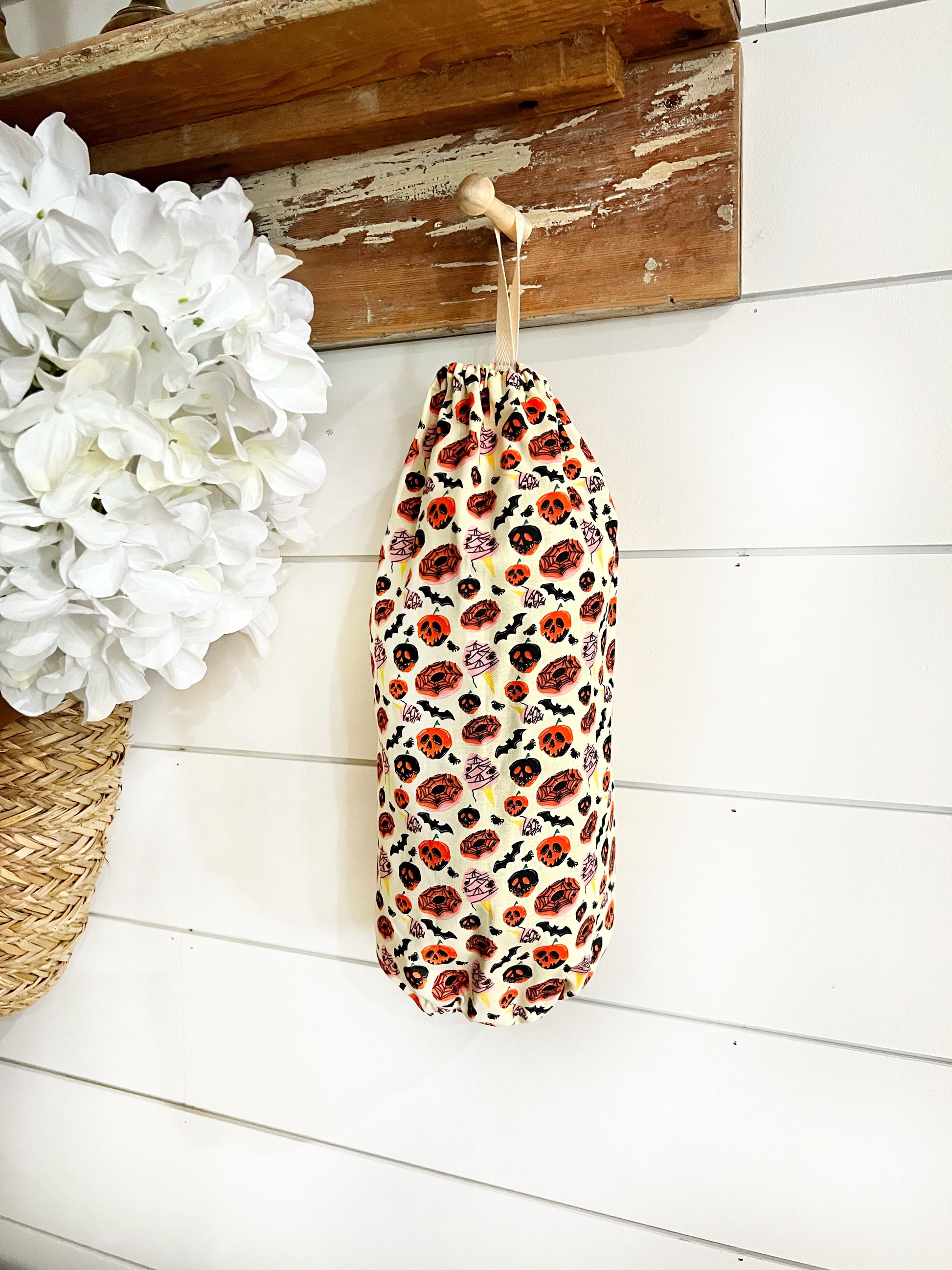 Get those plastic grocery bags organized with an adorable handmade bag dispenser. Stores 30+ plastic bags, depending on how you stuff them. Both top and bottom have elastic band sewn in to prevent bags from falling out.