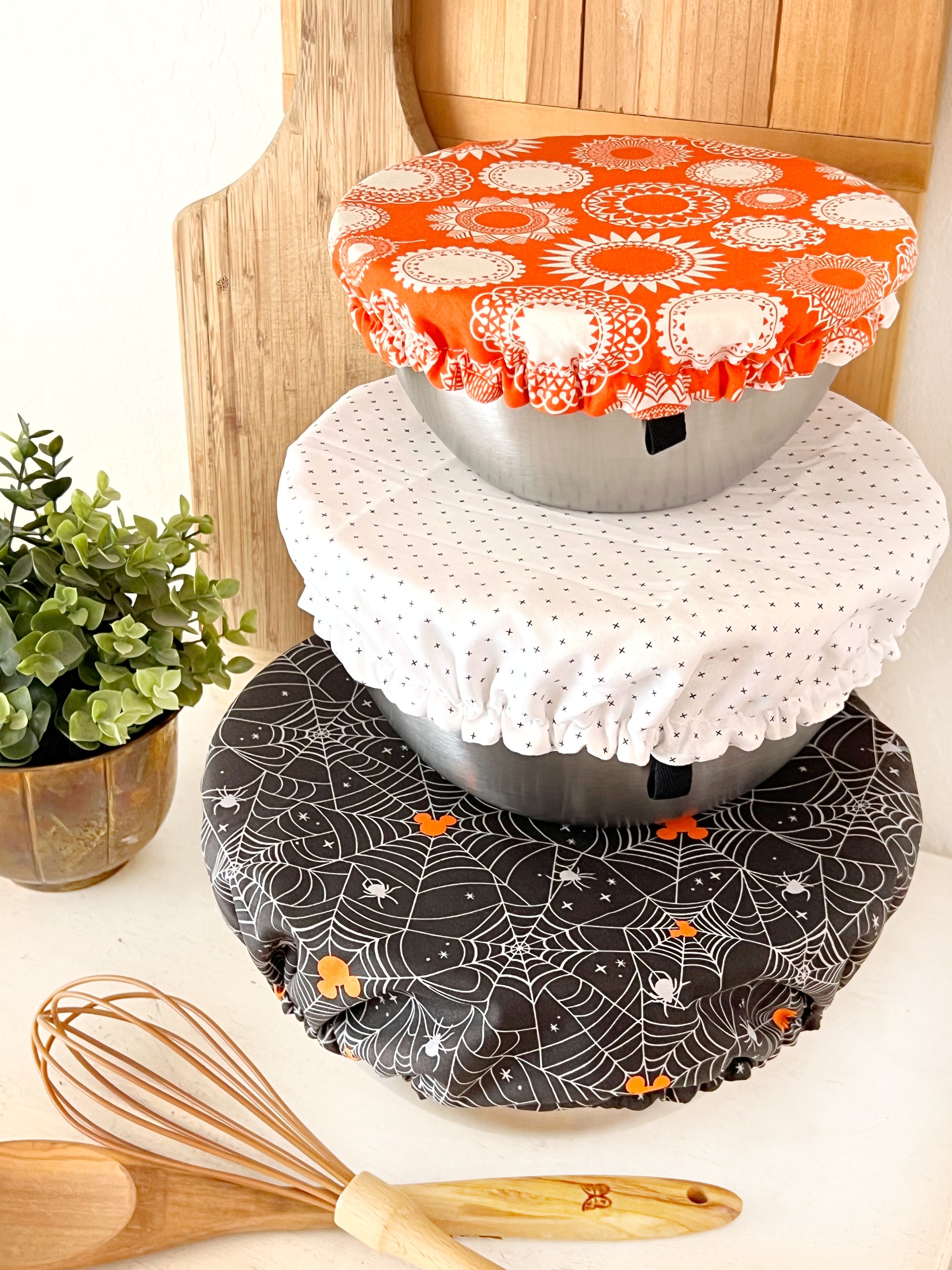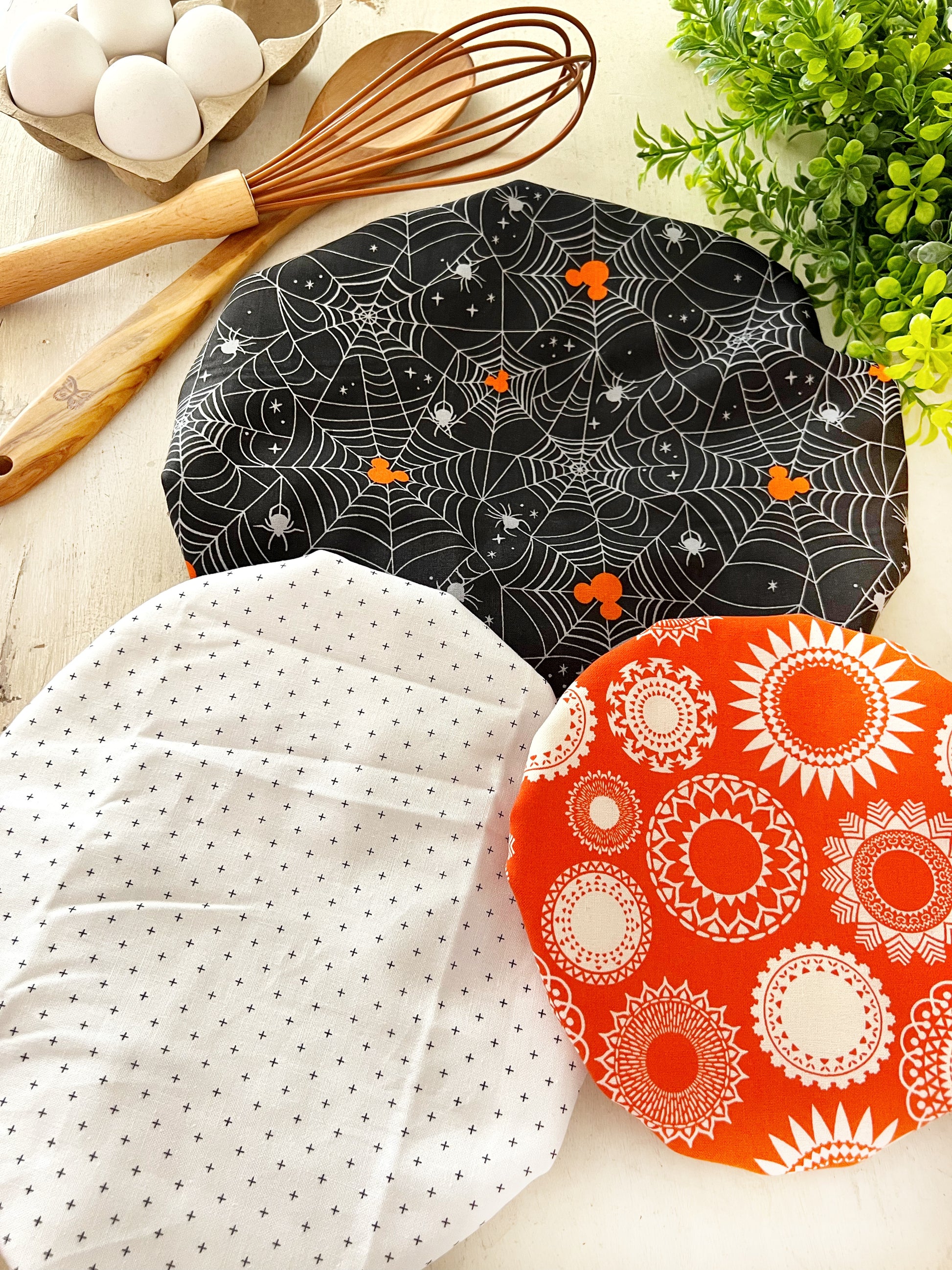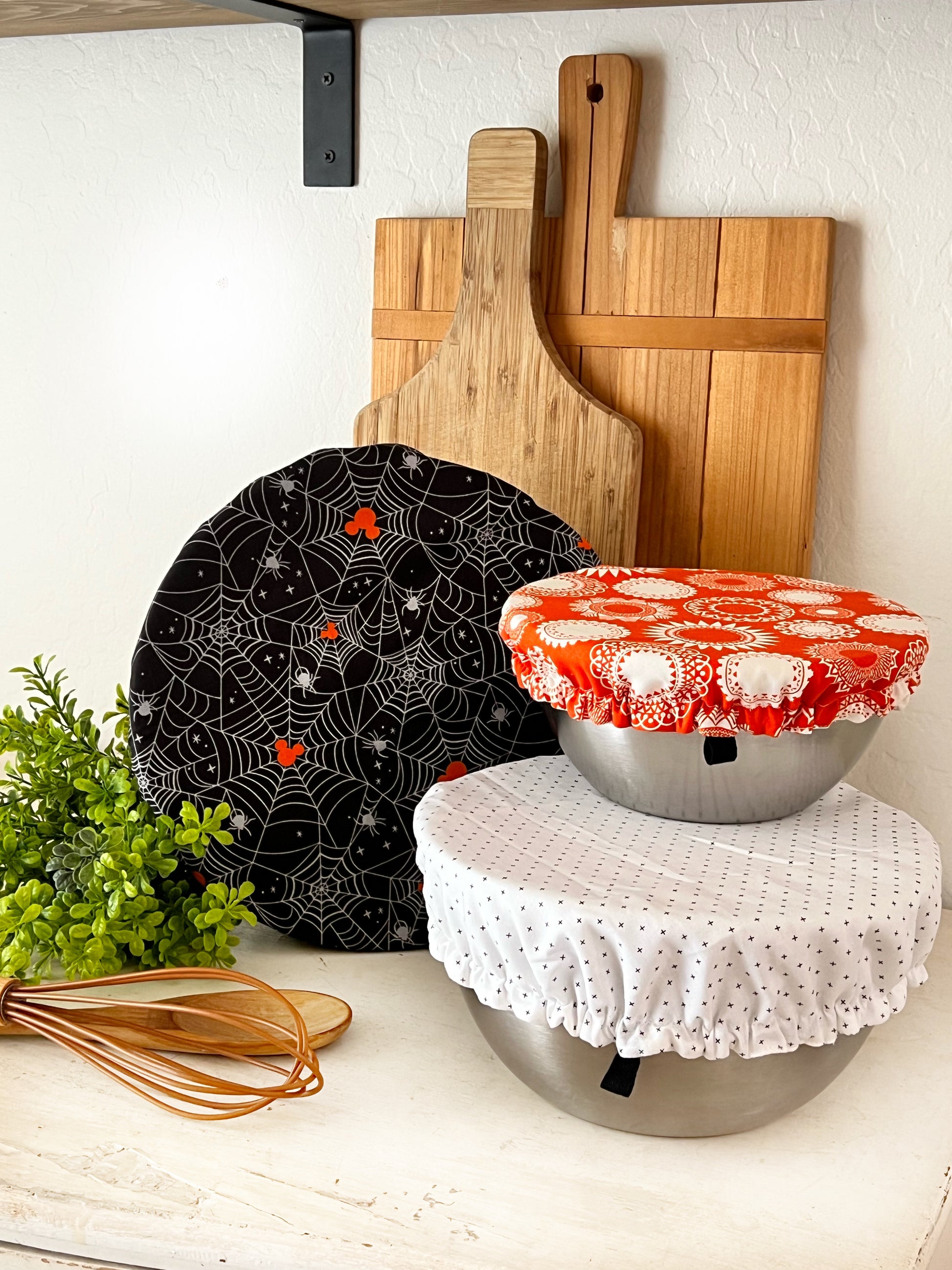 Going Green? We've got you covered. This is a set of three reusable, hand crafted bowl coverings. Replace plastic wrap with these airtight, attractive bowl covers. Simply machine wash and pop them in the dryer to re-use for years to come. This specialty fabric is water and odor resistant and will keep your foods fresh for days. The elastic band holds tight and allows coverage for bowls 5-10” inches in diameter.