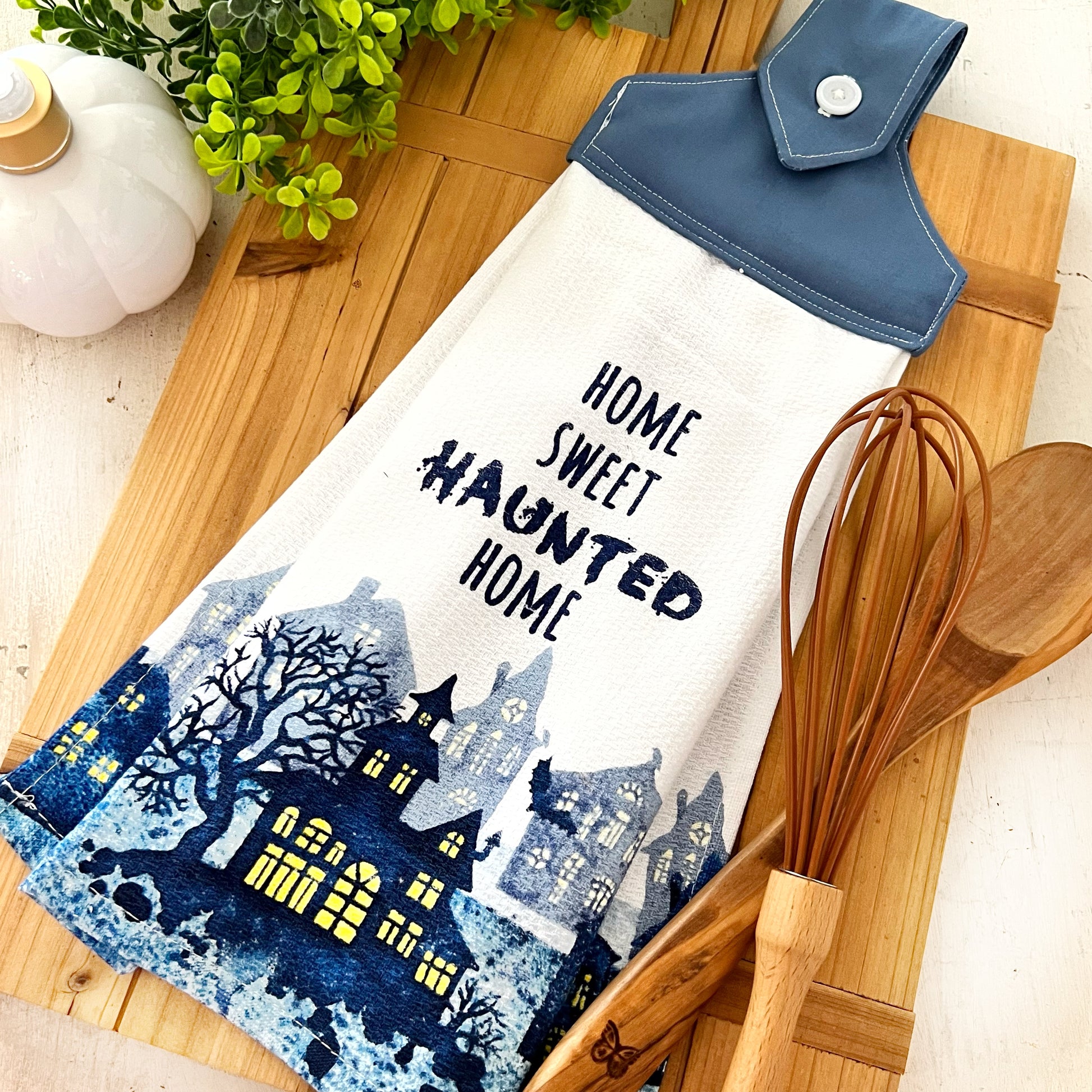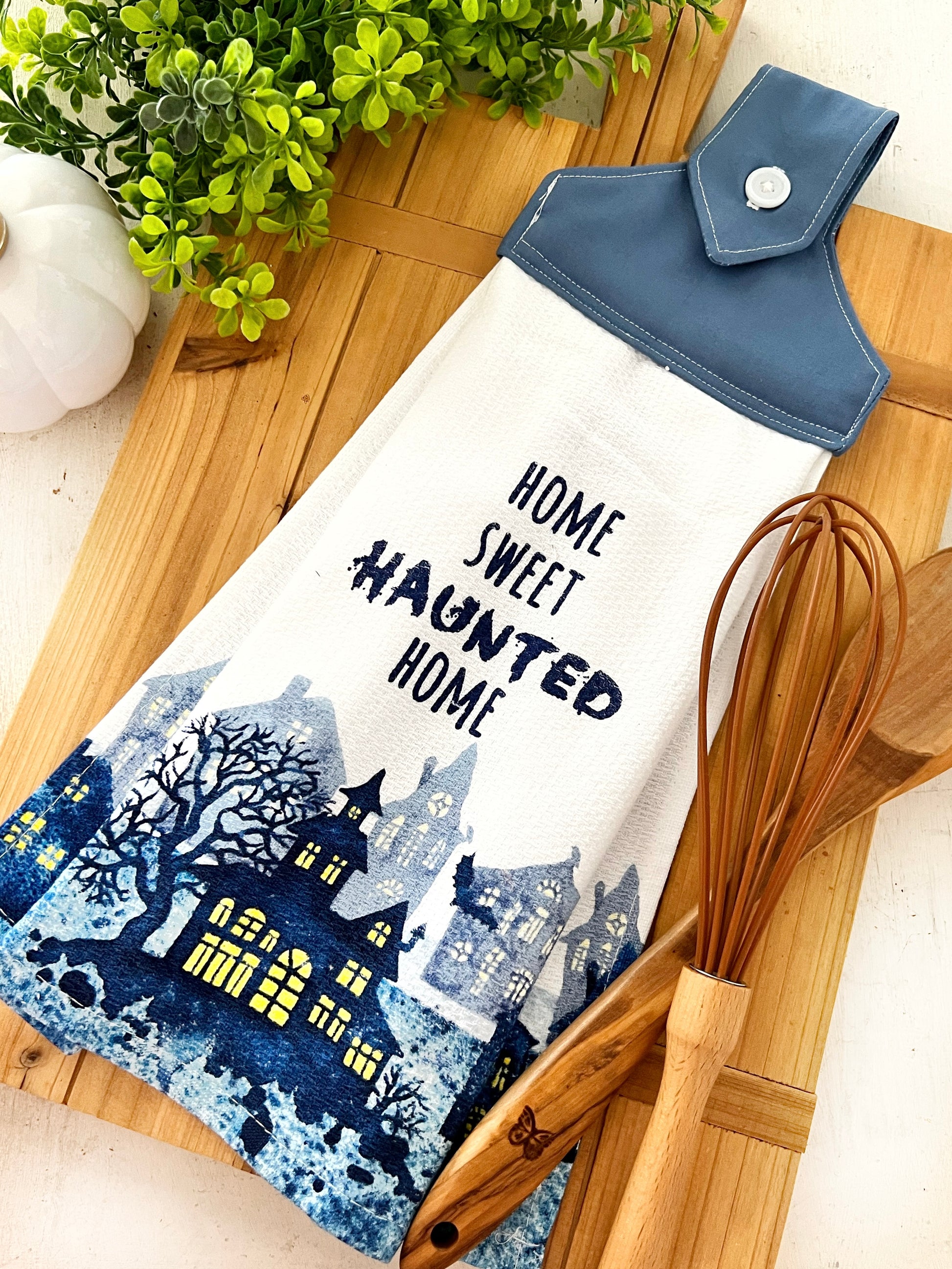 Handmade kitchen hand towel that stays secure with a button and hangs perfectly on an oven handle, dishwasher handle, or towel bar. This towel adds a lovely functional decorative touch to your kitchen. It also makes the perfect housewarming, bridal, or wedding gift. This hanging towel ensures that you always know where your towel is.