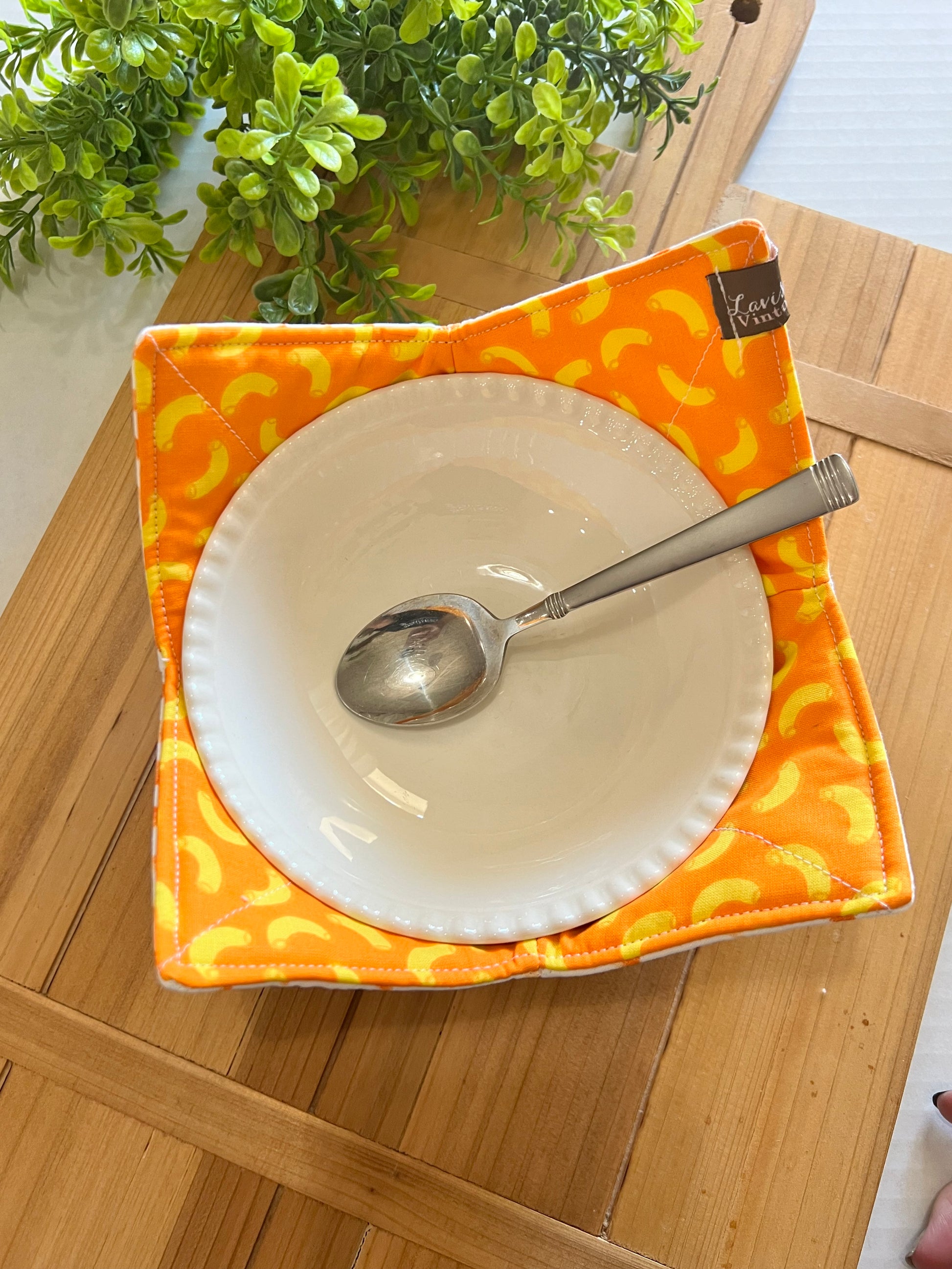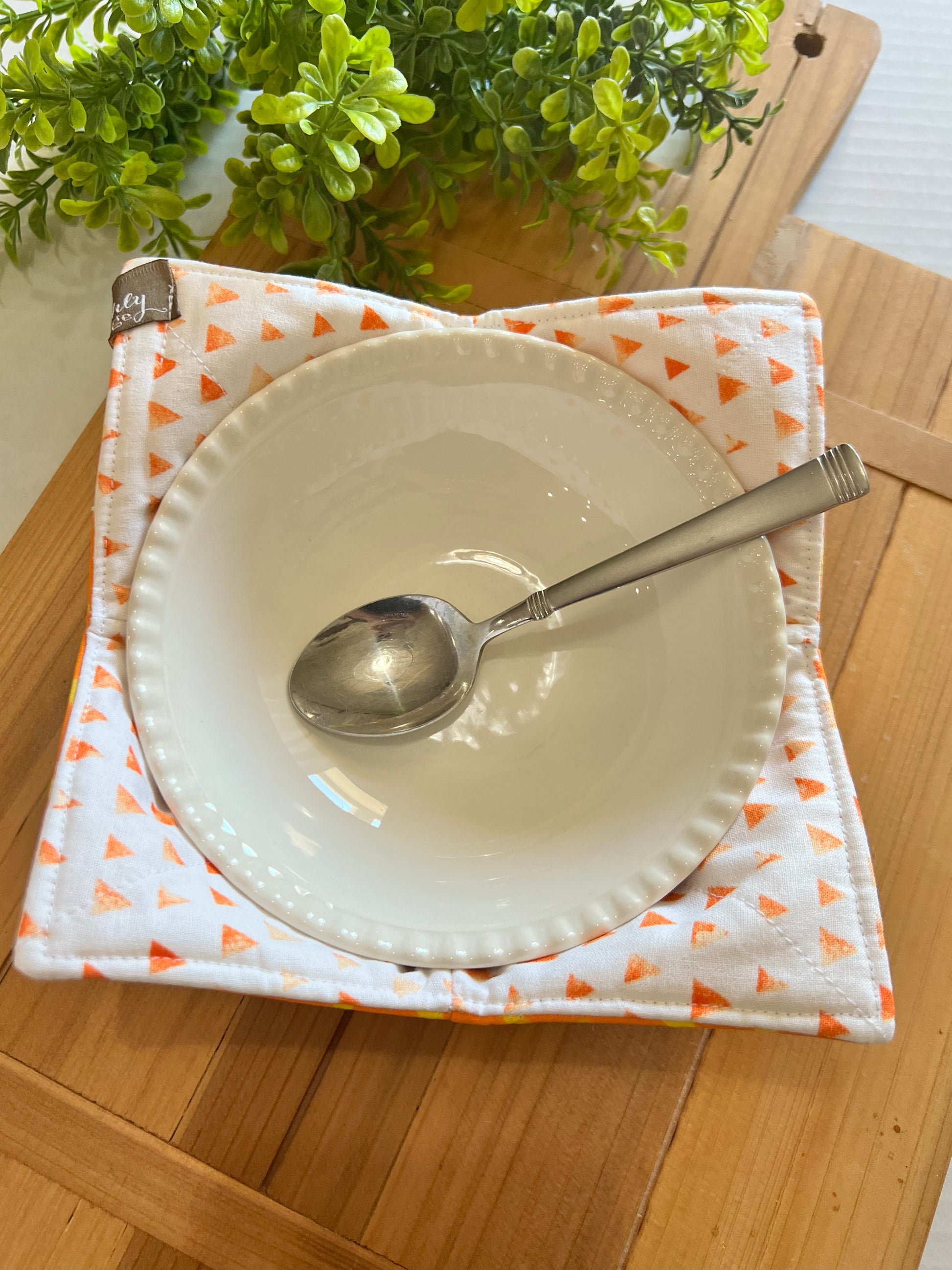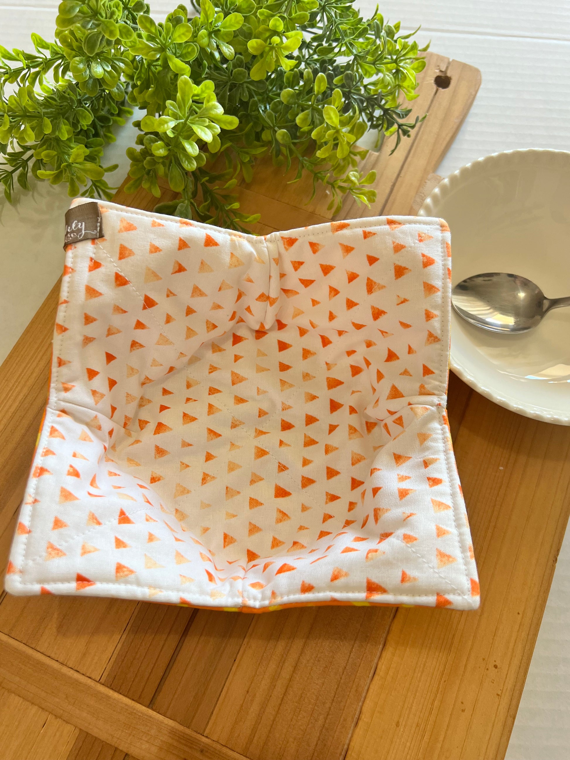 Save your hands from the heat or cold with our NEWEST microwave safe bowl cozy. This is the perfect partner for heating up your bowl of soup or dress up last night's leftovers or your favorite cold treat. Beautiful contrasting fabrics are sure to make those leftovers or ice cream taste better