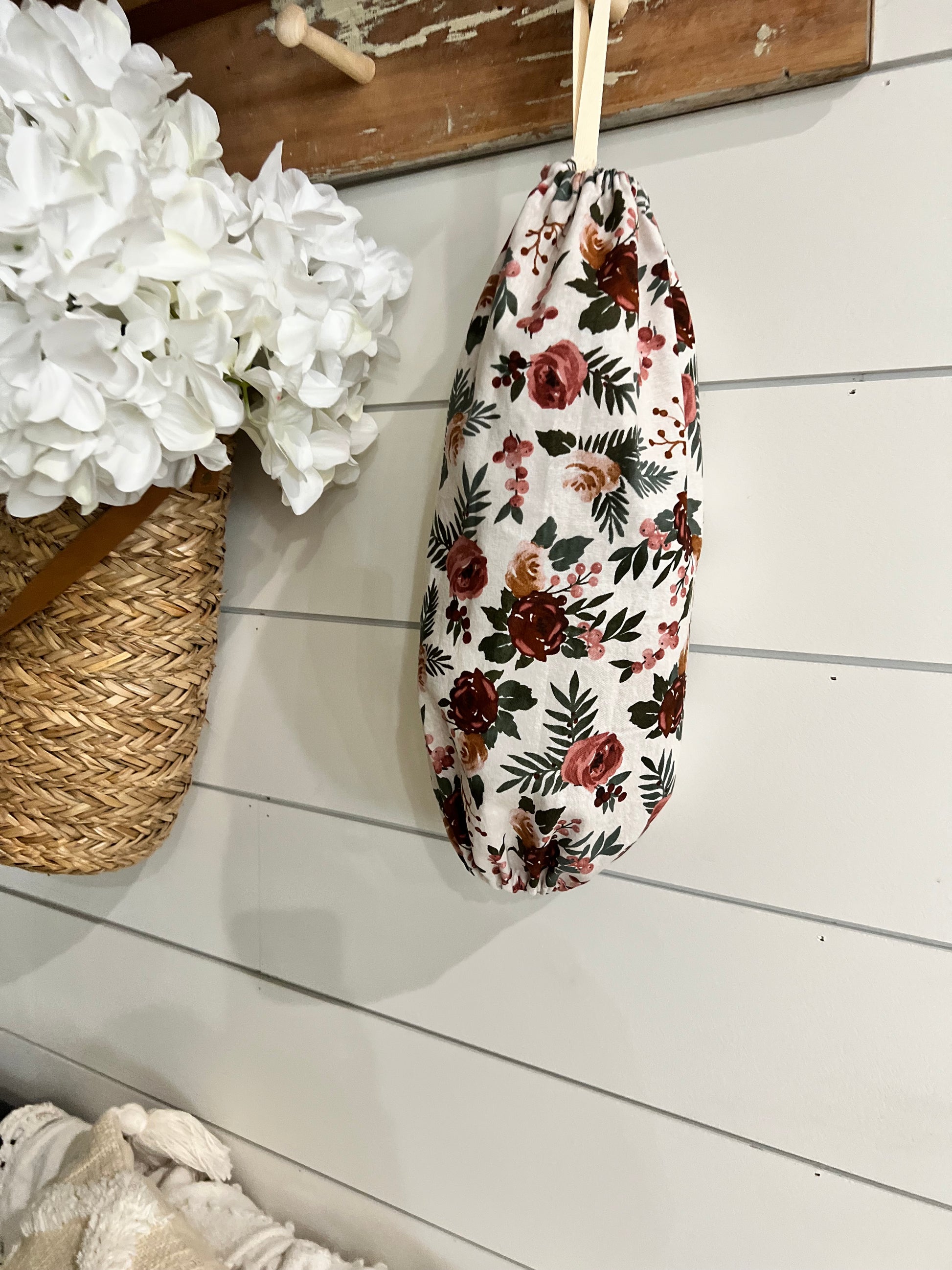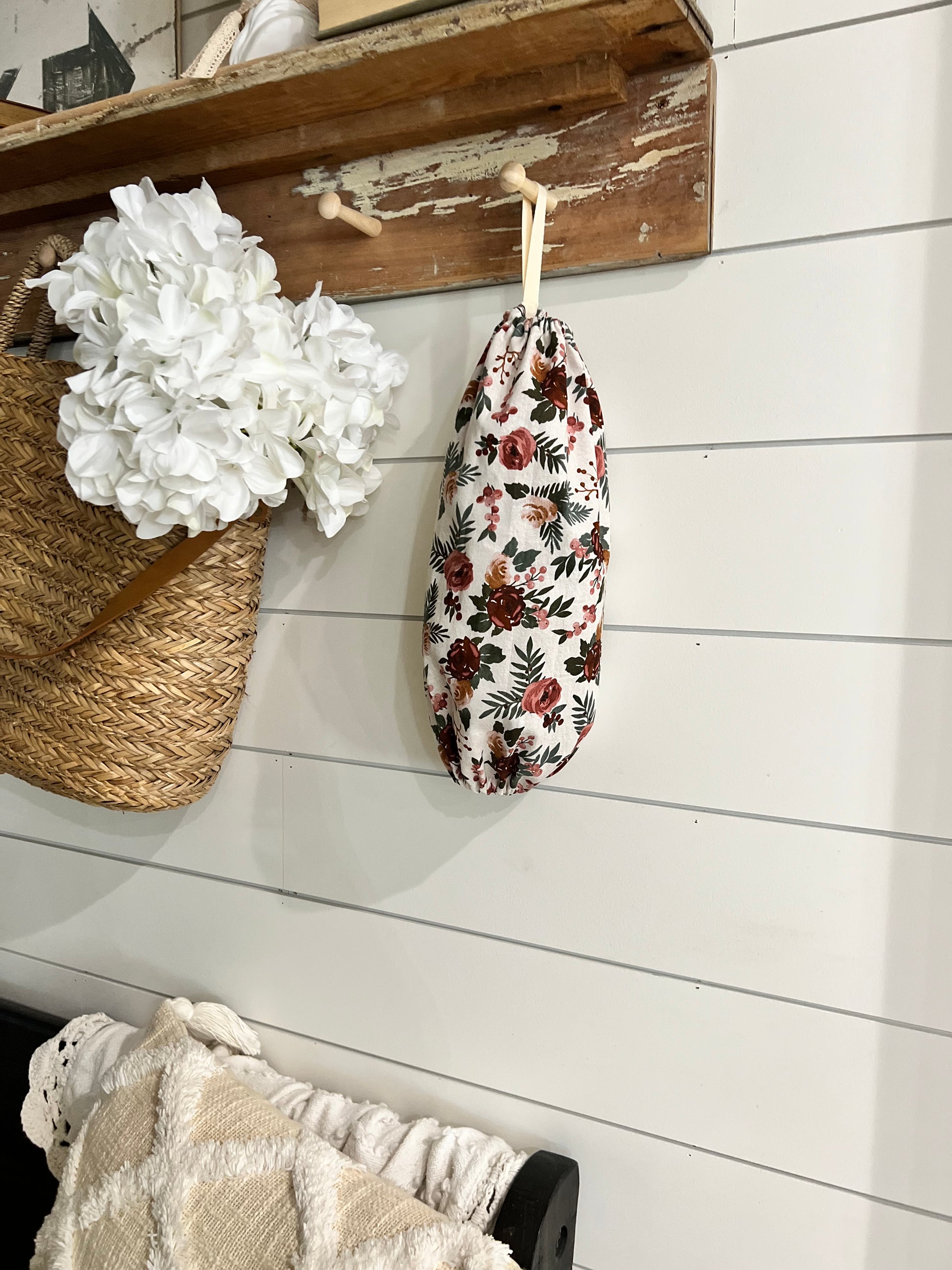 Get those plastic grocery bags organized with an adorable handmade bag dispenser. Stores 30+ plastic bags, depending on how you stuff them. Both top and bottom have elastic band sewn in to prevent bags from falling out.