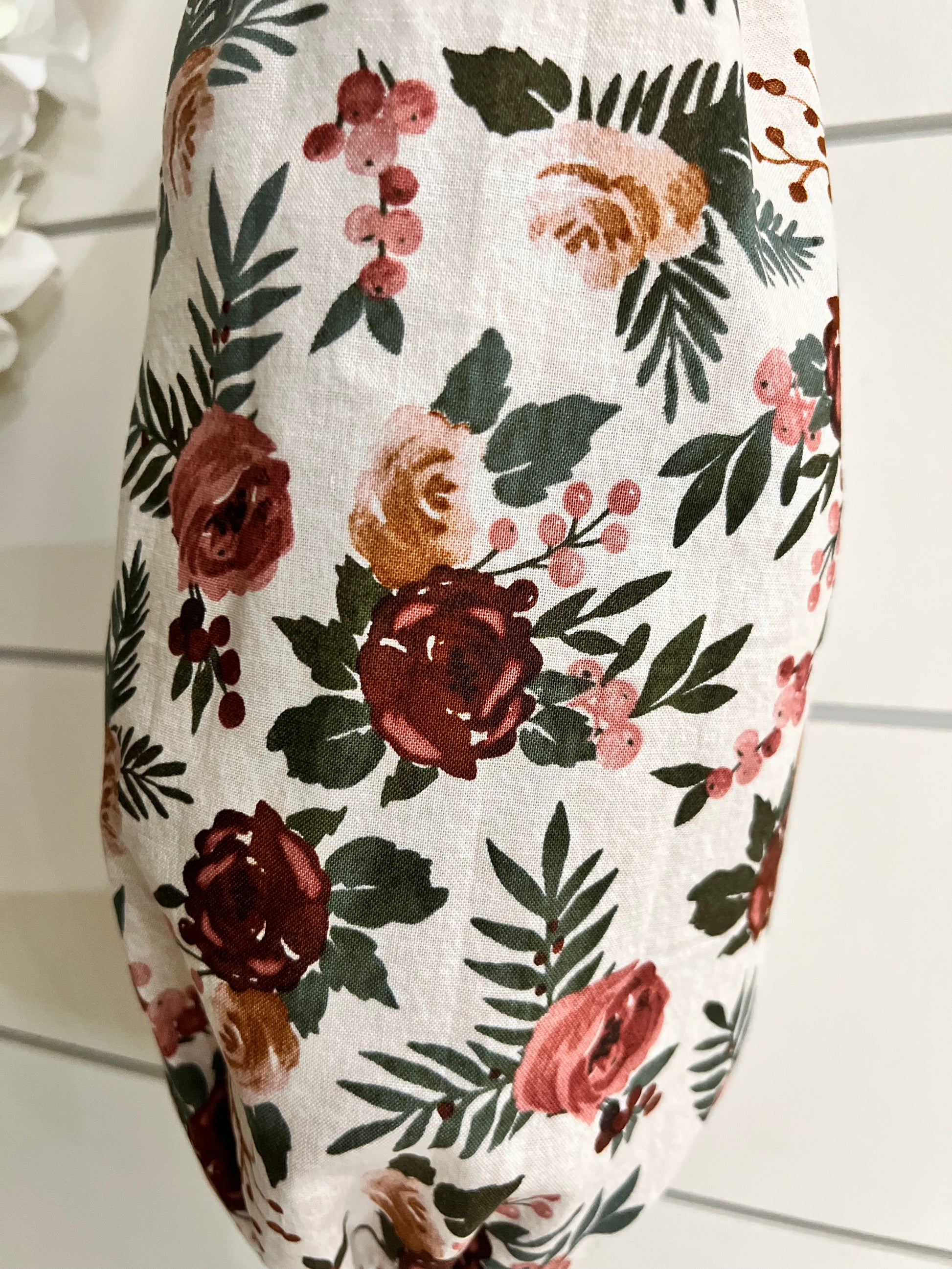 The fabric is 100% cotton and measures approximately 6.5" wide X 17" long. Top and bottom of dispenser have elastic band sewn in, that allows you to easily reach in to grab the plastic bags.