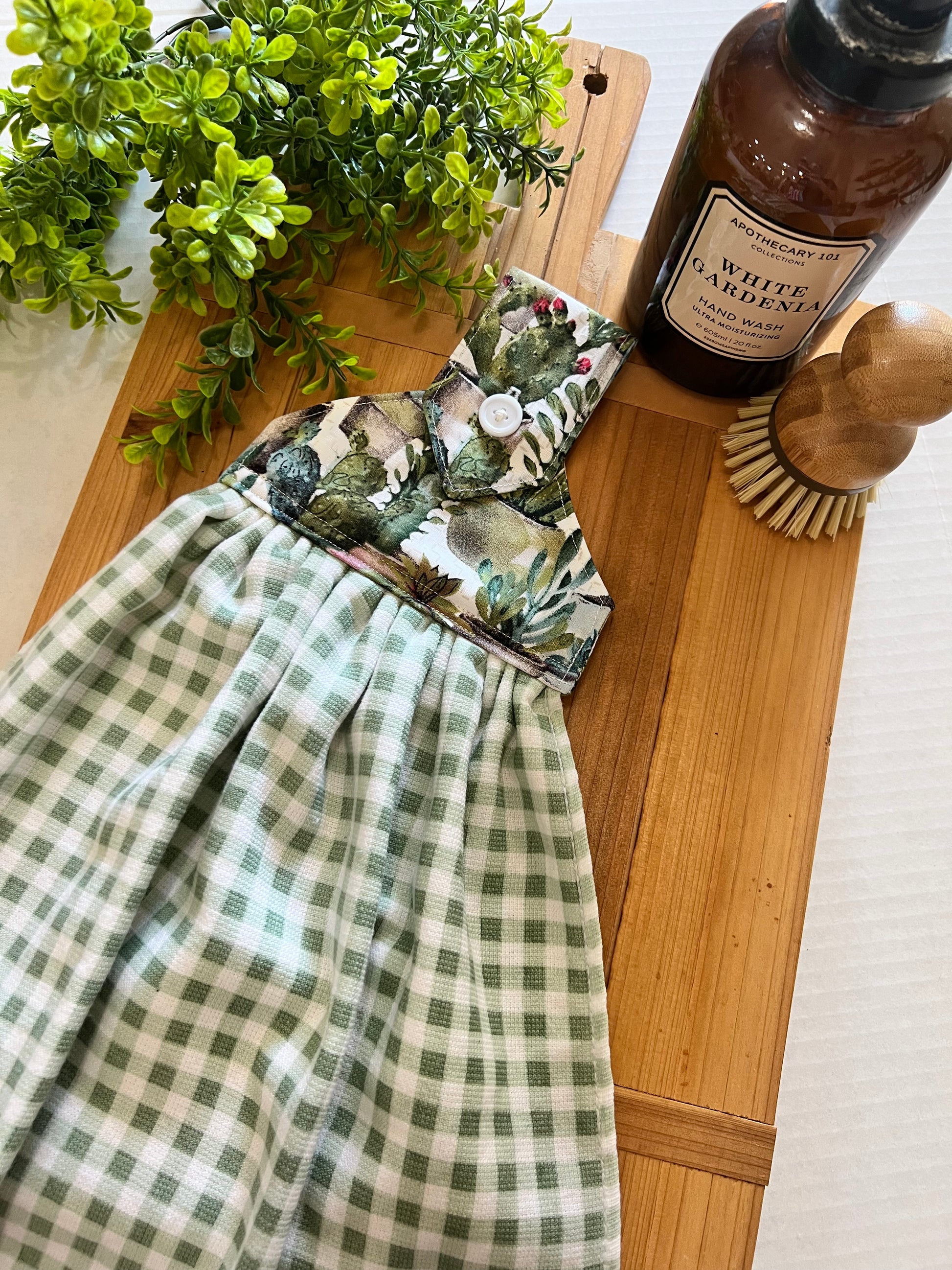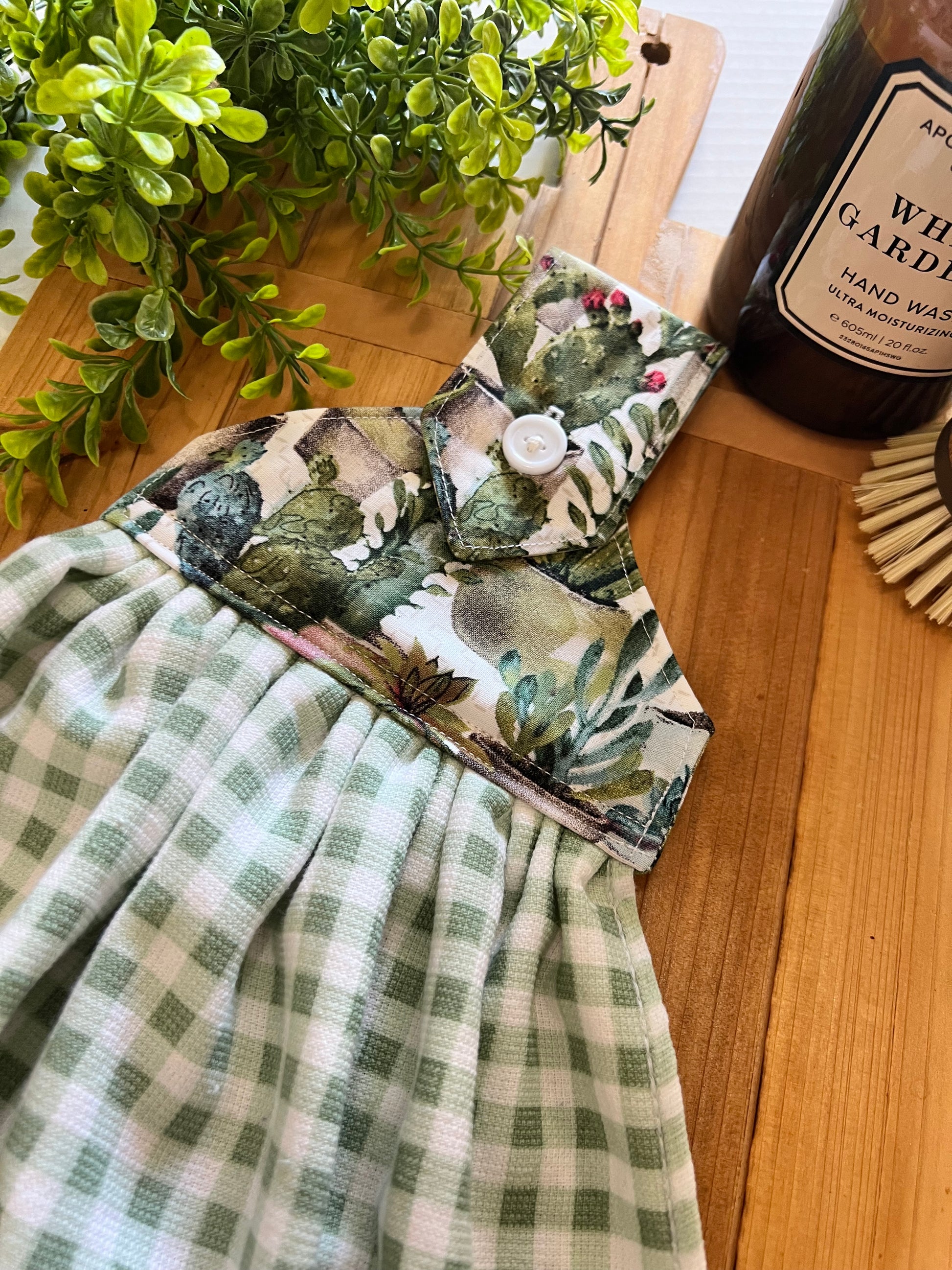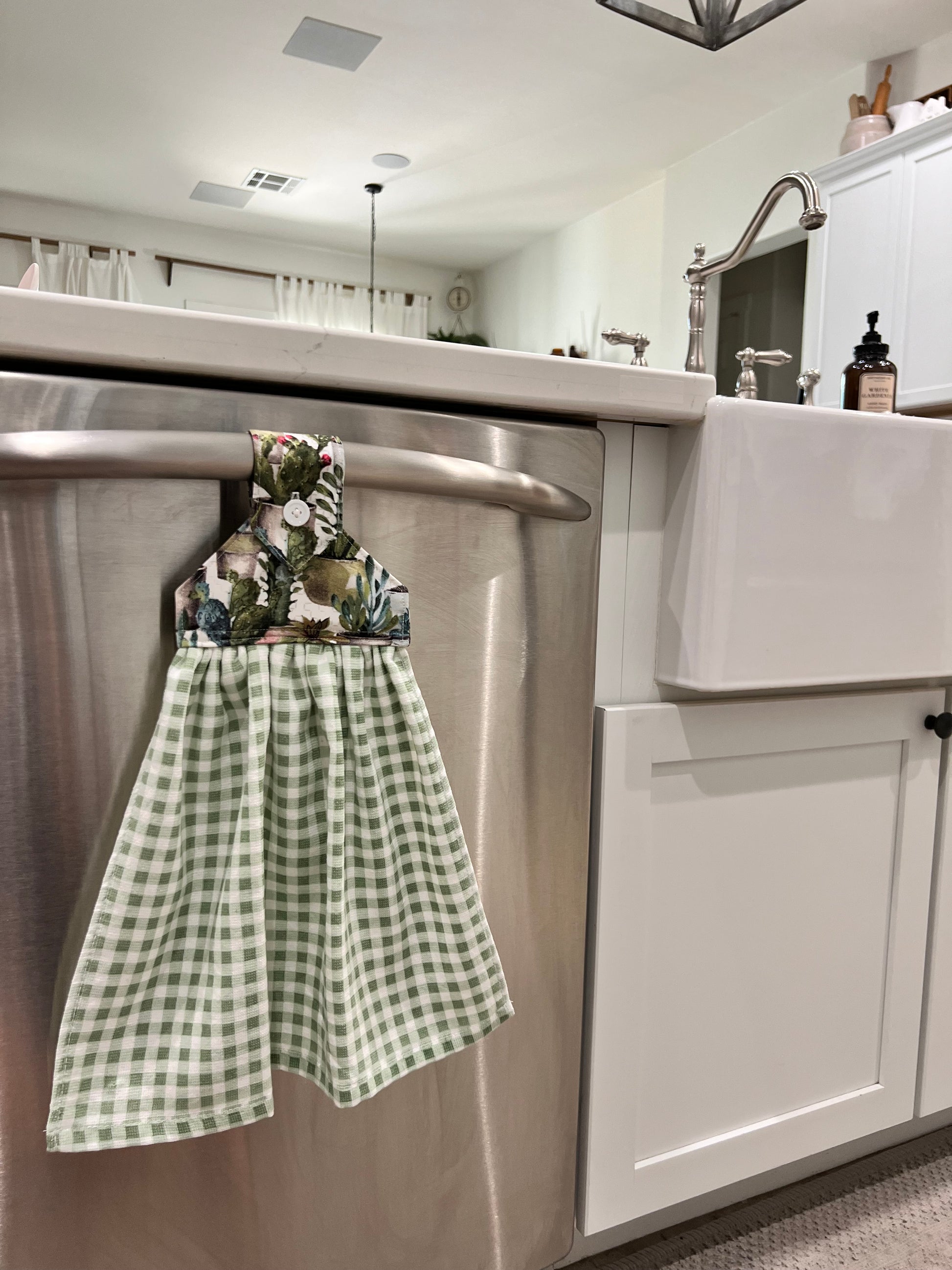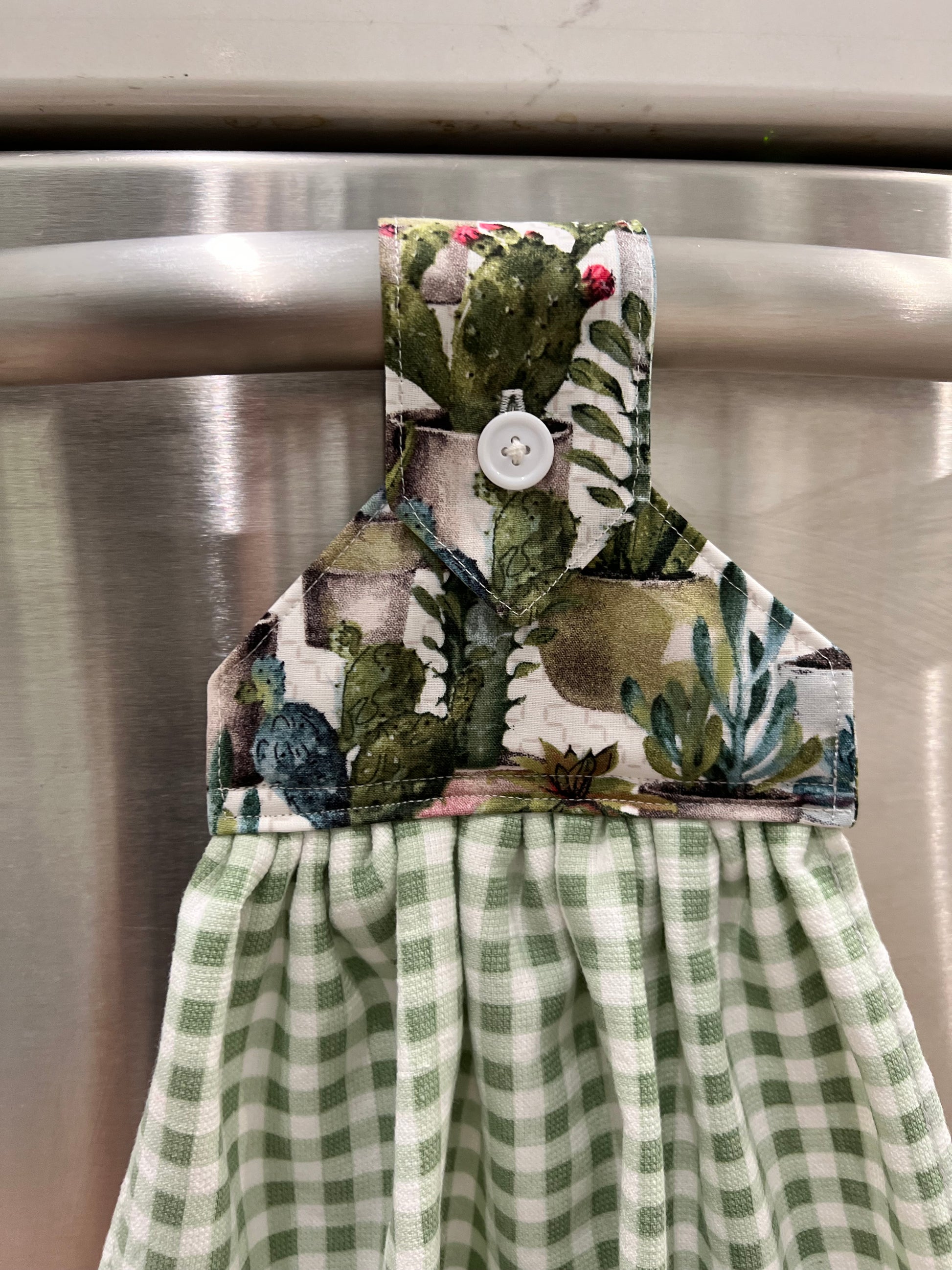 Handmade kitchen hand towel that stays secure with a button and hangs perfectly on an oven handle, dishwasher handle, or towel bar. This towel adds a lovely functional decorative touch to your kitchen. It also makes the perfect housewarming, bridal, or wedding gift. This hanging towel ensures that you always know where your towel is.