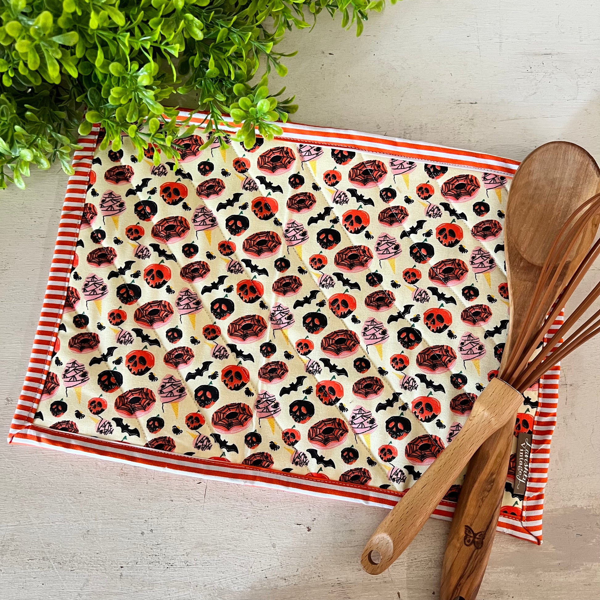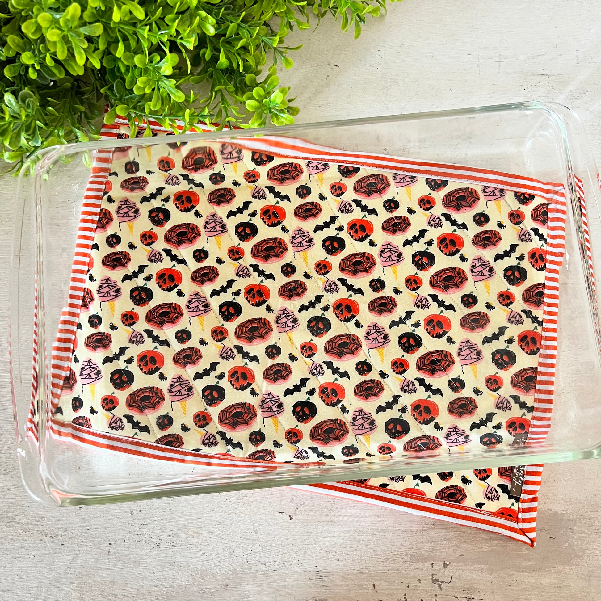Perfect for your holiday table! This 10"x14" hot pad that fits perfectly under your casserole dish or cookie sheet! Will eliminate the need for two small hot pads!
