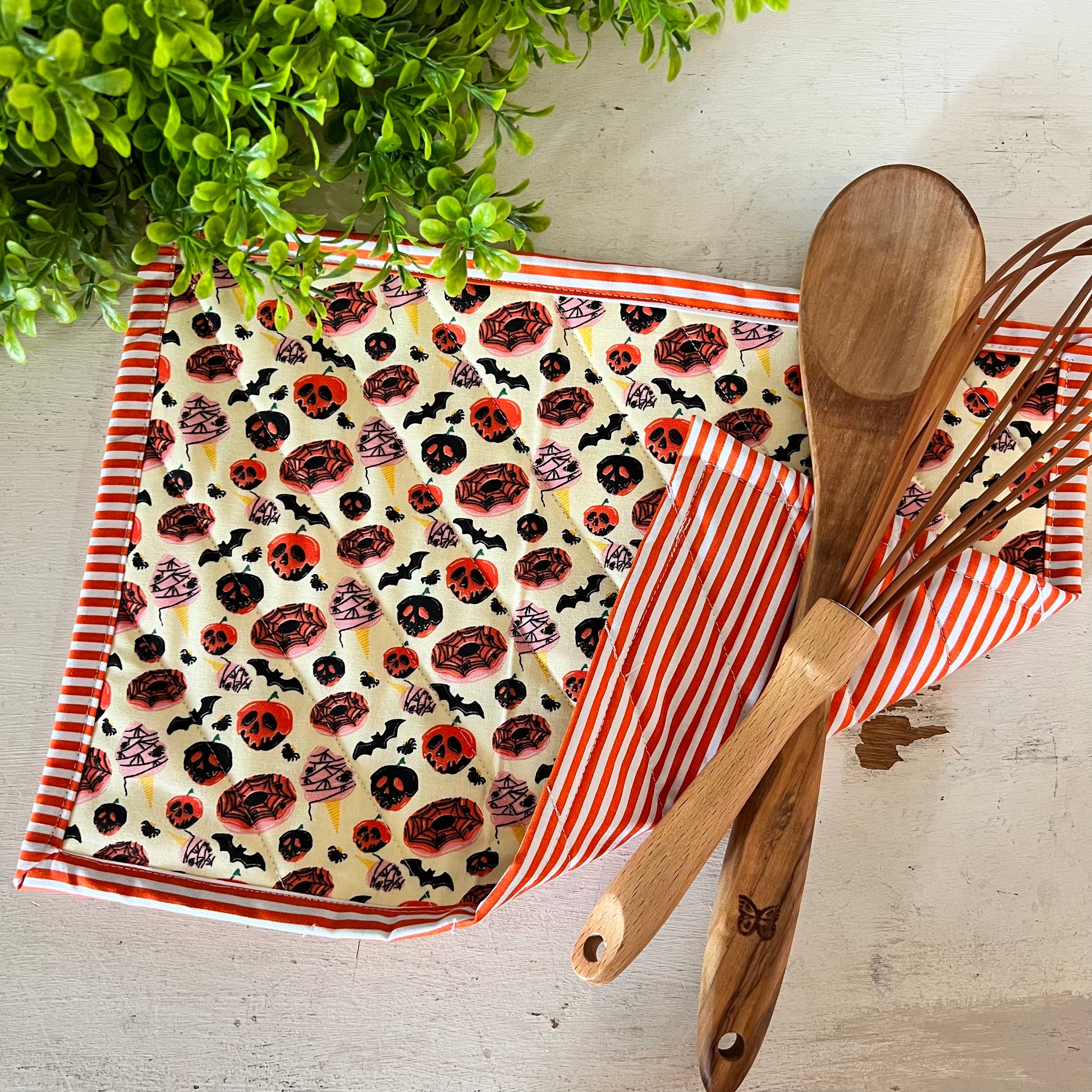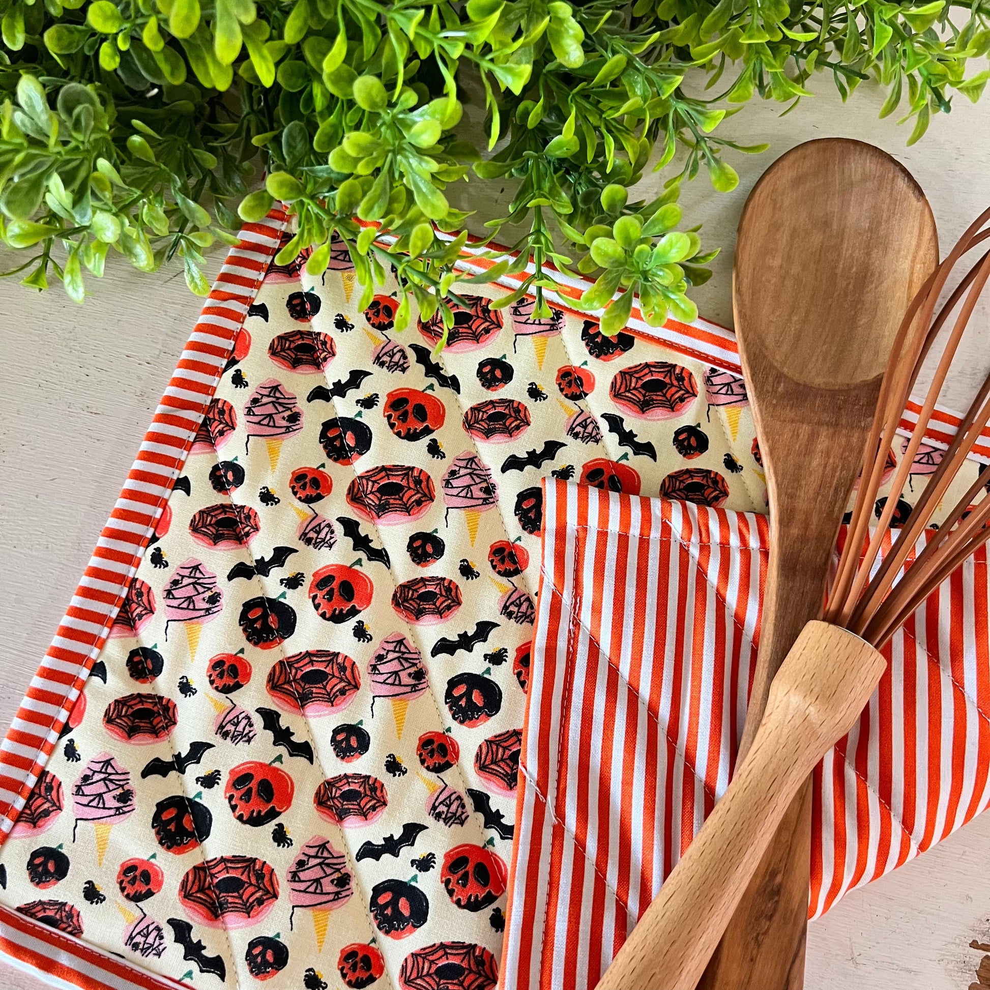 Each hot pad measures 10"x14" and are made with two coordinating cotton fabrics, and TWO layers of cotton batting. It is machine washable and reversible! See other listing for various designs available.