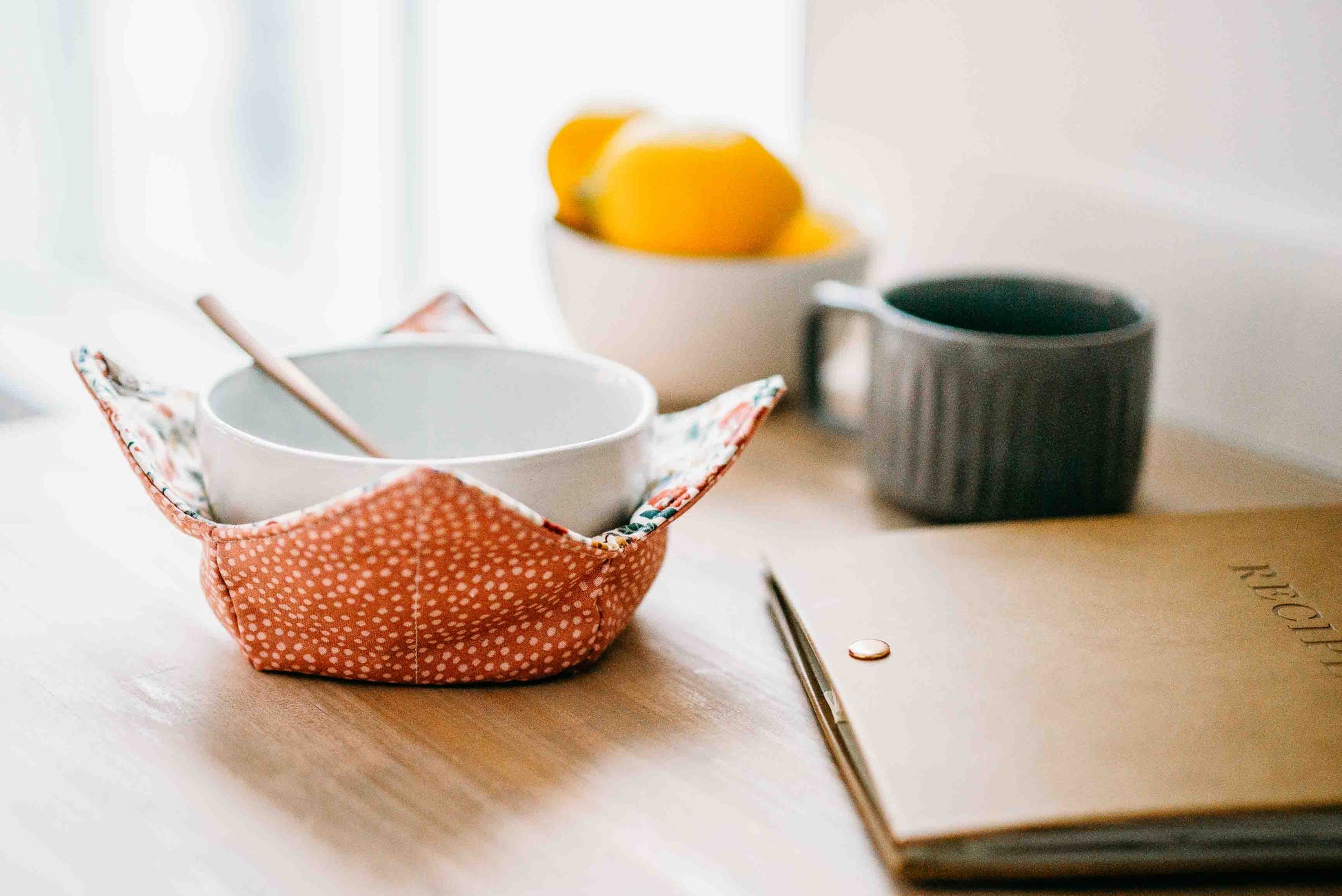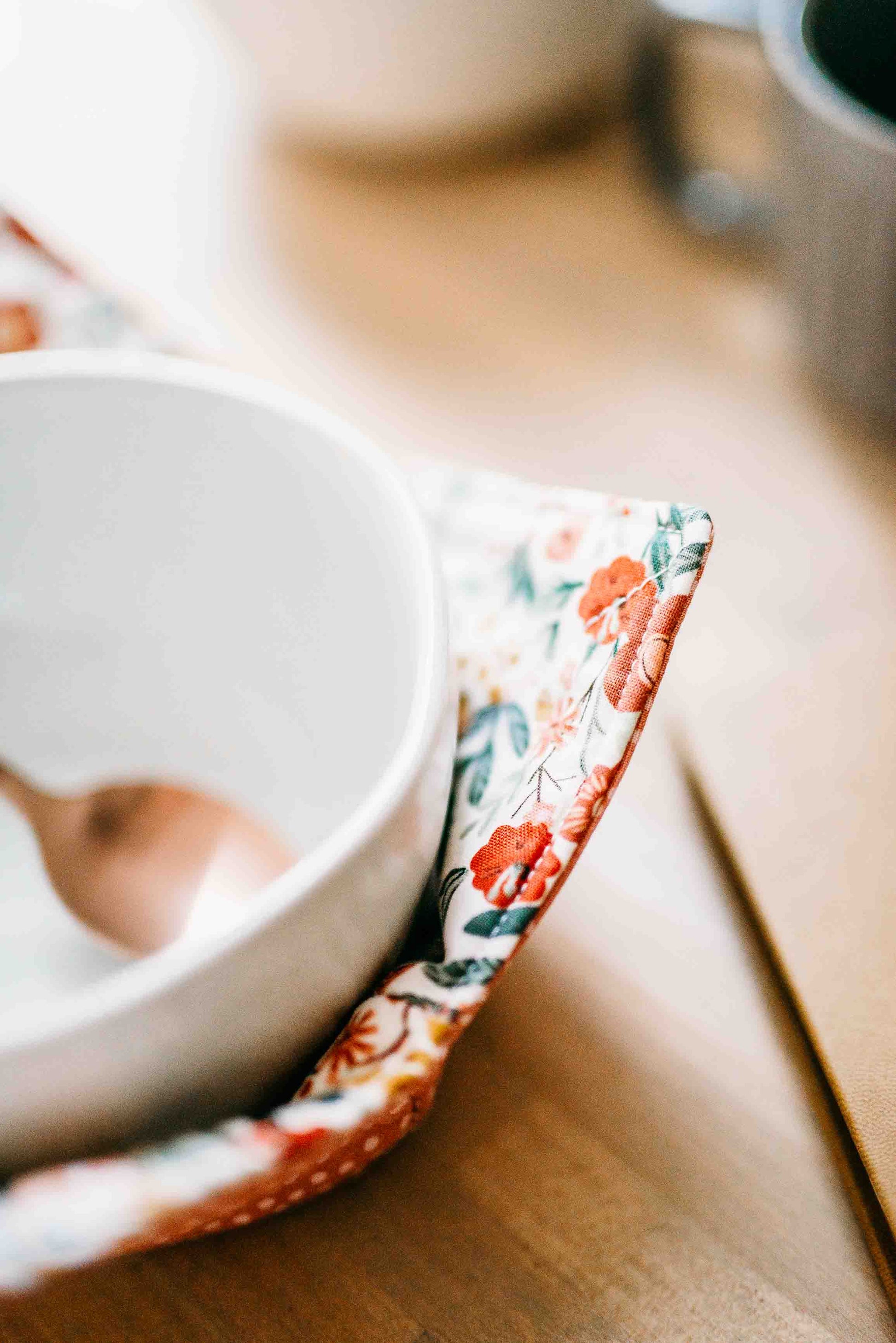Save your hands from the heat or cold with our NEWEST microwave safe bowl cozy. This is the perfect partner for heating up your bowl of soup or dress up last night's leftovers or your favorite cold treat. Beautiful contrasting fabrics are sure to make those leftovers or ice cream taste better