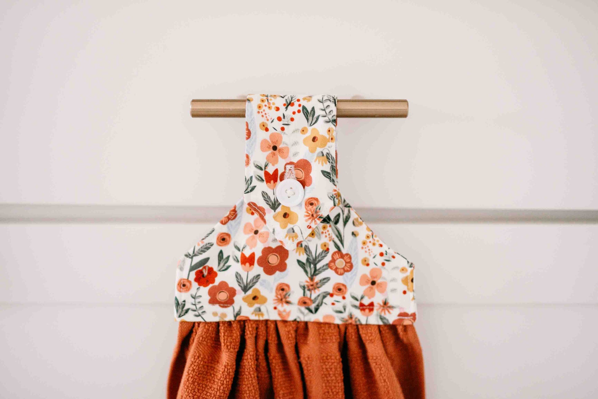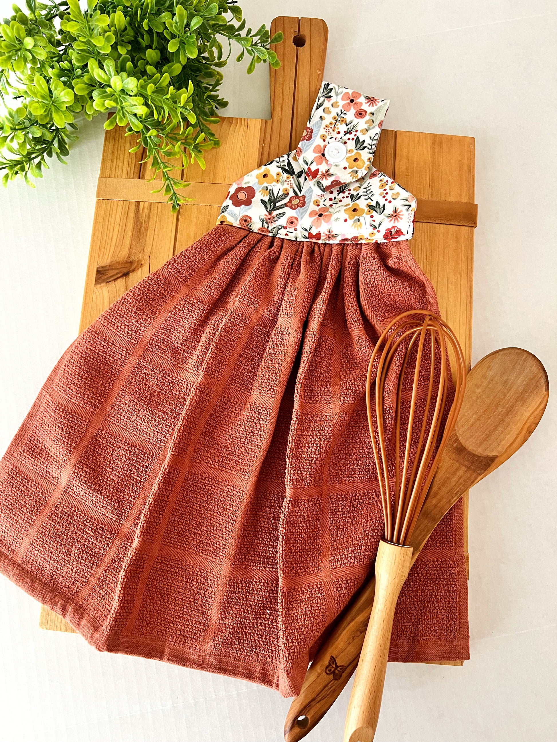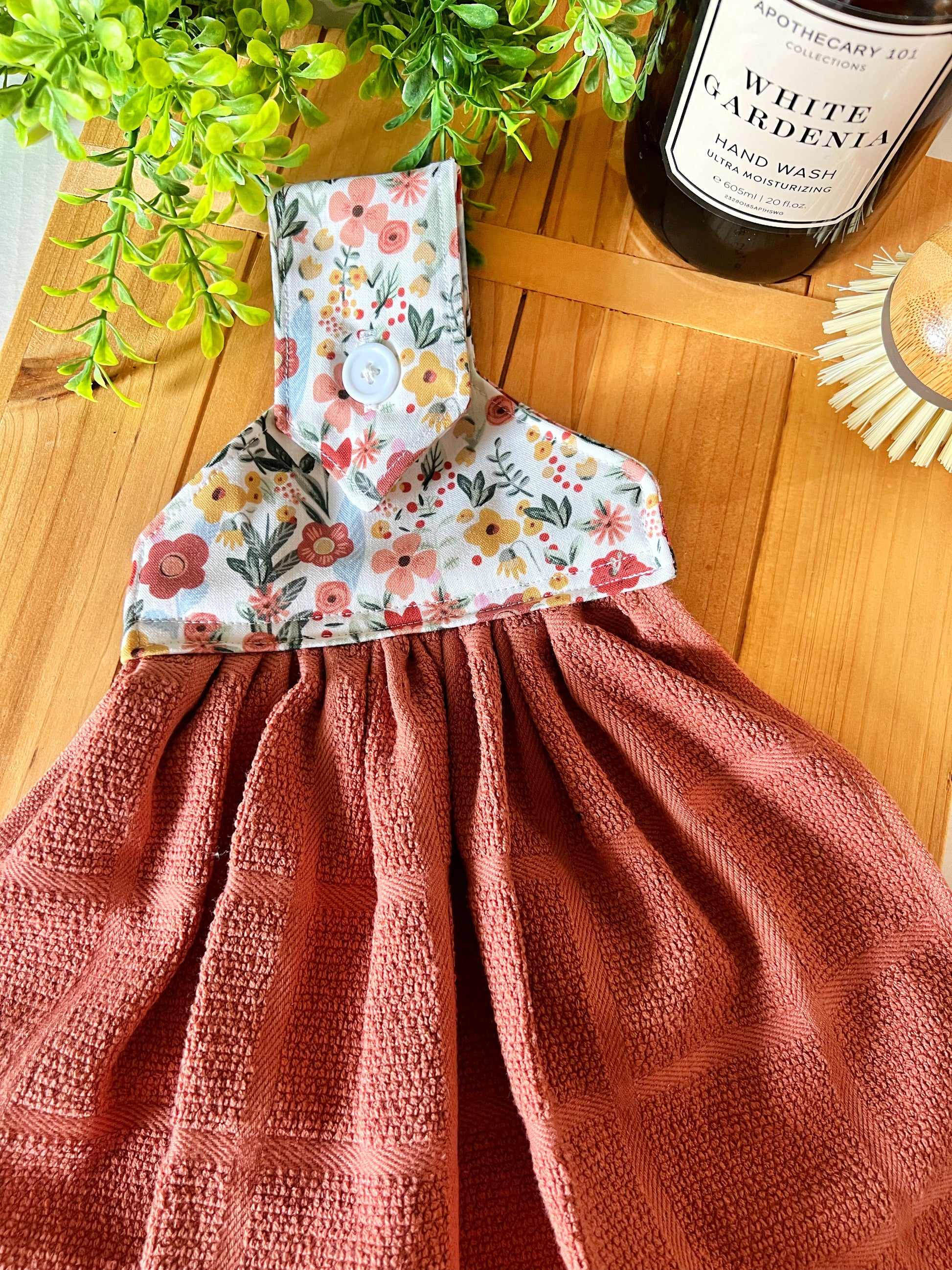 Handmade kitchen hand towel that stays secure with a button and hangs perfectly on an oven handle, dishwasher handle, or towel bar. This towel adds a lovely functional decorative touch to your kitchen. It also makes the perfect housewarming, bridal, or wedding gift. This hanging towel ensures that you always know where your towel is.