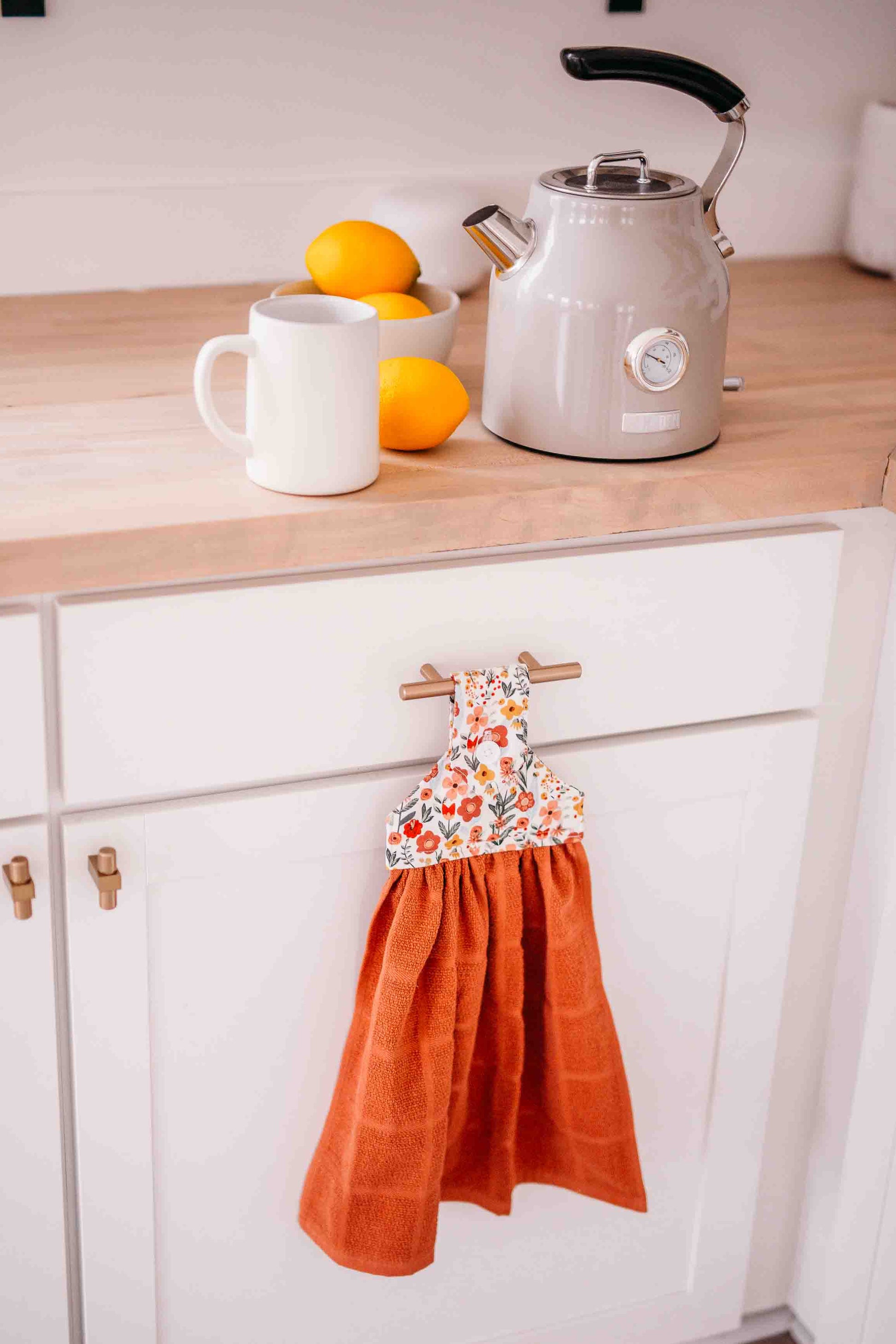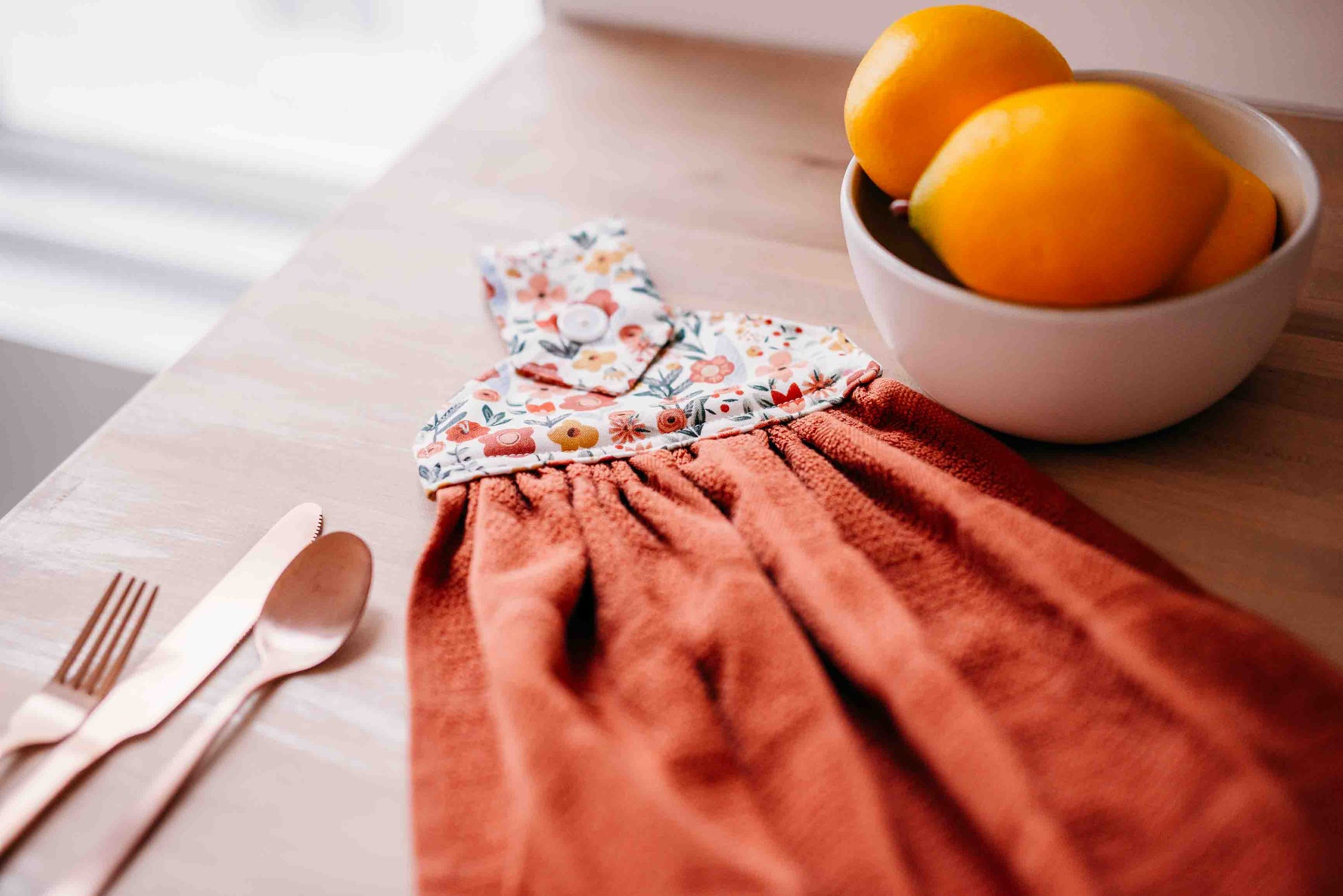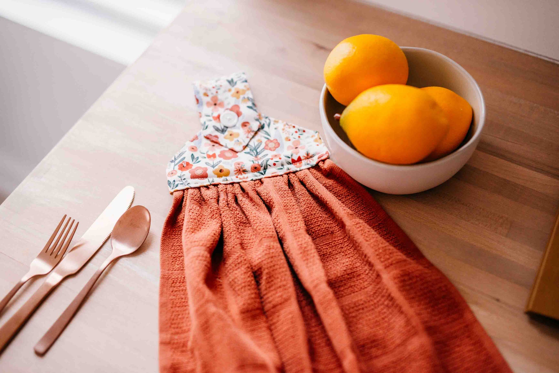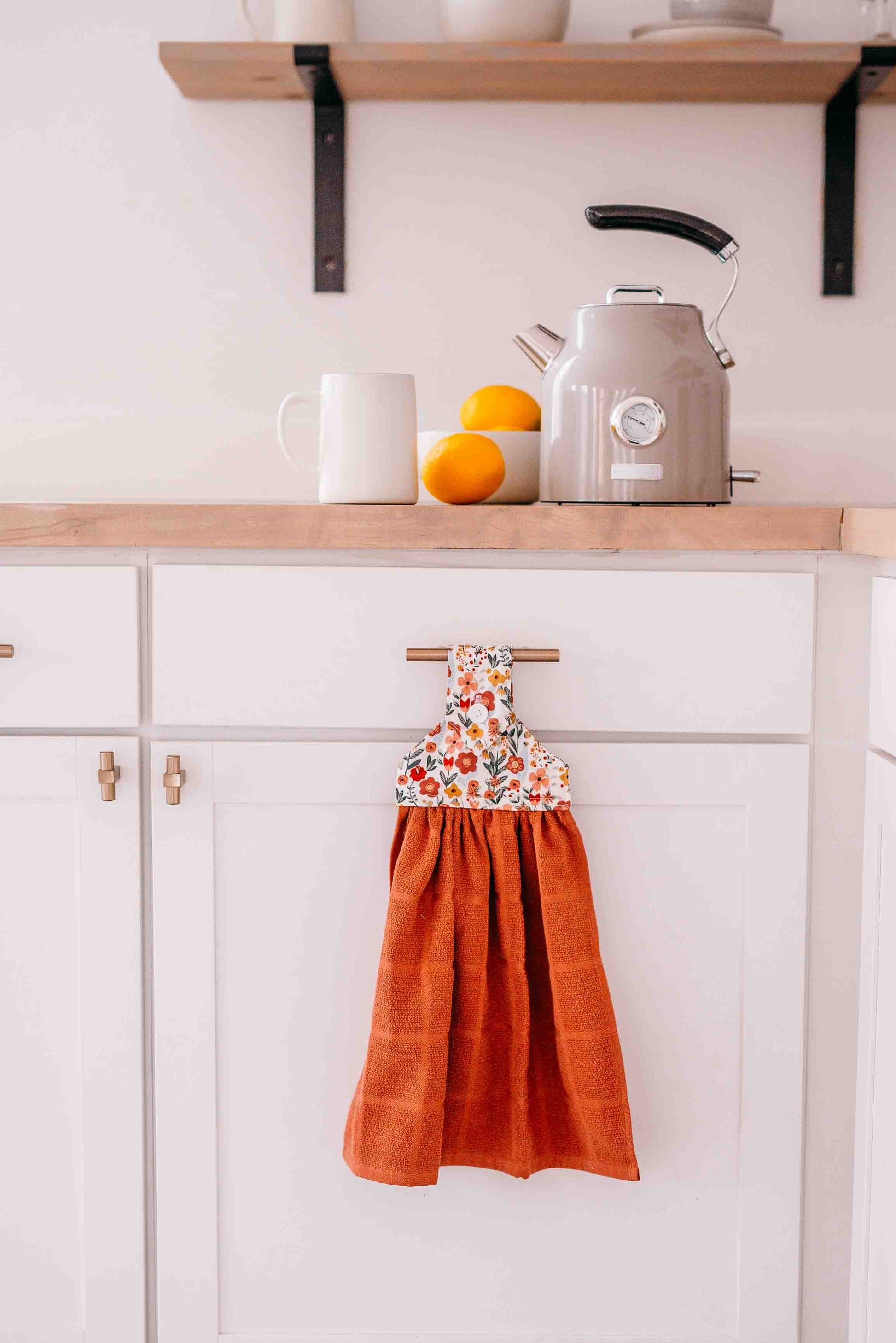 Handmade kitchen hand towel that stays secure with a button and hangs perfectly on an oven handle, dishwasher handle, or towel bar. This towel adds a lovely functional decorative touch to your kitchen. It also makes the perfect housewarming, bridal, or wedding gift. This hanging towel ensures that you always know where your towel is.