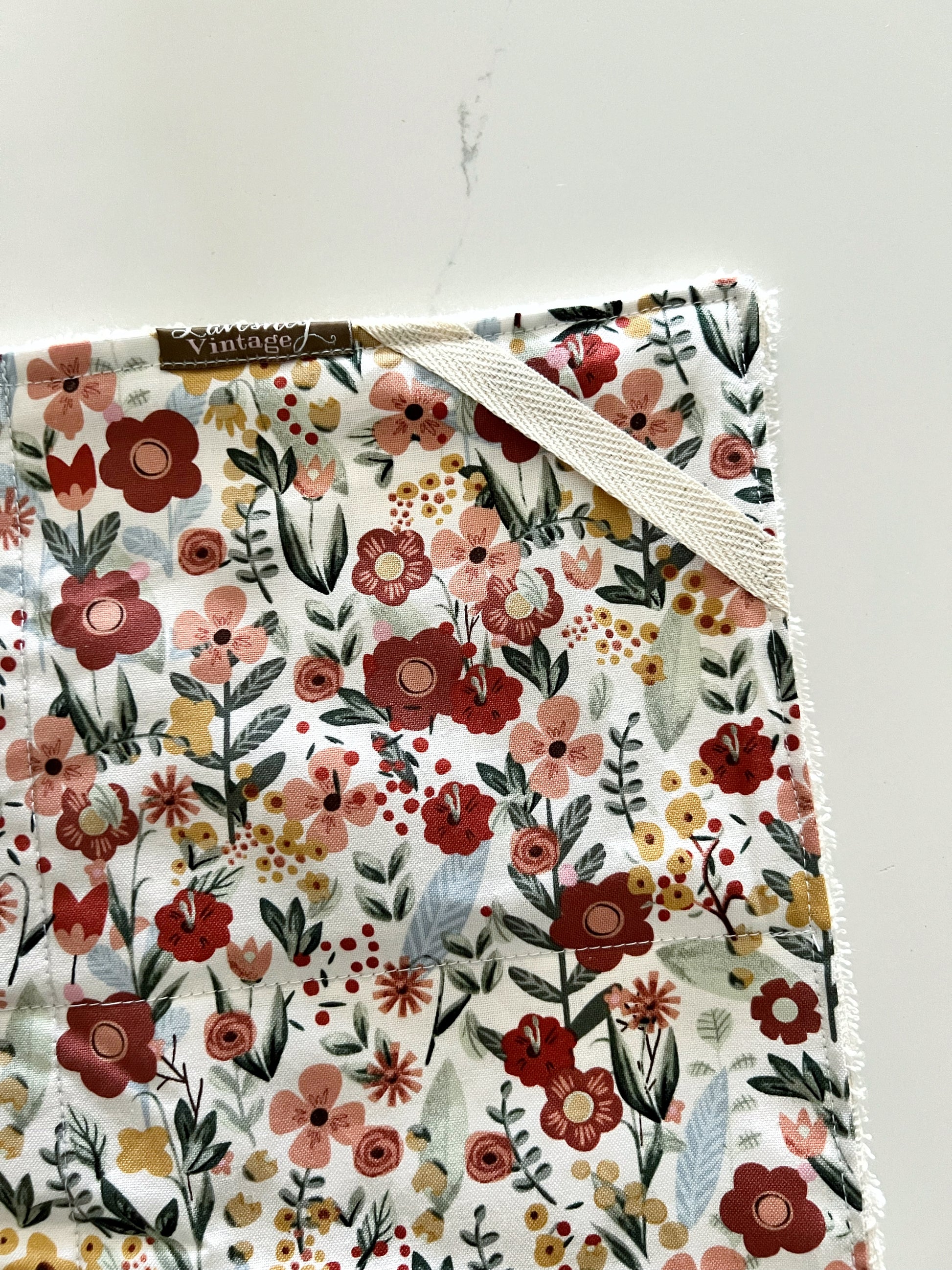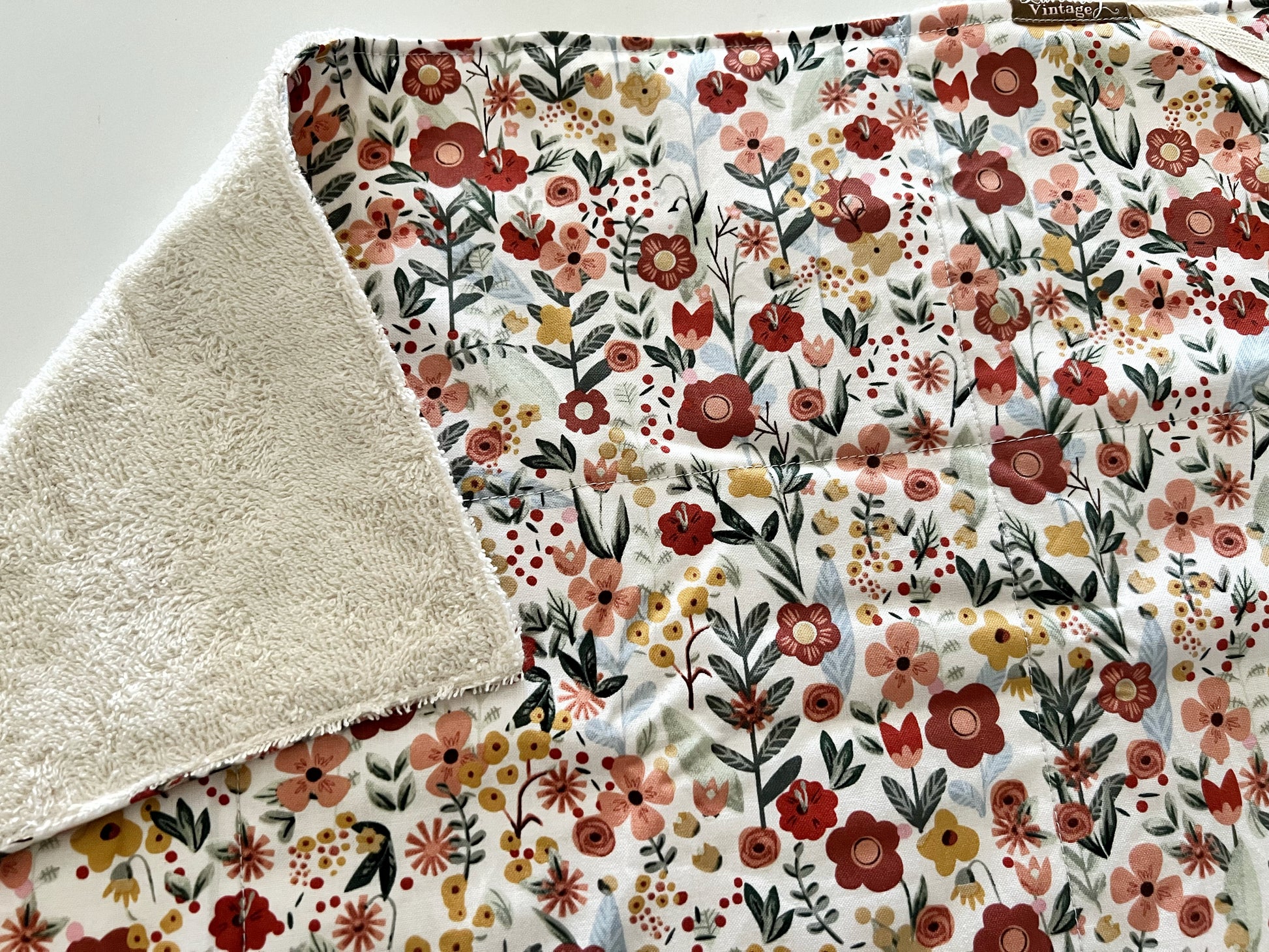 Care instructions: Made with 100% cotton and terry cloth. Wash in cool water with like colors, regular detergent, no bleach, no fabric softener. Tumble dry low or hang to dry. Low heat iron if needed.